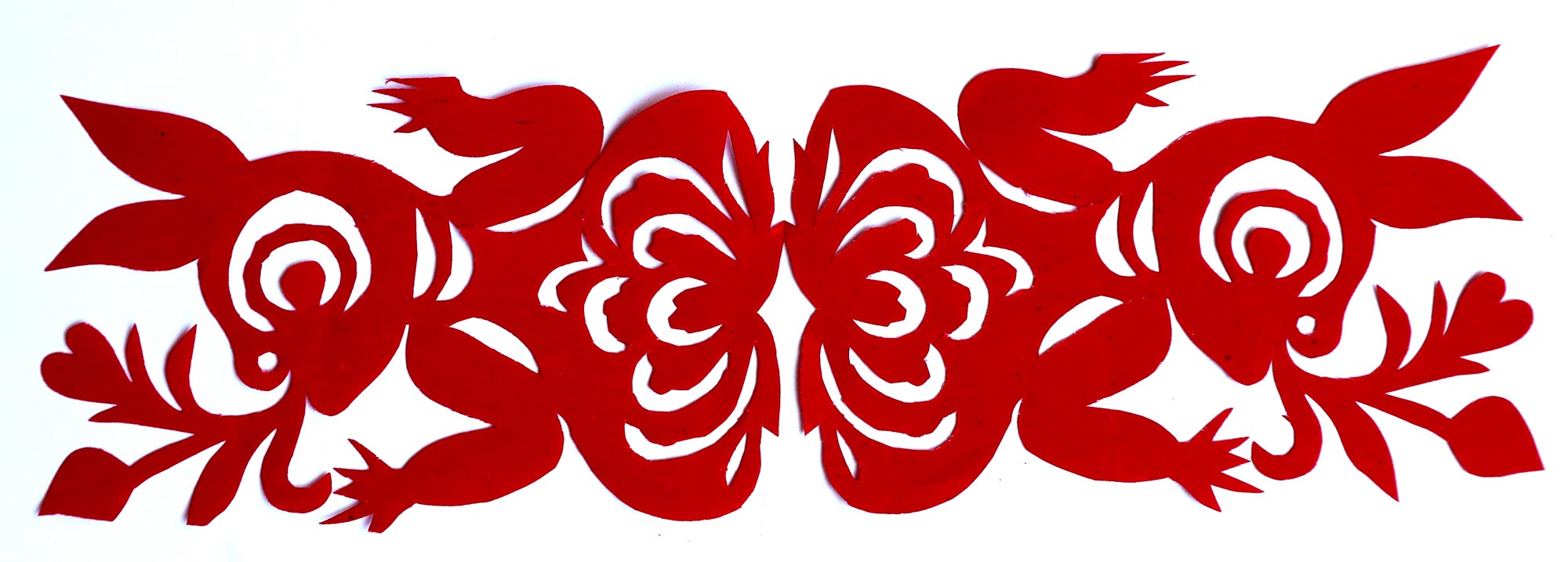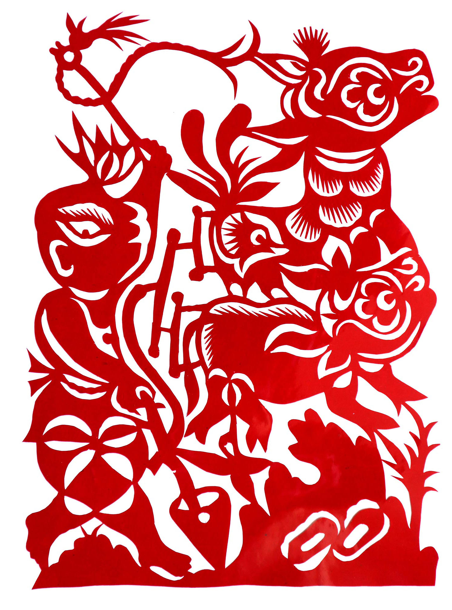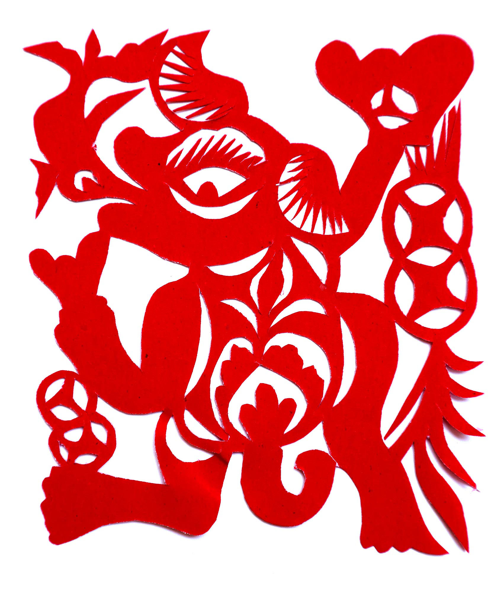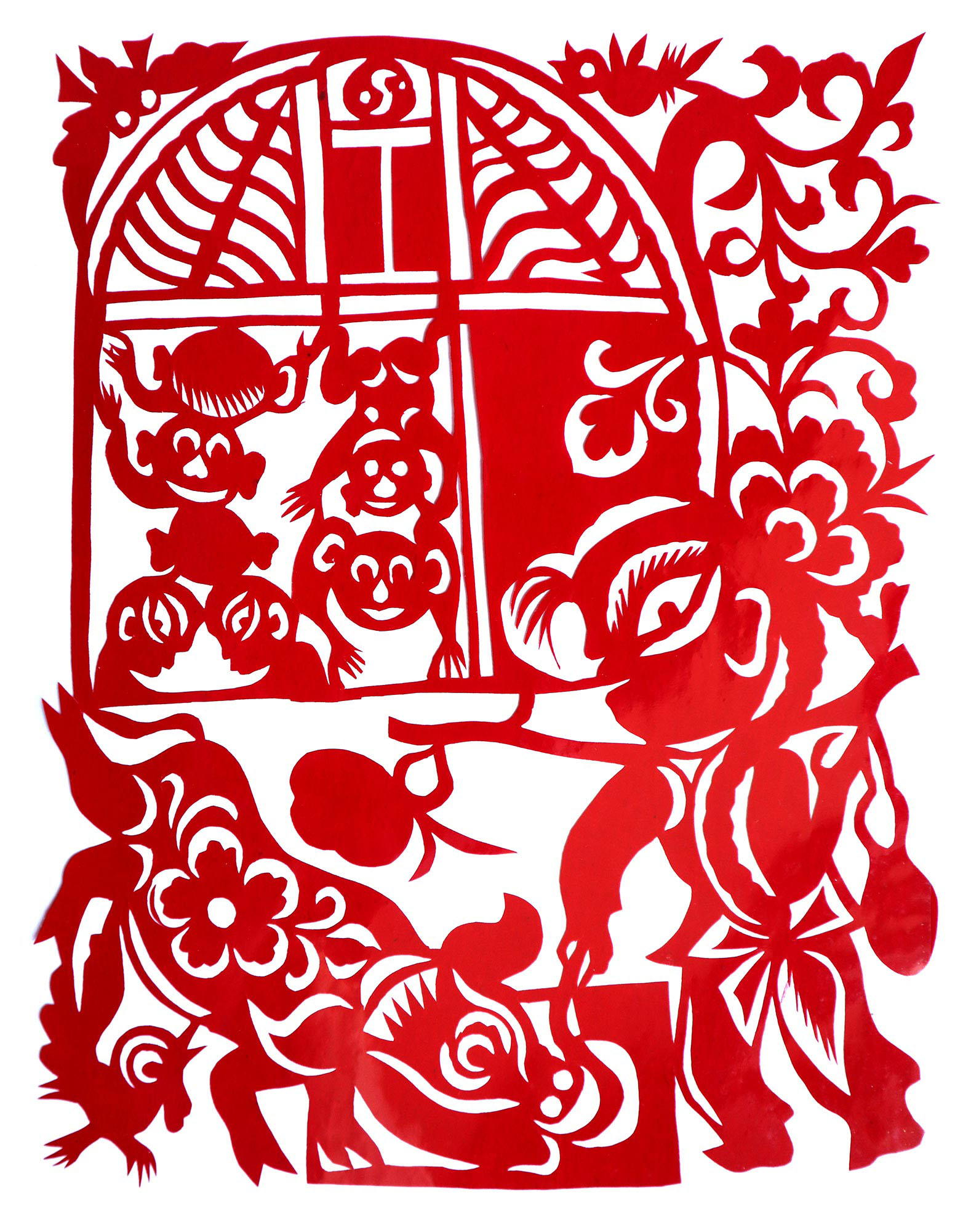 贺彩莲从小见母亲给村里人剪花,就跟上母亲学习。母亲剪花冒剪冒画,她也跟着冒剪冒画。母亲不剪花时,她就拿起剪刀冒剪,从没有拓过样子,小小年纪就学会了剪窗花。村里的女孩子,都来让她给剪花样画花样。上学时特别喜欢画画,经常受到老师的表扬。学剪纸主要从窗花开始,以花鸟动物为主,当时延川农村忌讳剪人物,所以也没有学。1988年,贺彩莲结婚,家里人都支持她剪花、唱歌,特别是婆婆在她剪花时就帮忙做家务,照看孩子。当姑娘时主要是过年剪花,那时没有纸,平常有一点红纸都舍不得用,只能在过年时间用。2001年,靳之林老师来到延川写生,靳老师让她剪了个动物,也启发她剪人物,再靳老师的鼓励下,她的剪纸创作就一直没有停止,创作了《纺织系列》《迎亲系列》《民歌系列》等。后来贺彩莲参加了延川县文化馆的剪纸创作培训班,延安市的剪纸培训班,对她的艺术修养有所提高,更加明确了自己的创作方向和艺术特色的坚持。这些年省市县镇上只要有剪纸活动,每次都参加,不管能不能获奖,她都是平常心。