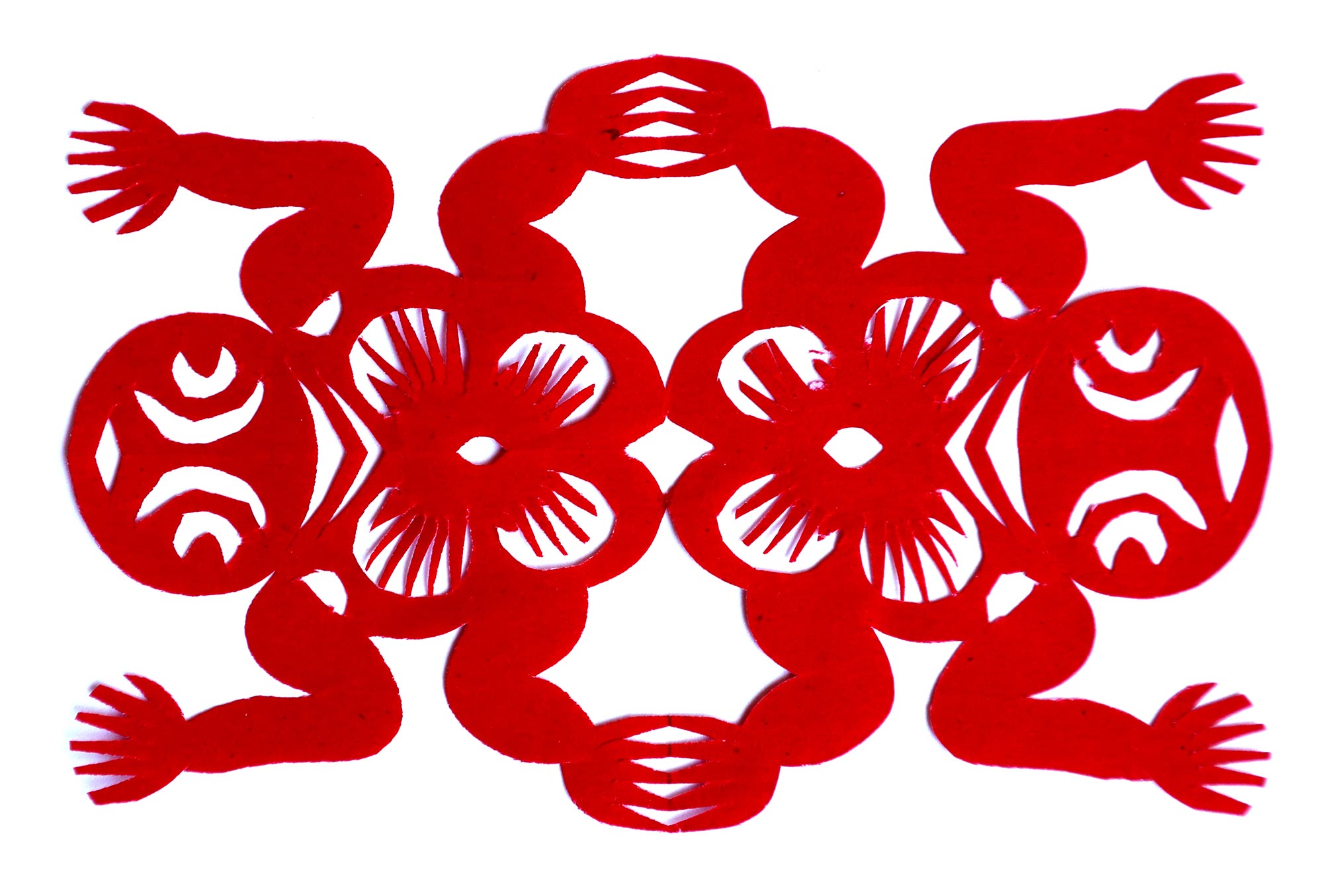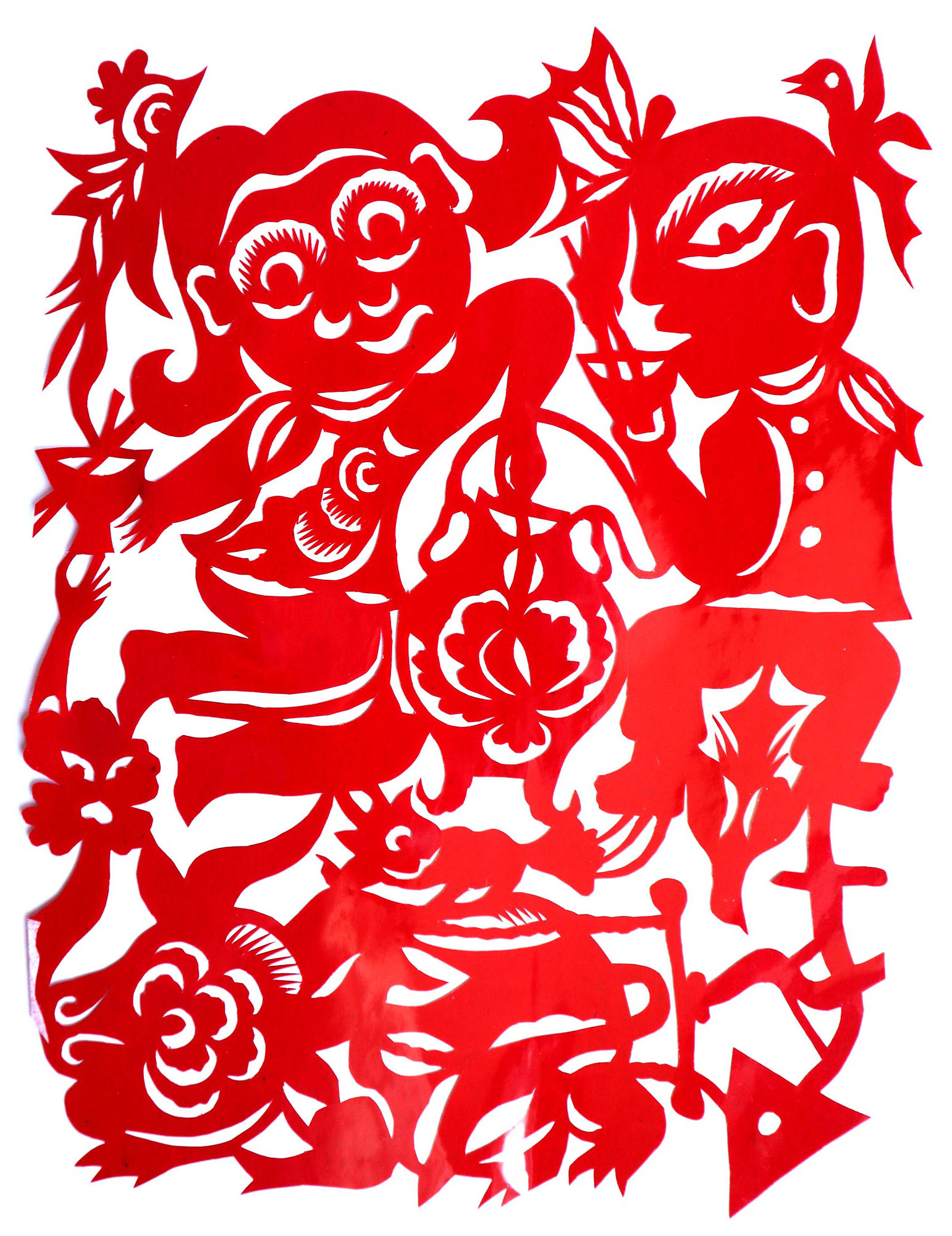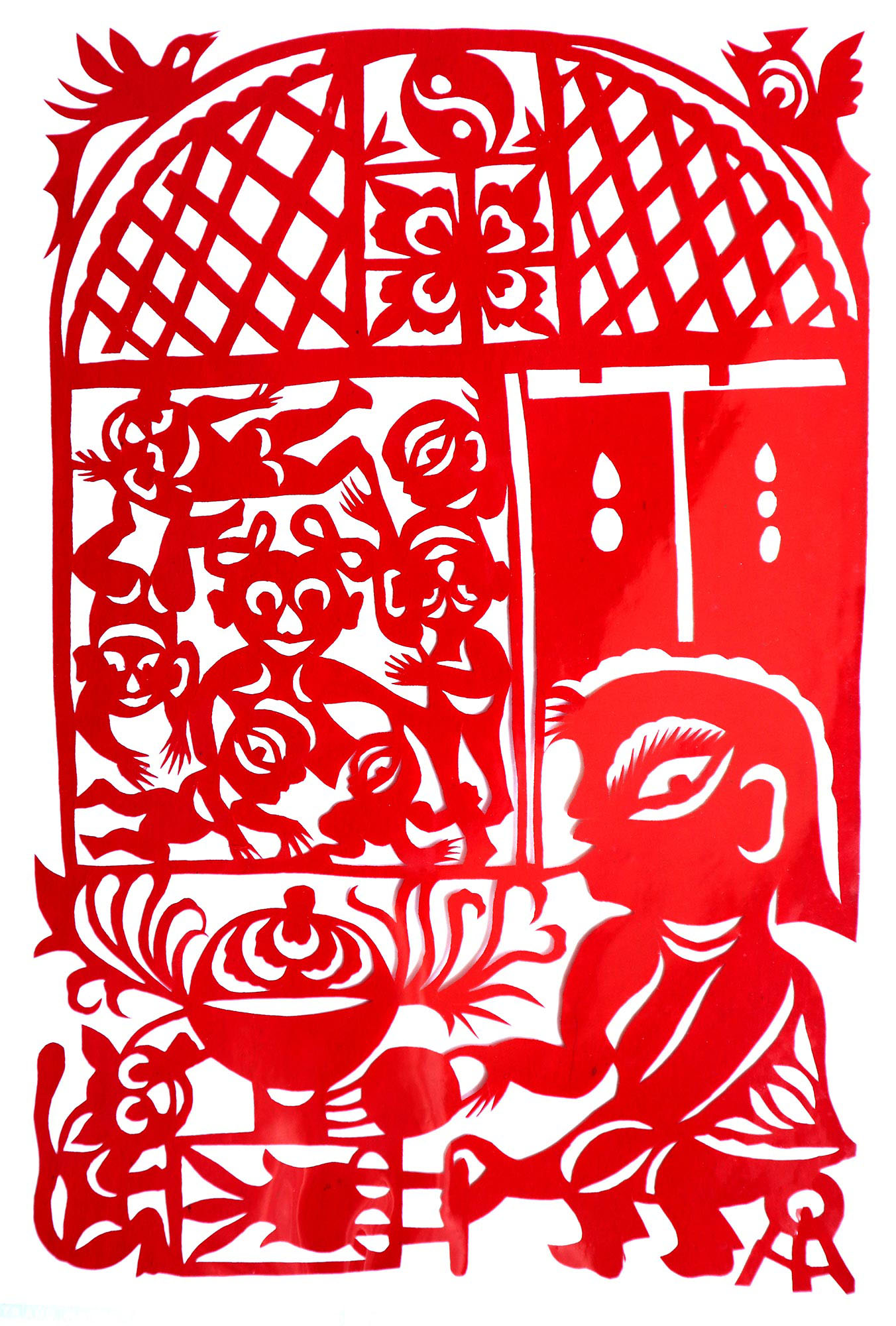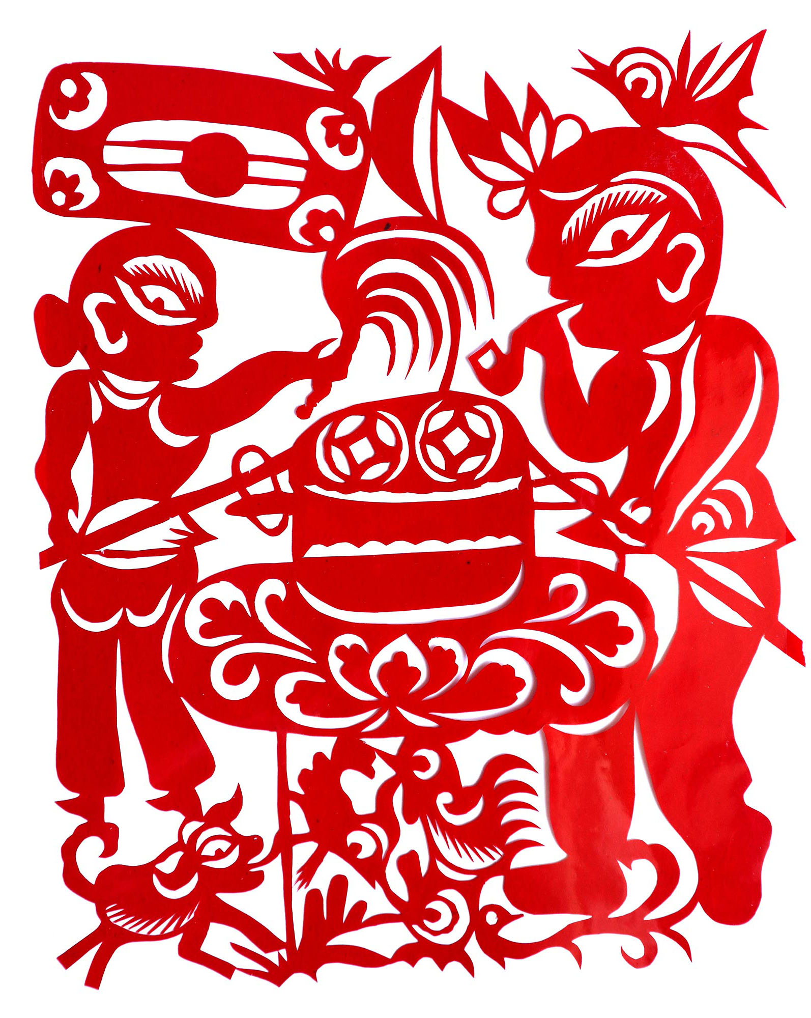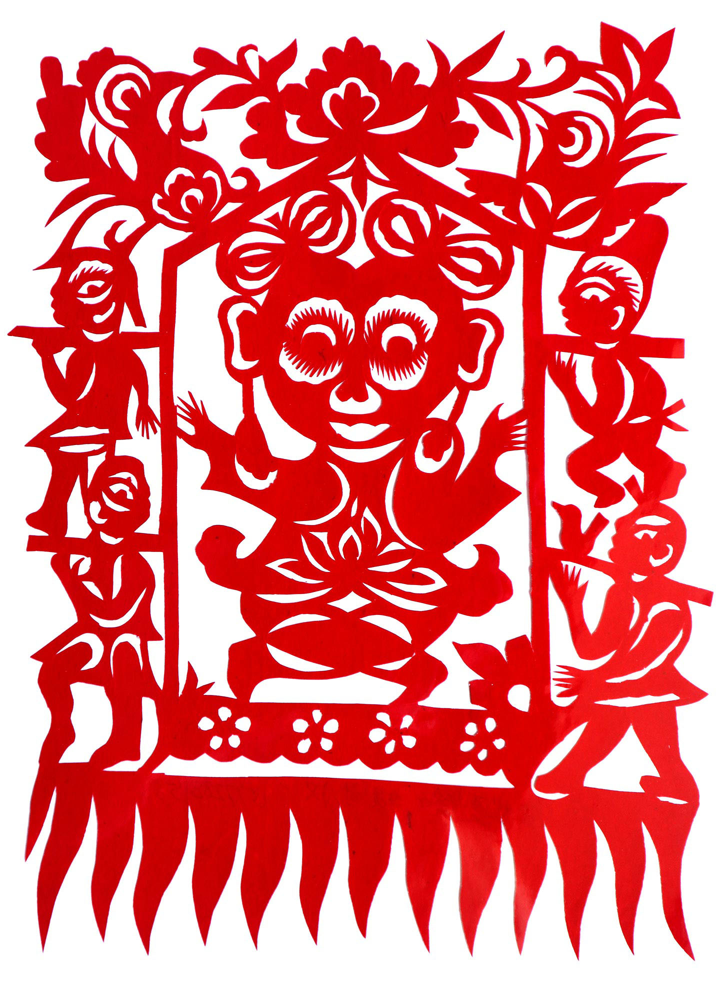 贺彩莲从小见母亲给村里人剪花,就跟上母亲学习。母亲剪花冒剪冒画,她也跟着冒剪冒画。母亲不剪花时,她就拿起剪刀冒剪,从没有拓过样子,小小年纪就学会了剪窗花。村里的女孩子,都来让她给剪花样画花样。上学时特别喜欢画画,经常受到老师的表扬。学剪纸主要从窗花开始,以花鸟动物为主,当时延川农村忌讳剪人物,所以也没有学。1988年,贺彩莲结婚,家里人都支持她剪花、唱歌,特别是婆婆在她剪花时就帮忙做家务,照看孩子。当姑娘时主要是过年剪花,那时没有纸,平常有一点红纸都舍不得用,只能在过年时间用。2001年,靳之林老师来到延川写生,靳老师让她剪了个动物,也启发她剪人物,再靳老师的鼓励下,她的剪纸创作就一直没有停止,创作了《纺织系列》《迎亲系列》《民歌系列》等。后来贺彩莲参加了延川县文化馆的剪纸创作培训班,延安市的剪纸培训班,对她的艺术修养有所提高,更加明确了自己的创作方向和艺术特色的坚持。这些年省市县镇上只要有剪纸活动,每次都参加,不管能不能获奖,她都是平常心。
