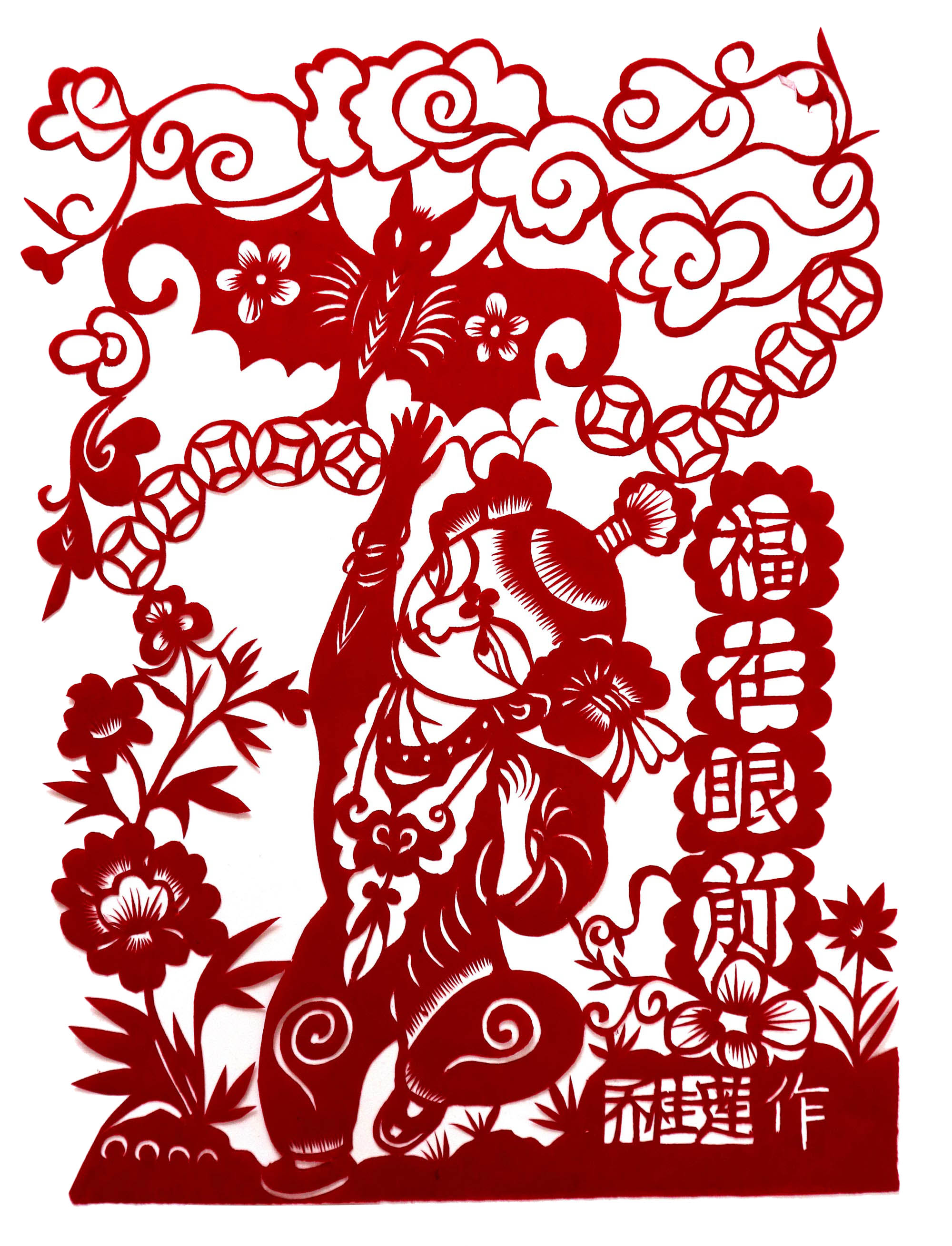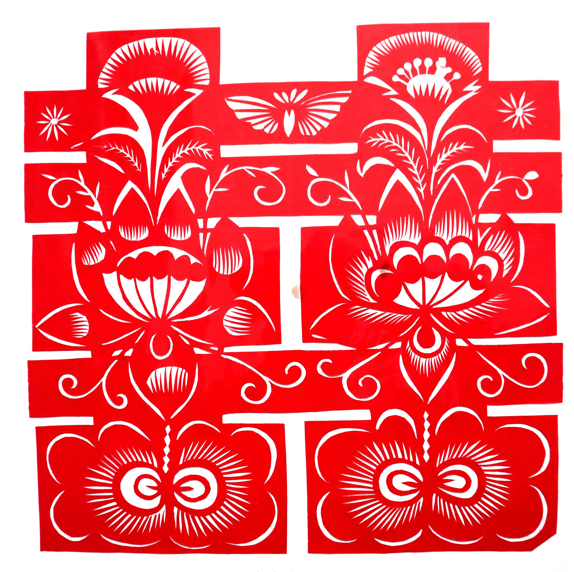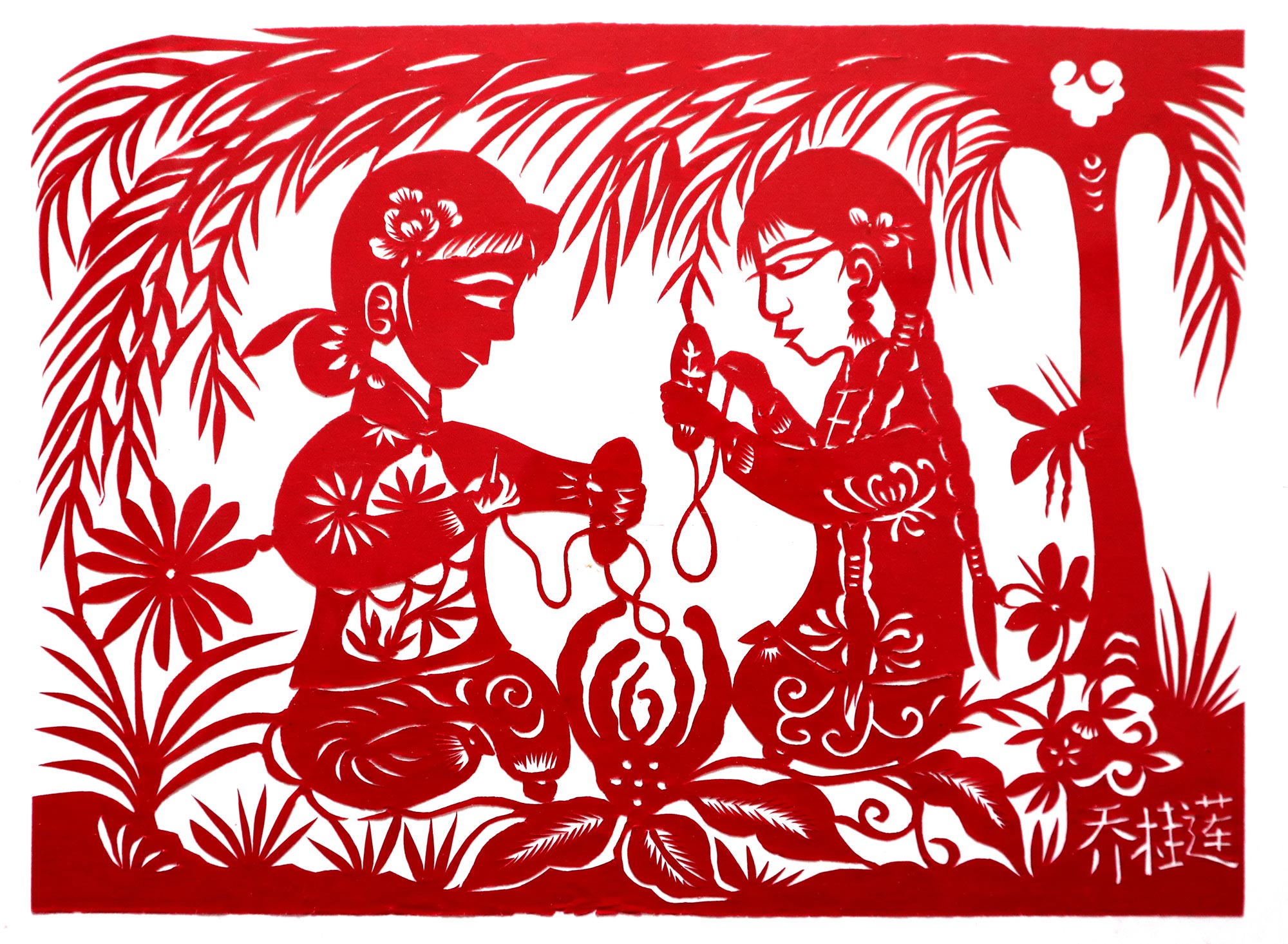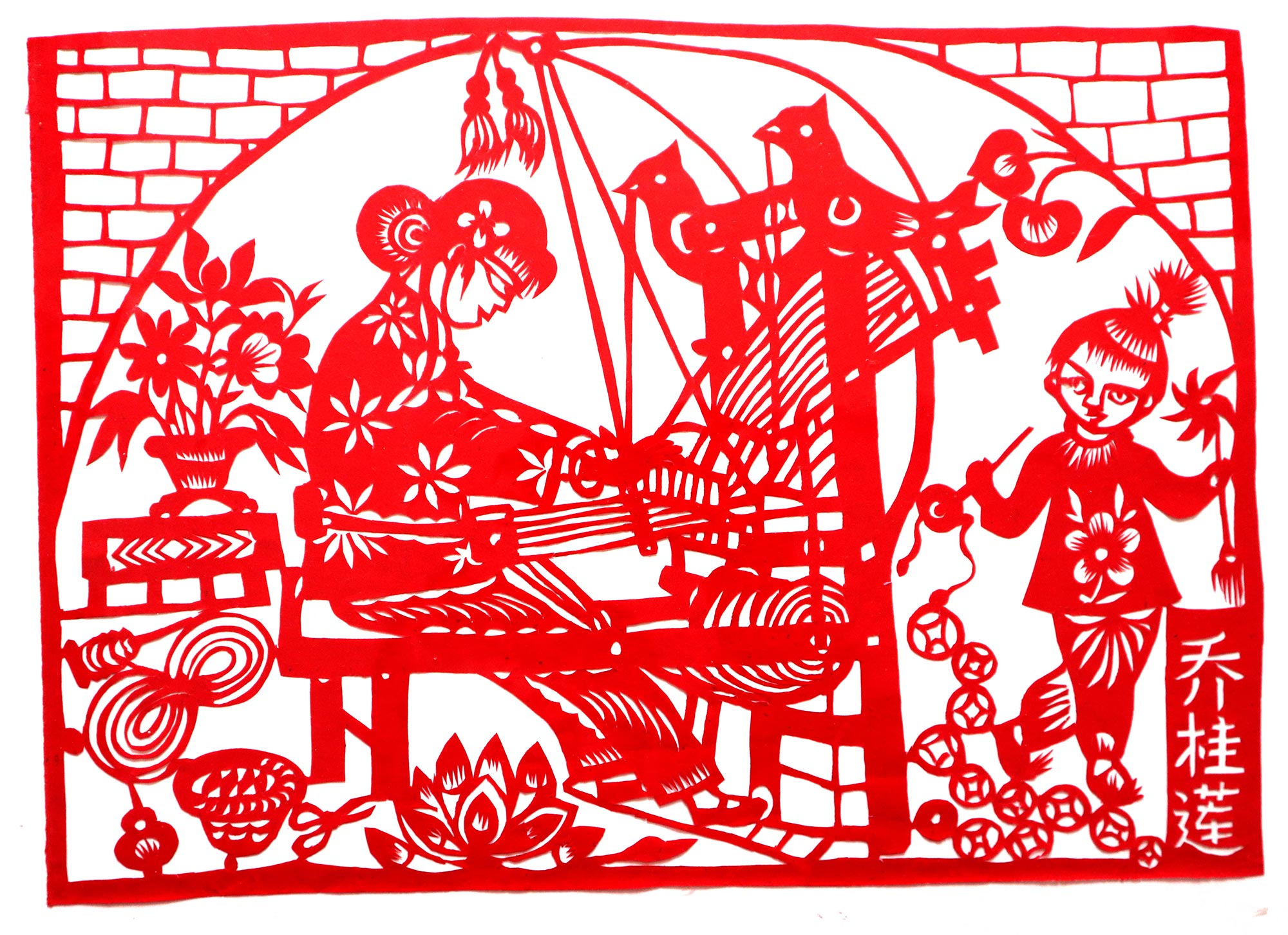 乔桂莲11岁开始做鞋垫,父亲给她在鞋垫上画个花样子,她就绣成了,从此就爱上了画花,也爱上了剪纸。小时候母亲给她熏些窗花样子,让拓着样子剪,样子都是传统的老虎、狮子、花草。拓样子剪窗花一直到初中。家里每年都要贴窗花,窗花大多是她拓样子剪出来的。2000年后,延长县文化馆馆长康惠让她参加西安的经洽会,要她冒剪,从这年起她才开始大胆的冒剪。父亲喜爱书法、绘画,常教她画画,父亲也爱剪纸,也剪一点小窗花。母亲也喜欢剪纸,母亲剪窗花时她就跟着剪。剪窗花多在腊月天,那时学校放寒假,冬天也没有农活,就坐在炕上开始剪窗花。