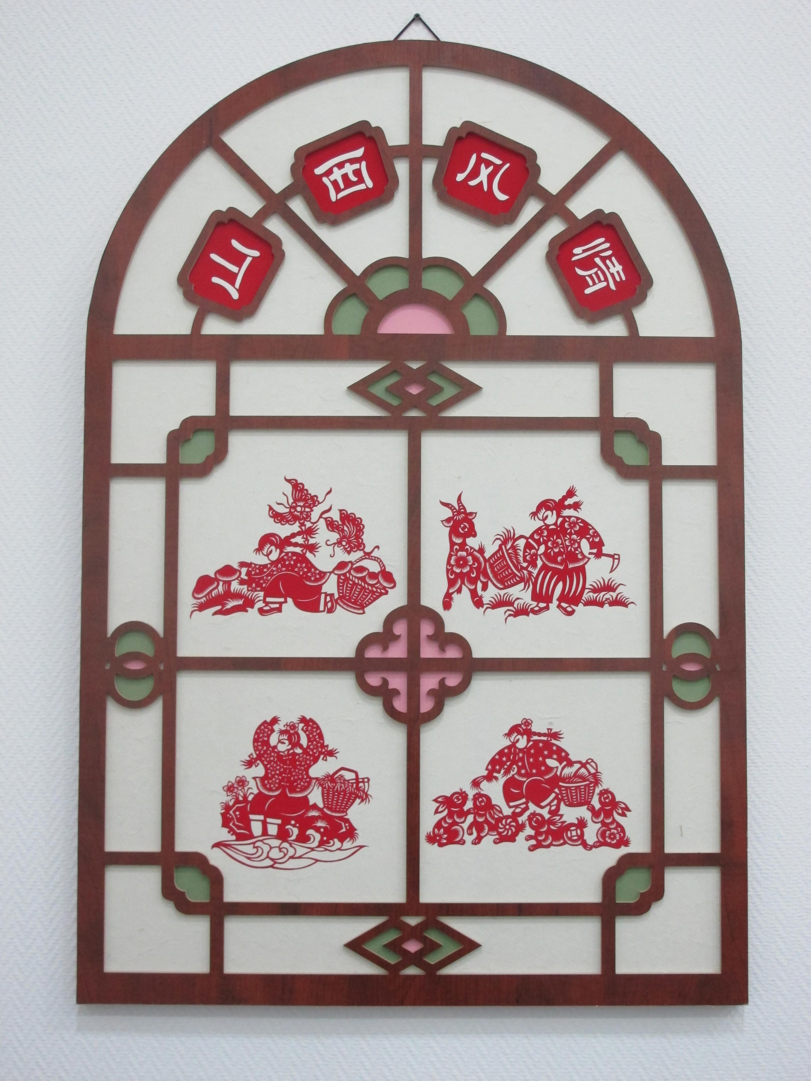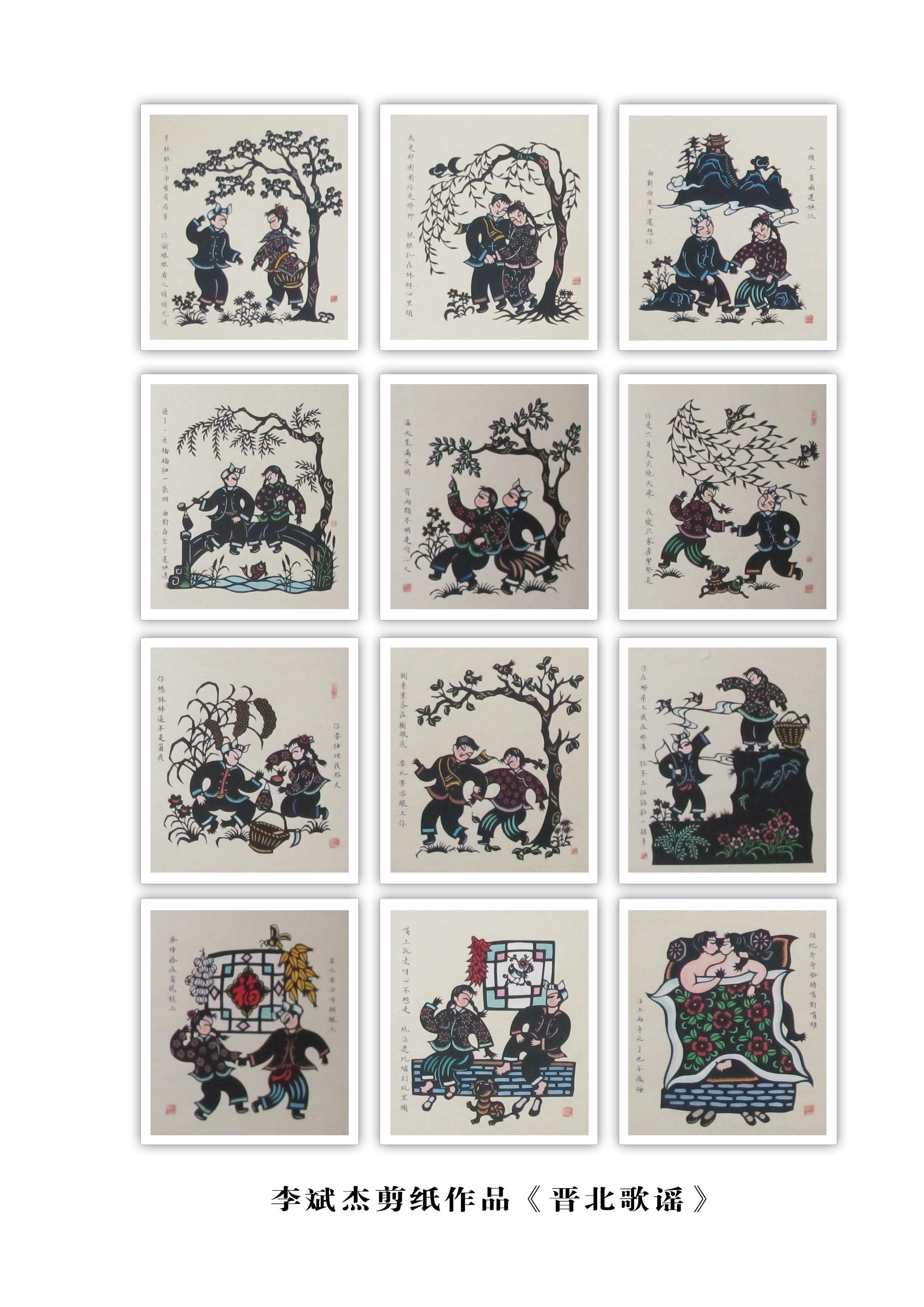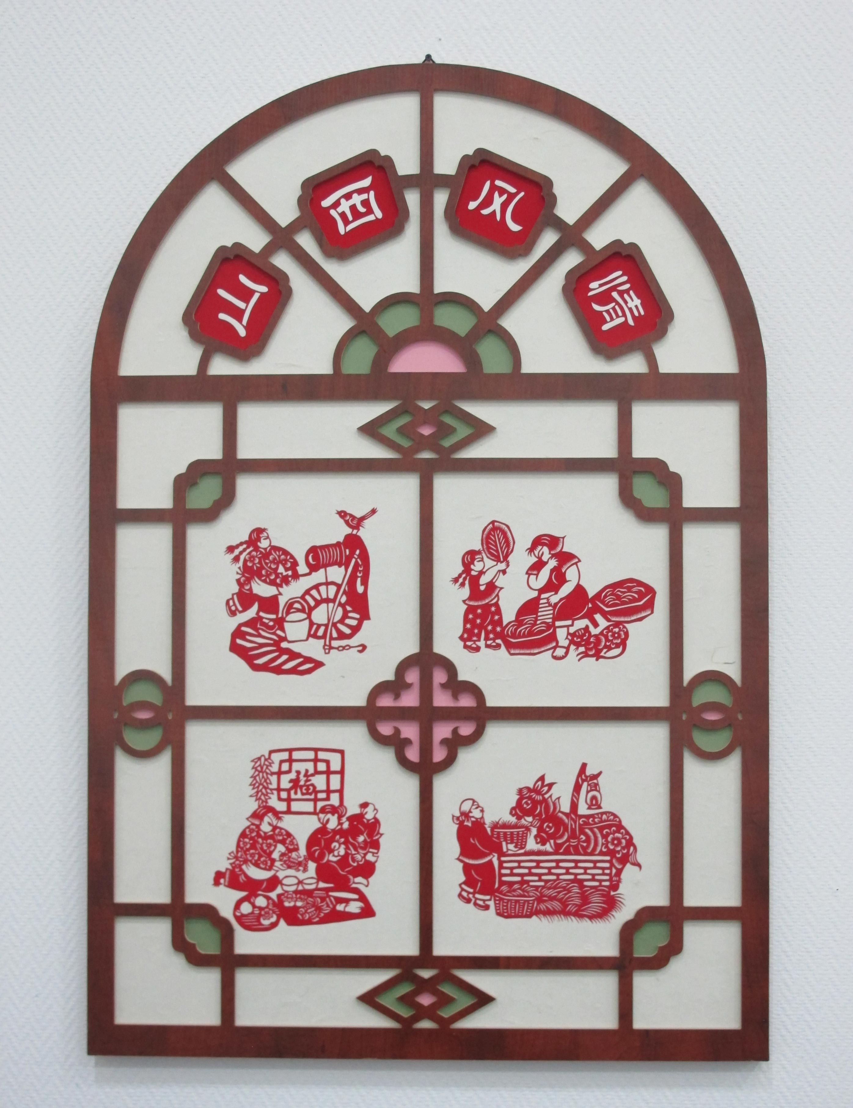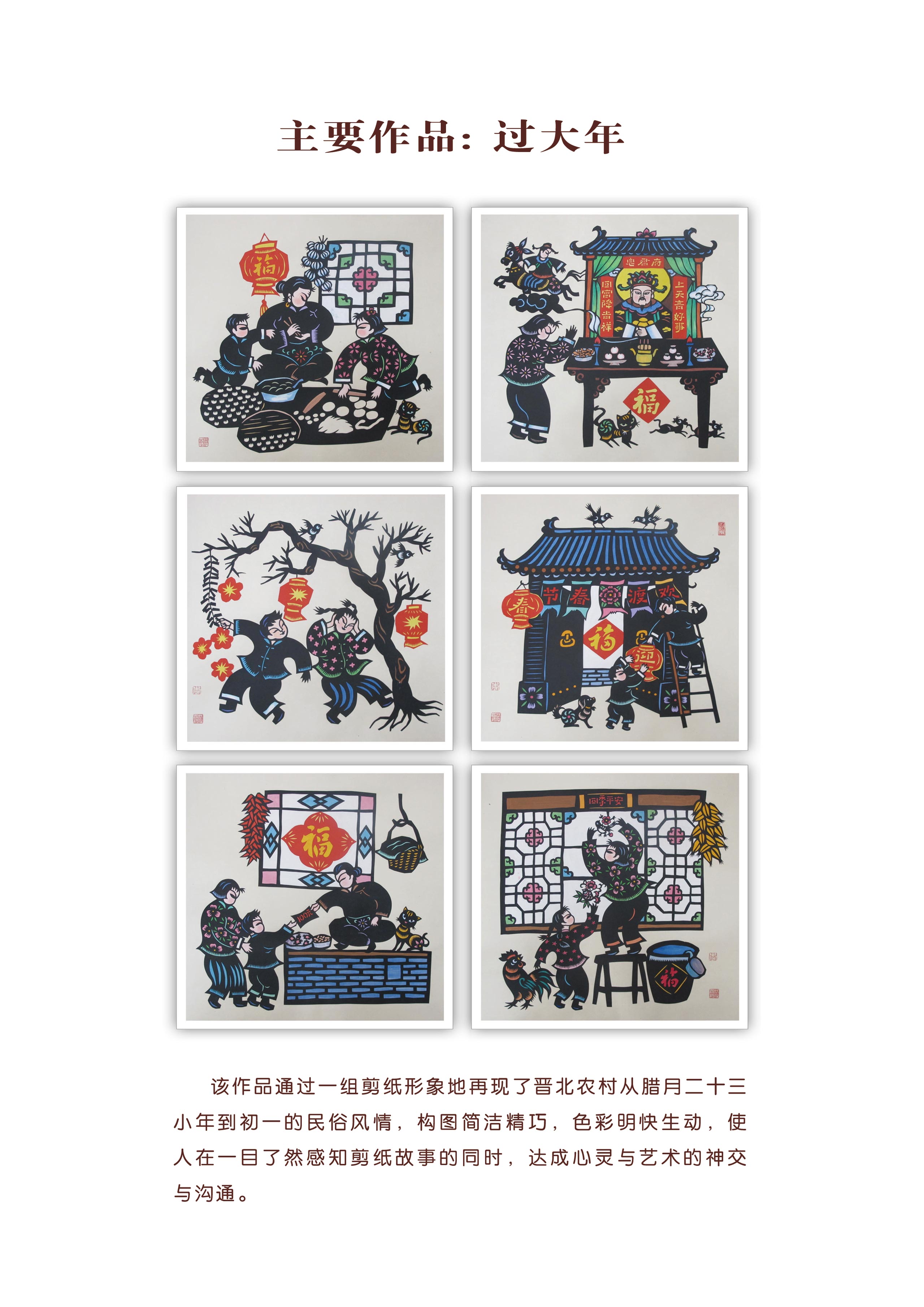 突出艺术特色:作品颇具山西民俗风情特色,题材新颖独特,常用夸张的剪纸语言表达当地的民俗民风,作品中蕴含着奔放、热情的情调和韵味。