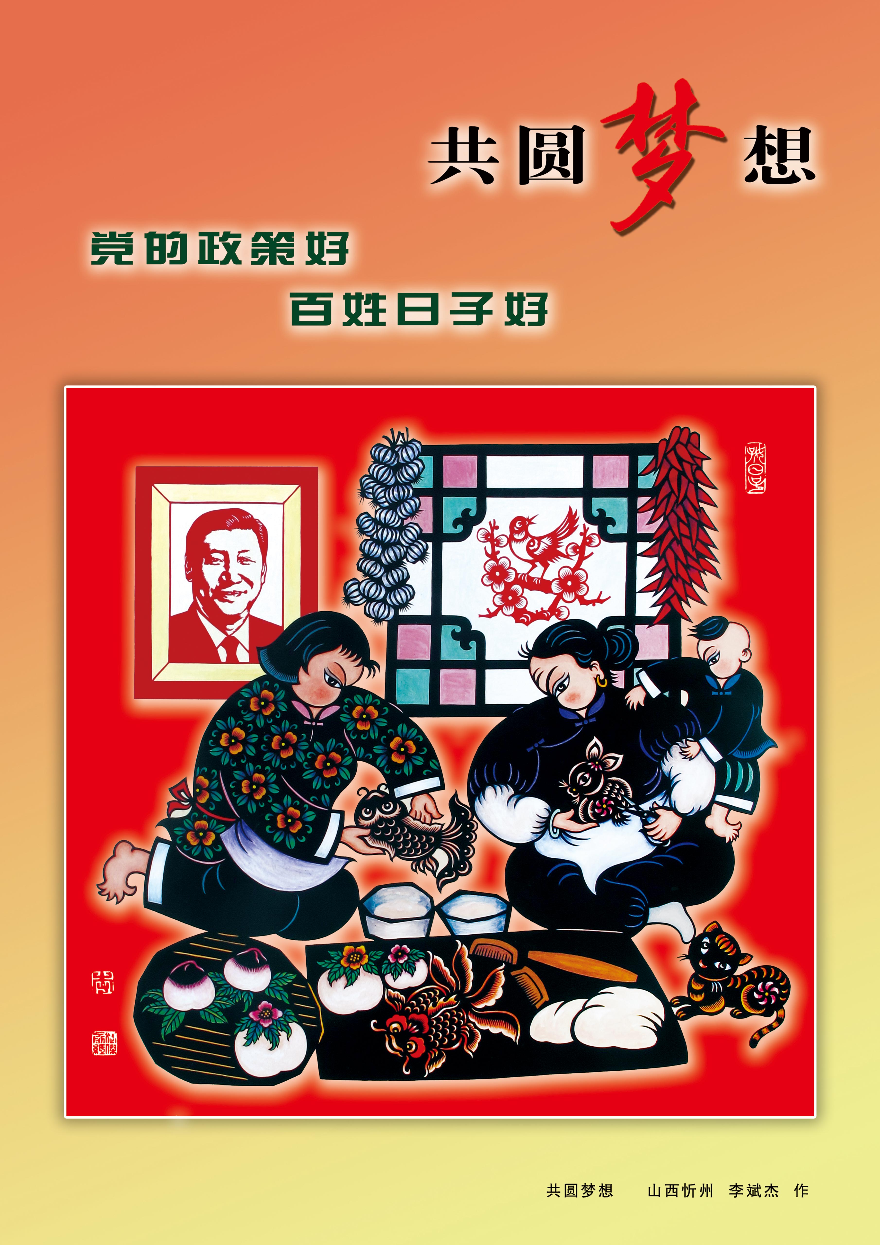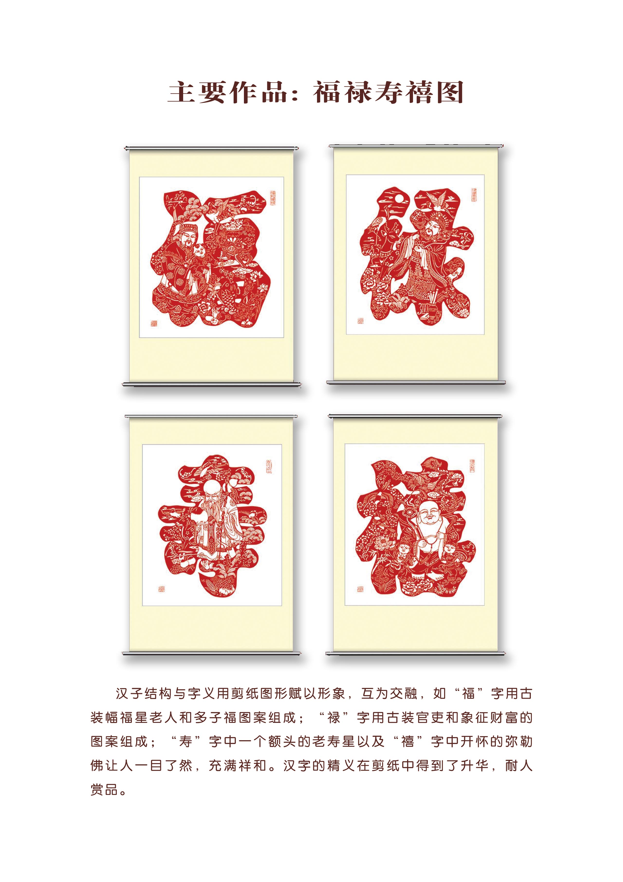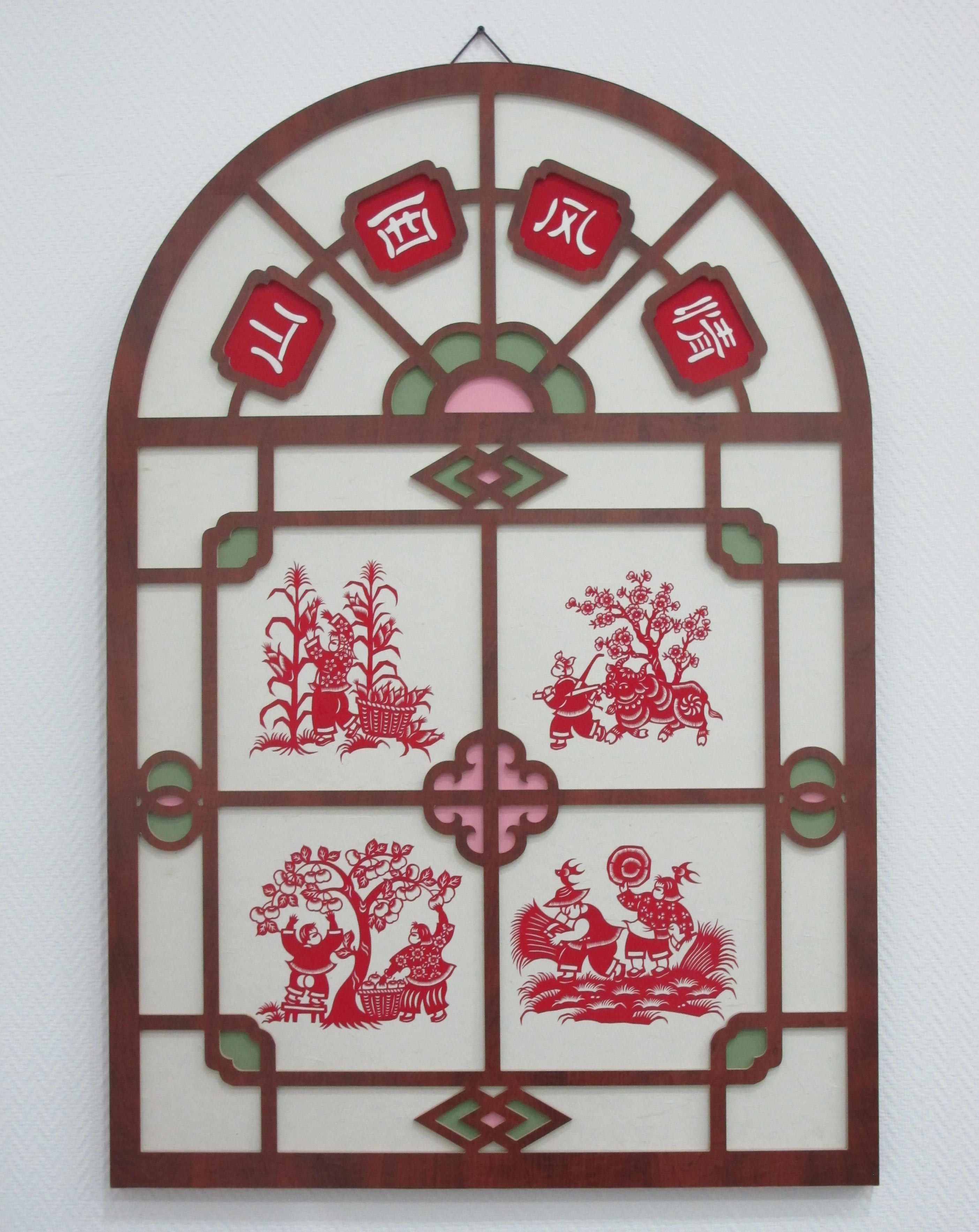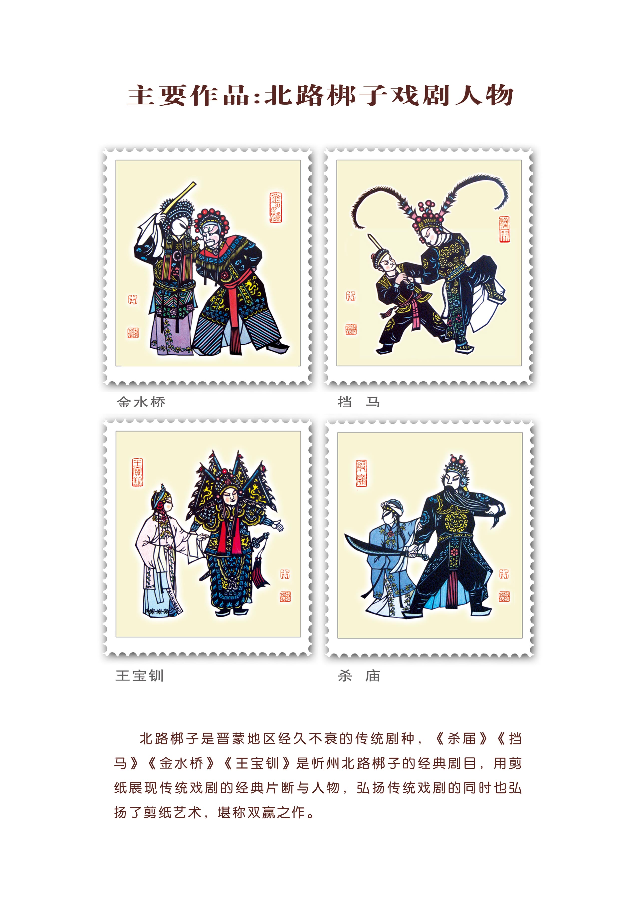 突出艺术特色:作品颇具山西民俗风情特色,题材新颖独特,常用夸张的剪纸语言表达当地的民俗民风,作品中蕴含着奔放、热情的情调和韵味。