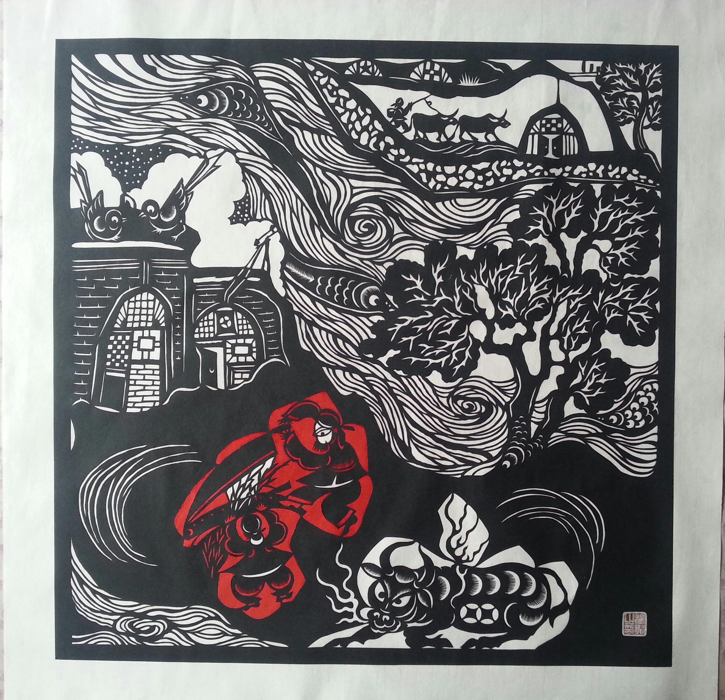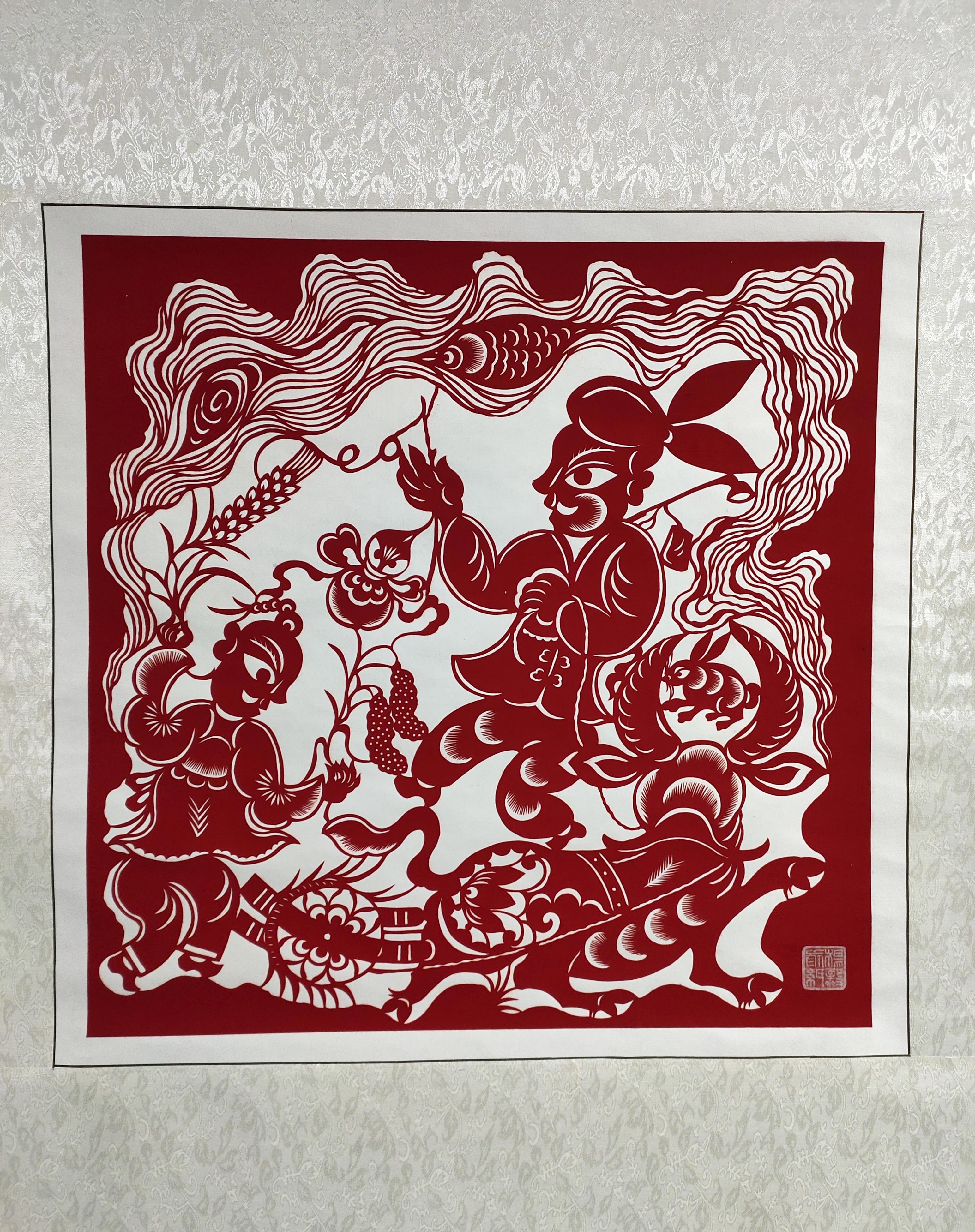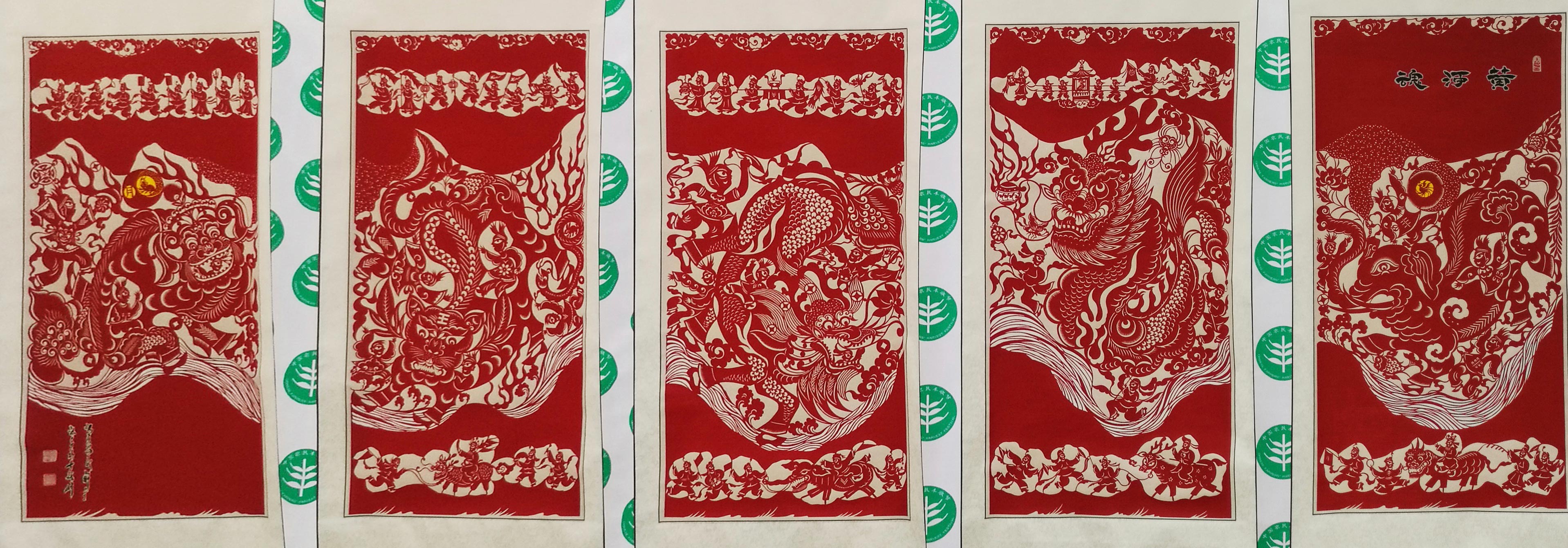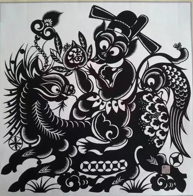 突出艺术特色:其作品质朴醇厚、细腻独特、夸张传神,他在广泛吸收姊妹艺术之长,丰富自己的创新思维,形成了其剪纸艺术深厚的地域文化内涵和独特的表现形式。有形的剪纸浓缩了无形的民俗文化