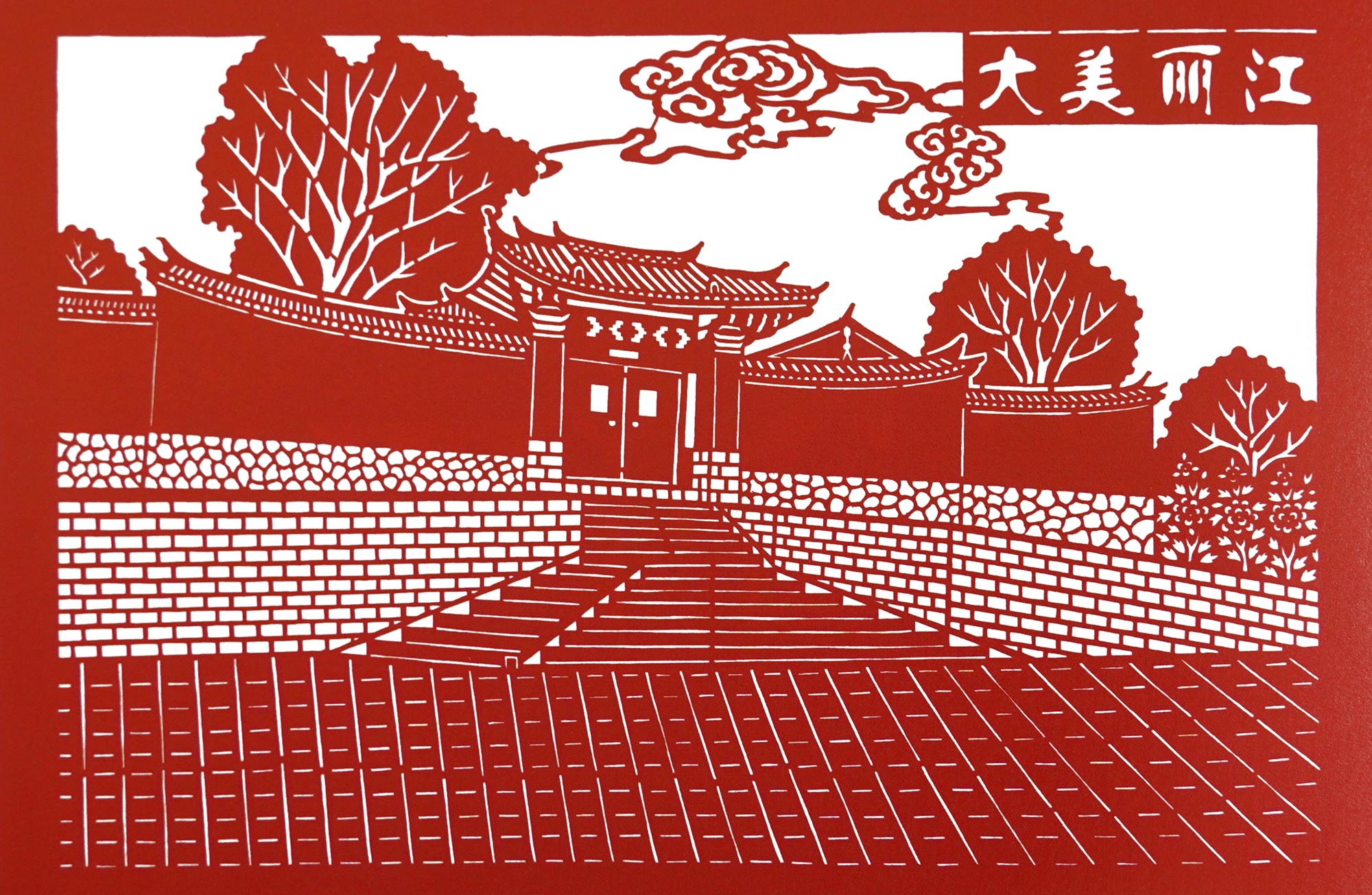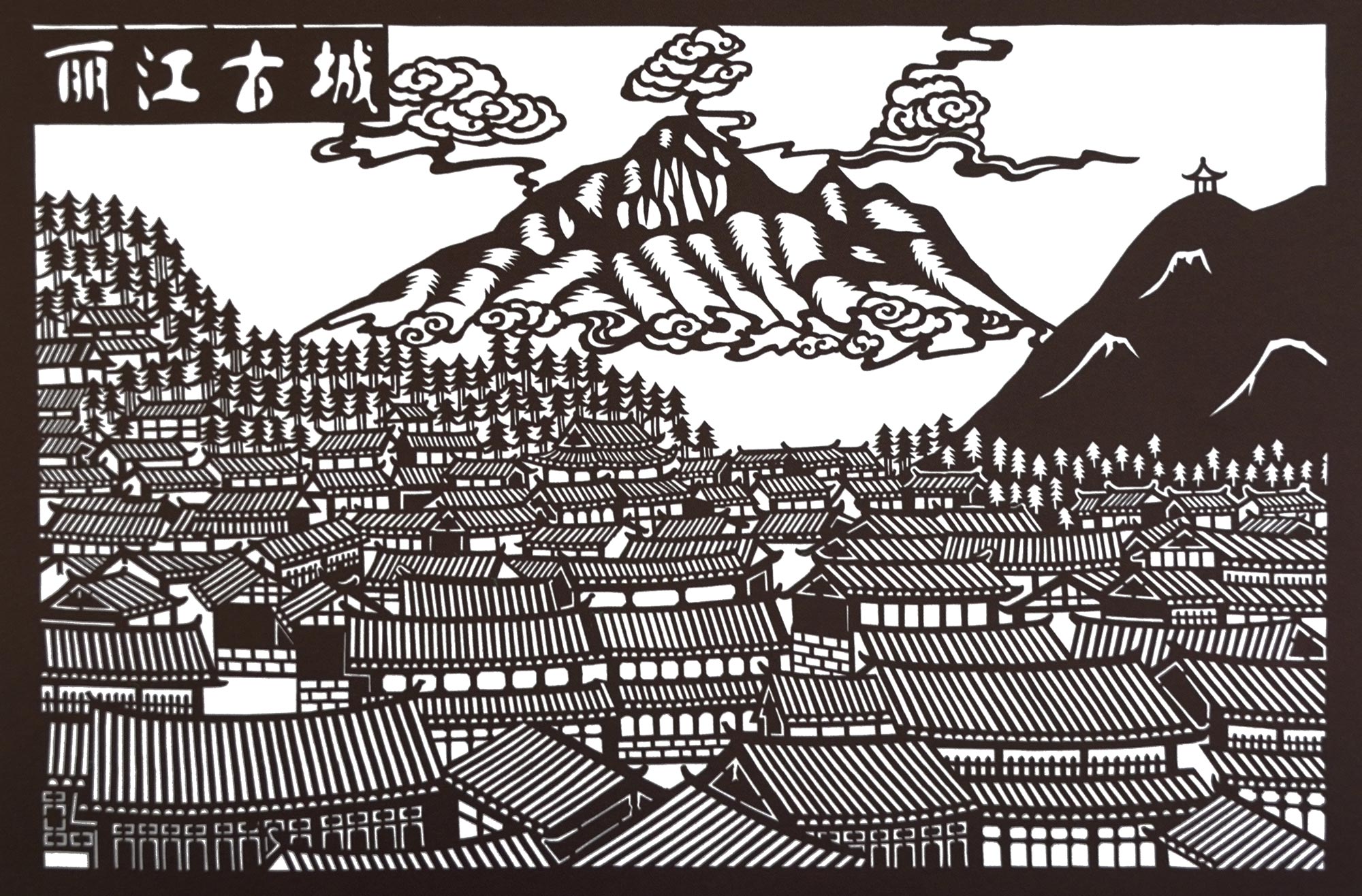 习甸居住着的是明洪武年间从中原一带来这里屯居的军民,所以一直延续着中原汉民族的文化与习俗。严以智所在的村子有位绣娘,很会剪绣花底样,他打小就耳闻目睹,加之他的家乡十分注重操办红白事。红事除了张贴红红的对联,还要剪一些如喜鹊登梅、荷花鸳鸯之类的窗花增添喜庆氛围。姑娘出嫁时,娘家陪嫁的礼物中少不了一对“依饭碗”,碗内放枣子、瓜子,寓意早生贵子,碗口要剪圆形的喜花来封口,既美观又防止碗内的东西撒出来。目睹了这些,他细心琢磨后,便有模有样地剪了出来,并得到村民的喜欢,于是乡邻办事总少不了他的剪纸,新房的布置也成为他展示剪纸手艺的地方。1992 年,严以智考入丽江师范民师班进修,翌年因为他会缝纫和剪纸而得到留校工作的机会。可以说剪纸改变了他的命运。2011 年 5 月严以智退休后,在去丽江古城游玩时经常看到许多艺术家在画古城,他想自己生活的丽江,自然风光优美,人文景观独特,东巴文化独有,于是便有了用剪纸艺术展现身边文化遗产的想法。之后,他陆续创作出了丽江风光、东巴文化、纳西风情等系列作品。这些作品面世后,深受好评,丽江广播电视台多次对他进行采访报道,多个微信平台也转载报道,还上了“学习强国”“七彩云端”“都市条形码”等栏目。