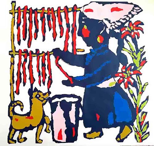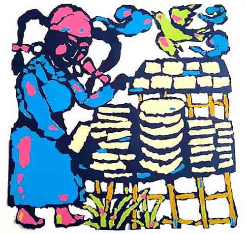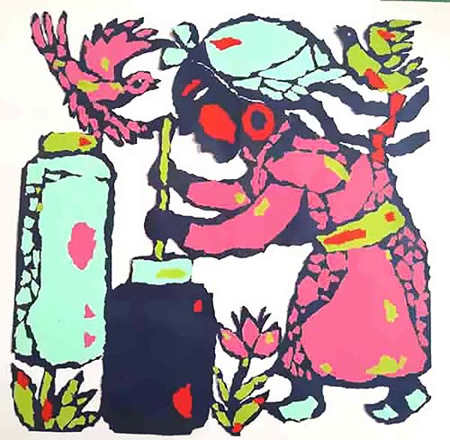 萨仁,女,1967年生,蒙古族,母亲是当地远近闻名的剪花、绣花能手,受母亲的影响自幼酷爱美术,从师著名版画家照日格图、张怀清老师学习美术,1986年考入内蒙古师范大学美术系,开始跟随蒙古族著名学者、著名剪纸艺术家、内蒙古师范大学教授阿木尔巴图学习剪纸。2006年参加中央美院主办的首届非物质文化保护与传承培训班,接受名师指教。