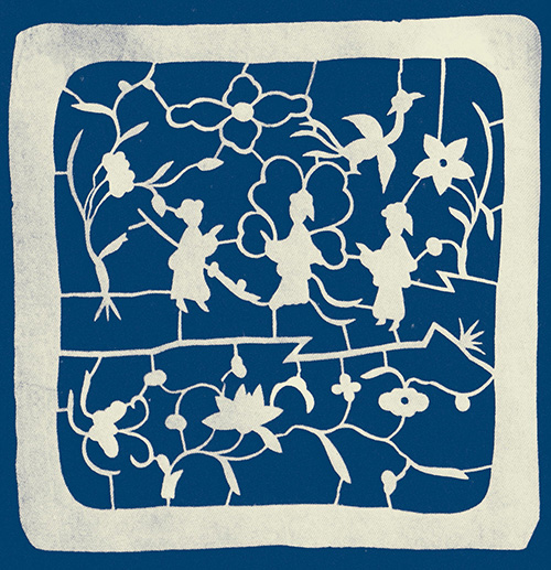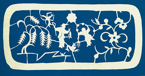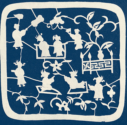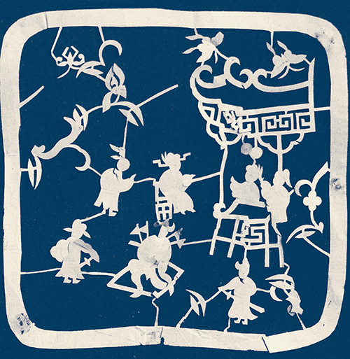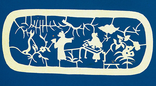其人物造型概括洗练、神态毕肖;联结人物的楼台亭廊与花草枝蔓穿插自然、活泼秀丽,起到了烘托主体形象的作用。她的古装人物枕顶花和帽花目前已极少见,后人未见传承,留下几幅原作可谓硕果仅存,成为踏虎凿花的珍品。