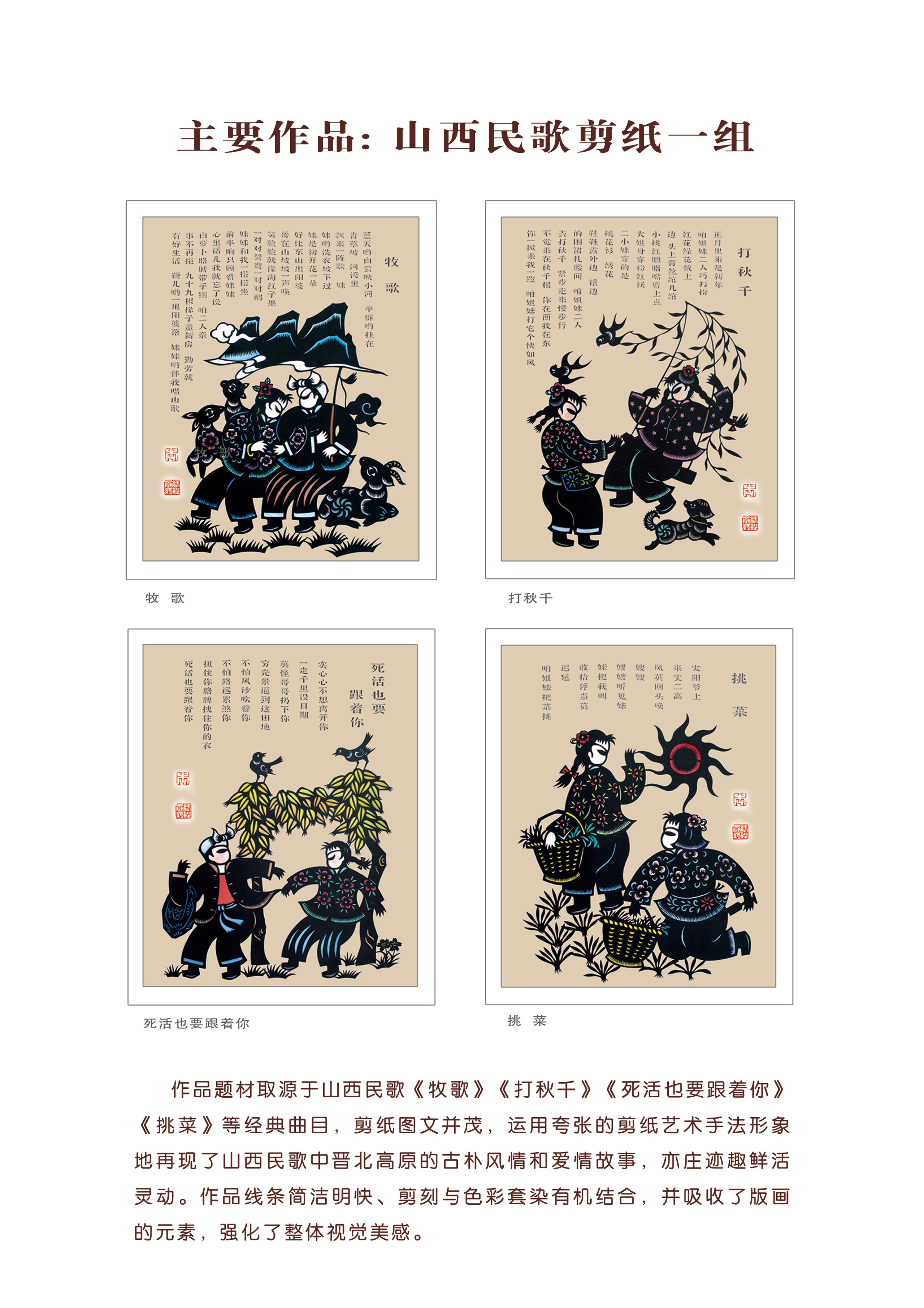 剪纸作品多次参加全国性大展屡屡获奖,多幅作品获“百花杯奖”“金凤凰奖”“百花奖”“金剪刀奖”“金奖”等全国性奖项。曾获第八届中国民间文艺“山花奖”;获神州风韵全国剪纸展“十大神剪”。作品《中华瓶》《福禄寿喜》《晋北歌谣》分别获得联合国教科文组织世界手工艺徽章。代表作品有《黄土风情系列》《山西民歌系列》《五百罗汉》《忻州二人台》《忻州北路梆子》等作品。