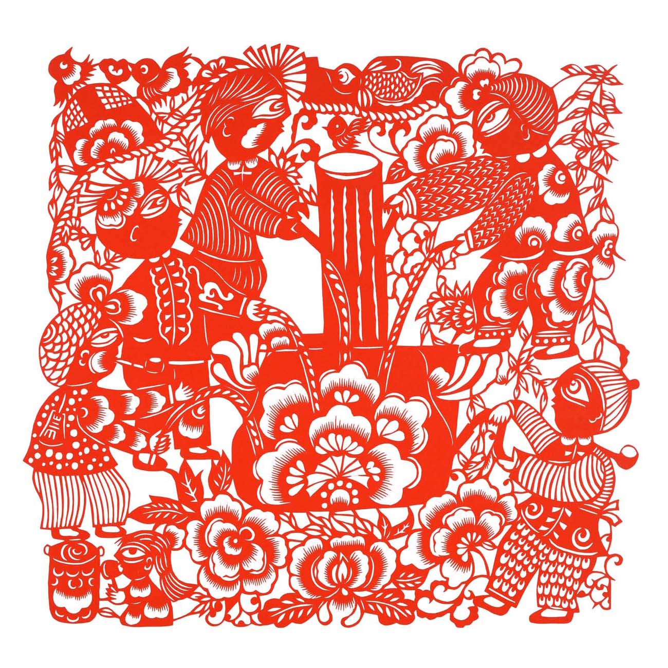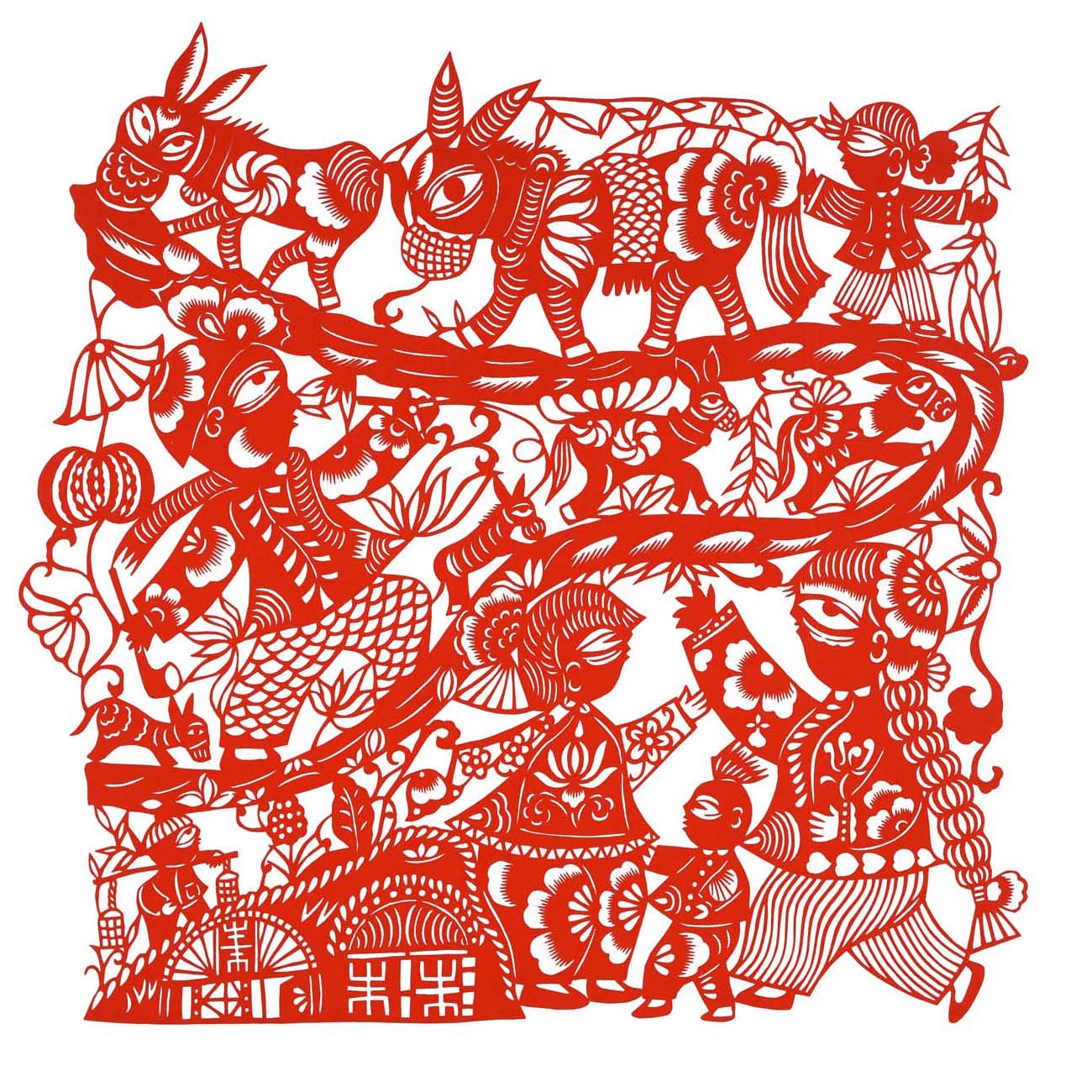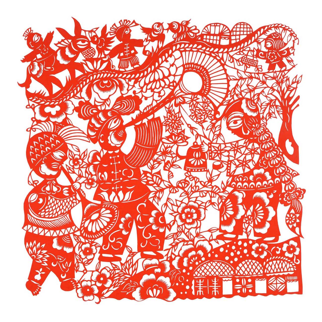 作品名称为《陕北民俗》,高80厘米,宽600厘米。该作品以红纸为材料,纯手工剪制而成,属于民俗题材剪纸,主要陕北生活的场景。该作品传递出民间百姓希望门庭子嗣繁衍昌盛的美好愿望。