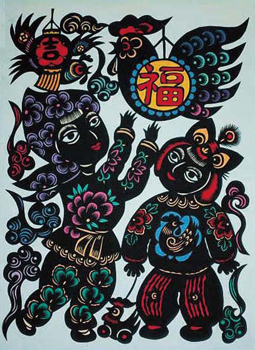 作品技术工艺及艺术特色:徐阳剪纸以剪为主,擅于填色、衬色、叠彩剪纸。作品运用中国民俗剪纸意象造型的技法,充满民俗性、吉祥性、意象性,人物造型生动有趣,色彩丰富饱满,对比强烈。