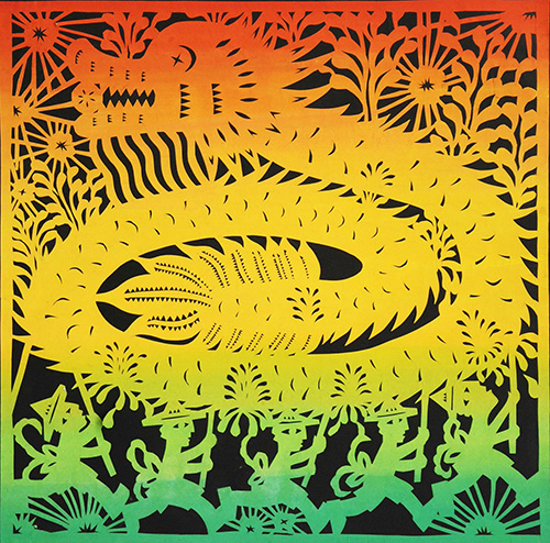 黄凤珠,现为揭阳一中美术高级教师、广东省美术家协会会员、揭阳市美术家协会常务理事、揭阳画院画师、揭阳市女子美术协会副会长、揭阳市青年美术协会顾问。在近20年的剪纸创作中,黄凤珠在继承传统剪纸技艺的同时,摆脱传统剪纸常用的单色,把现代设计的理念融入剪纸艺术中,在题材内容、表现手法上大胆创新,形成了个人传统而现代、朴实而浪漫的剪纸特色。曾应邀赴香港表演剪纸艺术,剪纸作品多次参加国家、省、市展览并获奖,其中,《国宝盼归之捣练图》2013年获 “中国工艺美术文化创意奖” 银奖,《归》2014年获 “中国工艺美术文化创意奖”金奖。