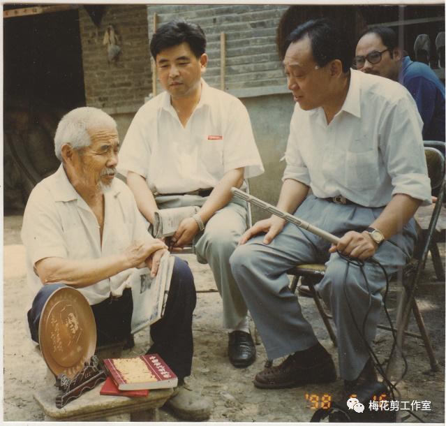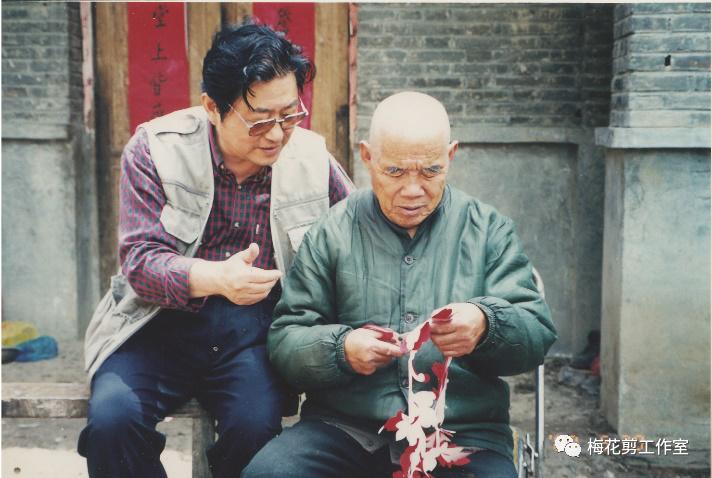 流动的颍河水尤如金蛇狂舞,灿烂的夕阳给颍河撒下金鳞,也把阜阳古老的文峰塔映得端庄、雄奇。一群男女老幼聚集在塔下,正围着一位个头矮小,皮肤黝黑、脸上布满皱纹的老人。只见他两脚满是泥巴,正蹲在地上,左手捏张红纸,右手握把剪刀,红纸在剪口下随意蠕动,纸屑顺之飘落下来,积了厚厚的一层。这就是四十年前我第一次见到的民间剪纸艺人程建礼的场景。剪着剪着他随口哼唱起来:“高高山上有一家,这家倒有姐妹仨,大姐名叫月兰,二姐名叫月桂,三姐名字叫月花。大姐好剪灵芝草,二姐会剪牡丹花,就数小三不会铰,扯扯唠、唠唠拉,铰个蝴蝶闹金瓜。”他霍地站了起来,越唱越有劲:“正月里正月正,白马银枪小罗成,一十二岁把登州打,夜打登州救秦琼。二月里龙抬头,七郎八虎闯幽州……”他以剪代枪舞动起来,完全陶醉在剪纸与民歌的巧妙揉合之中,我好不容易挤了进去问他为何边剪边唱,他说:“剪子一动就想唱,光剪不唱嗓子痒。”多么质朴的感情,多么率真的语言。在他身边还有一沓用旧报纸订的大本子,里边夹着几张叠好的红纸和许多剪好的小品。这就是他的一切,就是他的生命和灵魂。我问一位长者:“这人是谁?”他说:“是天天在街头剪纸的叫花子。”“哪里人?”“城东正午集南头程圩子的。”正是从这时起,我与这位乞丐艺人程建礼结下了不解之缘。