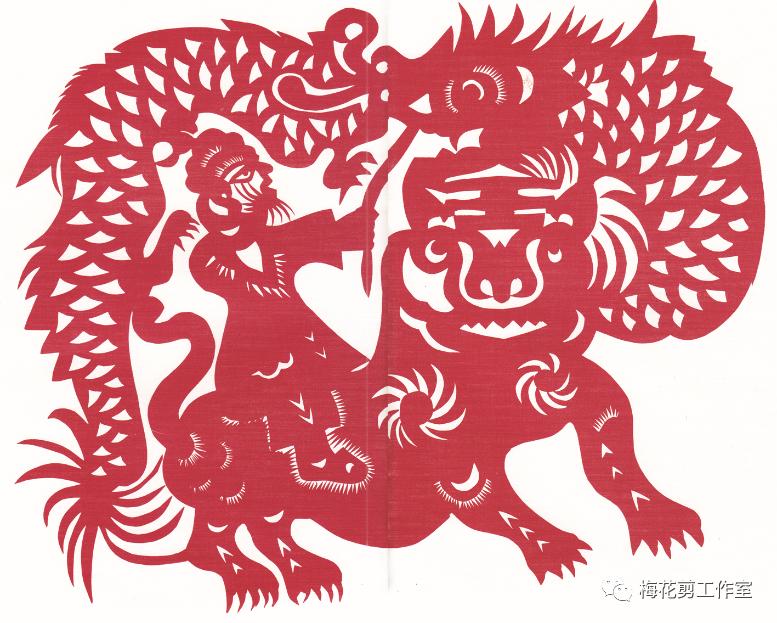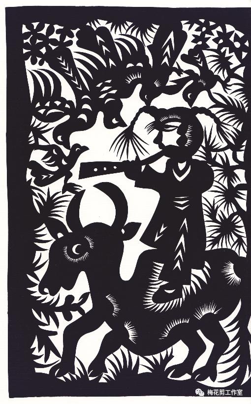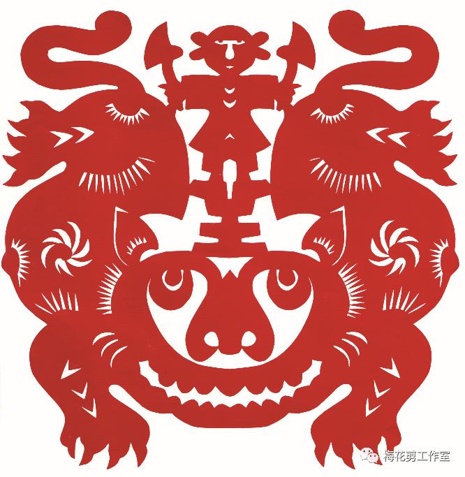 一方水土养一方人。阜阳位于黄淮平原,历来民风淳厚、文化悠久、民间艺术十分繁盛,其中剪纸最为突出。近年来出现不少技艺超群的剪纸艺术家和精妙绝伦的剪纸精品,使之成为国家级“非遗”,全国剪纸艺术之乡。程建礼,这个1921年冬季出生在淮北平原上的庄稼汉子,憨厚坦诚、率真朴实、不畏艰辛。在他八十多年的人生道路上,走过艰难曲折的道路,也是他漫长的艺术生涯。他视剪纸为生命,他的生命是剪纸。童年时他常和弟弟到河边挖黄胶泥做玩具,俩人比赛谁给家里做的东西多:从吃的烧饼大馍、用的锅碗勺盆,到养的牛马驴骡全捏好了,然而家里却一贫如洗。十三岁他给地主放牛,躺在草地上仰望蓝天、白云、飞鸟……望着自然界的一切他心里发痒,于是就掐荷叶、剪刨花,开始了他的剪纸生涯。他爹在贵州做工,为了生计他以剪纸手艺沿途讨饭,买不起剪刀就用主人家的,一路用过千家剪,吃过万家饭,直到大跃进时期他在贵州矿上做工,当地人听说他会剪花,一家工艺厂便吸收他去搞设计、剪花样。这下老程如鱼得水,一干就是八年。在那里他受到贵州传统民间艺术的熏陶,尤以腊染的影响最大,从而大大丰富了他的剪纸形式与内涵。生活磨练了他,时代造就了他。长期的艺术实践使他逐步将贵州民族地区的剪纸与徽派艺术融为一炉,形成他造型夸张,朴实无华,粗犷浑厚、雅拙自然的独特风格。老子曰:“大直若屈,大巧若拙”。明代书画家傅山曾针对当时书画界的陈规陃习,提示“宁拙毋巧,宁丑毋媚,宁支离毋轻滑,宁直率毋安排”的艺术理论。程建礼剪纸的最大特点就是表现出艺术的稚拙美。所谓稚,即为稚嫩、天真、敏锐、童趣;所谓拙,即为古拙、老辣、练达。可谓是“画到生时是熟时”。由于家庭贫困,上不起学,成了文盲,却非美盲。他执著而真切地挖掘着生活的真谛,寻找艺术的珠玑,把美无私地奉献给人们。他以极为朴素的感情洞察生活,搜索记忆。多以现实生活、古装人物、民歌谚语、花鸟禽兽为素材,常常随手捡来烟盒、报纸、旧信封、塑料皮等信手剪来。运用夸张、对比、变形、取舍、集中、构成等手法,把生活中美的东西作以理想化的升华。尤其人物剪纸造型特殊剪技娴熟。用锯齿纹、月牙纹将黑白灰处理得恰到好处,使大量作品成为不朽之作。《伏虎》是1985年在全国民间美术会议上表演的大幅对称式作品,画面上手持双斧的童子怒目圆睁,站在老虎头上,将虎身一分为二,两面臀部形同两座大山,童子手持开山斧往两方猛推,似有降龙伏虎劈山开道之势,表现出人定胜天的主题。这时的老虎造型已不是一般虎的张牙舞爪凶猛可怕,而是两眼向上,上齿紧扣下唇,前爪无力伏地,不见往日占山为王的威风。整个画面构图完美、对称有序、富于变化,将民间剪纸的形式与技巧发挥得淋漓尽致!《白蛇传》是我国民间家喻户晓的爱情故事,也是历来各类艺术家贯用的题材。而程建礼猎取其中最富情趣的《借伞》画面:西湖三月淫雨霏霏,船夫头戴斗笠,手握船浆,许仙正把雨伞递给心爱的白娘子,忽然一个浪头卷来,把小船打得上下颠簸,三个戏中人东倒西歪。好像还没有哪种艺术能像老程这幅剪纸,将传统戏曲的这一瞬间表现得那么集中、生动感人!