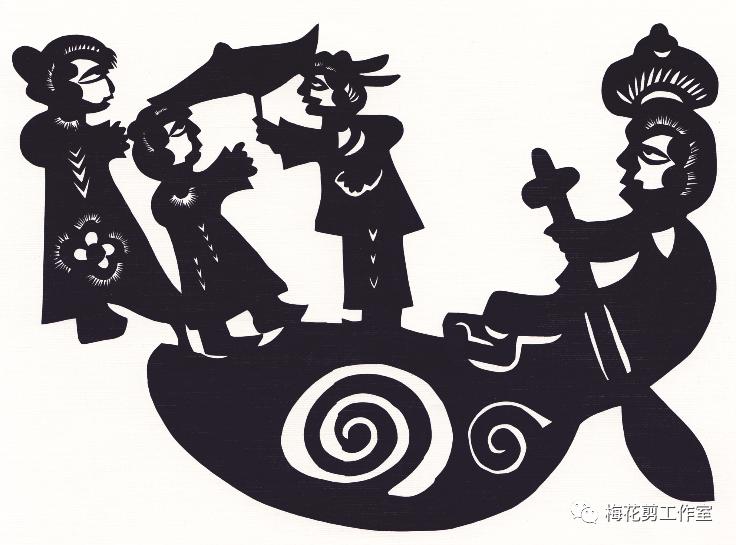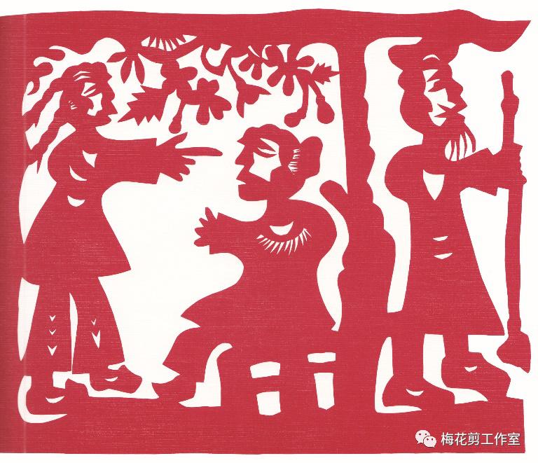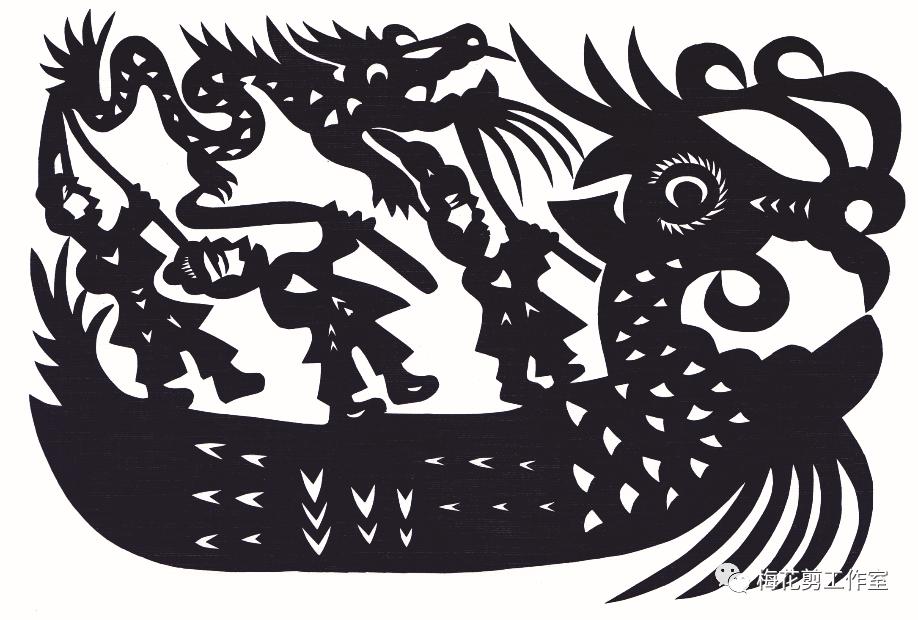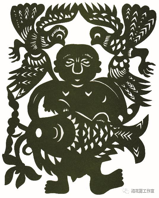 取材于民间故事二十四孝的《王祥卧冰》,作者以极大的夸张,把古代孝子王祥用身子暖化厚冰,取出的鲤鱼剪得比人还大,王祥也因捉到大鱼为母亲医病充饥而目光惊喜,两只吉祥鸟也分布两侧为之道贺。
