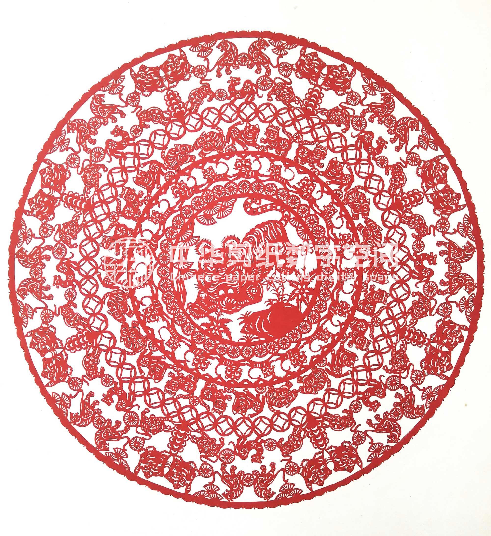 剪纸作品构图饱满、新奇巧妙、层次丰富、对比强烈、节奏明快,纹饰线条丰富多变。