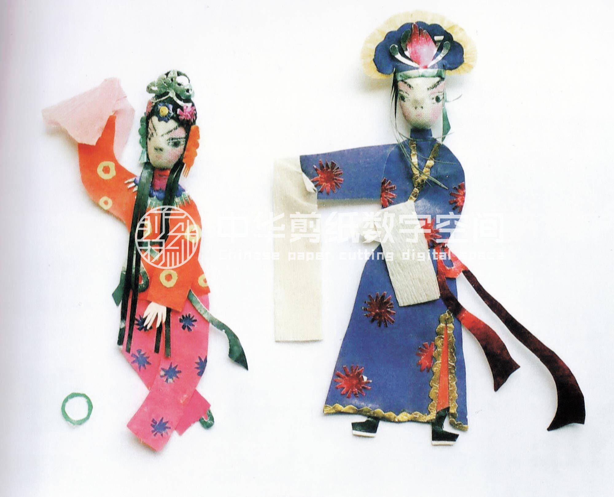 合阳新池乡的纸塑窗花,多采用各种色彩、金银箔、棉花、布片等材质进行局部剪贴、包扎、点染,然后再进行摞贴和衬色,组合成一幅完整的剪纸。因其贴在窗纸上呈现浮雕状,所以在民间又称为“出花”,意思是突出纸面的窗花,它的内容多为戏文人物,由此一些地方也叫“人厢”。