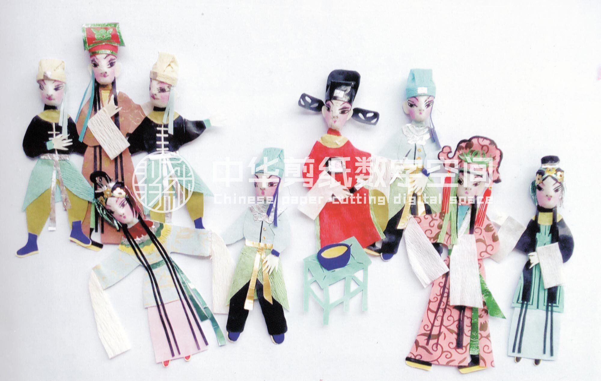 合阳新池乡的纸塑窗花,多采用各种色彩、金银箔、棉花、布片等材质进行局部剪贴、包扎、点染,然后再进行摞贴和衬色,组合成一幅完整的剪纸。因其贴在窗纸上呈现浮雕状,所以在民间又称为“出花”,意思是突出纸面的窗花,它的内容多为戏文人物,由此一些地方也叫“人厢”。