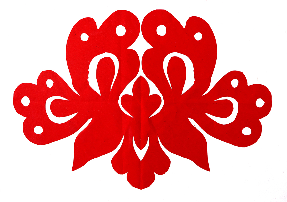 王焕珍娘家姊妹三人,她排行老三,上有一哥哥一姐姐。瓦联村距隆坊镇较远,人称川底子,村上没有学校,当时家里穷,既是有学校,家里也不会供女孩上学。小时候母亲剪花时她就在旁边看,看了就记下了。稍大些,母亲就把王焕珍当劳力用了,开始让她做针线活,为家人做鞋补袜,上地干农活。黄陵过年兴贴拼贴样式的窗花,当地称对花,就是花、叶、枝、蝴蝶、鸟鸟分开剪出,然后再兑到一块儿成为一幅完整的彩色窗花,制作一幅非常费事。以前是母亲剪窗花,后来母亲身体不好,剪窗花的事全交给了她。第一年剪窗花,用母亲积攒的样子拓着剪,第二年就不需要样子能直接冒剪。她在娘家除学会剪纸外,还跟着母亲和村上人学会了绣花,做猫头鞋,捏面花,织布纺线等女红活计。