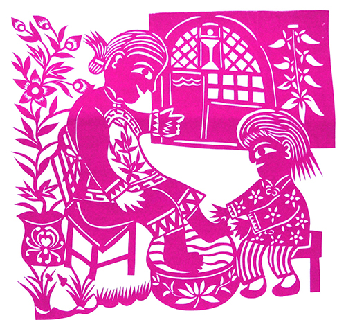王朝辉平日善于观察生活,而且会把生活中的生动形象变为自己的创作,所以她的剪纸作品和绘画作品造型生动有趣,生活情趣浓郁。由于她性格谦和、热情、无私,每有闲暇,她都会拿着自己的创作草图到余泽玲或王西安等剪纸能手家里听取修改意见,或相互探讨剪纸技艺,或和县城的剪纸作者聚在一起进行艺术创作。