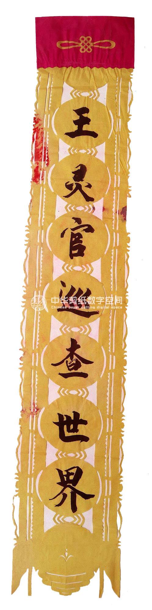 郭巧花说,她平常就爱看别人剪花、绣花,爱看人家门帘上的花,被单上的花,书上印的花,看上一眼就记下了。她在20出头时,村上结婚嫁女的人家都请她去剪喜花,缝被褥。60岁时开始学剪庙上用的剪纸,这一剪便放不下了,又是到处请着给剪。剪佛前吊子要用紫色,紫色是道教中的正色,有紫气东来的寓意。神堂和经堂用的幡一样,都是五色代表五方。道教门符一堂五幅,用黑白红黄青五色剪出,佛教门符一堂五幅都用黄色剪出。神幡是挂在主神两边的幡,上面还要写上对联。神幡要用线拴,这一拴就把运气翻过来了。五色旗插在院中的五谷斗中,神仙看到彩旗才会下凡参加庙会活动,庙会剪纸较多的传承着传统民俗文化的文化内涵。