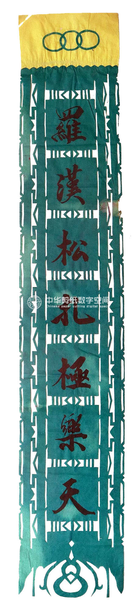 郭巧花说,她平常就爱看别人剪花、绣花,爱看人家门帘上的花,被单上的花,书上印的花,看上一眼就记下了。她在20出头时,村上结婚嫁女的人家都请她去剪喜花,缝被褥。60岁时开始学剪庙上用的剪纸,这一剪便放不下了,又是到处请着给剪。剪佛前吊子要用紫色,紫色是道教中的正色,有紫气东来的寓意。神堂和经堂用的幡一样,都是五色代表五方。道教门符一堂五幅,用黑白红黄青五色剪出,佛教门符一堂五幅都用黄色剪出。神幡是挂在主神两边的幡,上面还要写上对联。神幡要用线拴,这一拴就把运气翻过来了。五色旗插在院中的五谷斗中,神仙看到彩旗才会下凡参加庙会活动,庙会剪纸较多的传承着传统民俗文化的文化内涵。