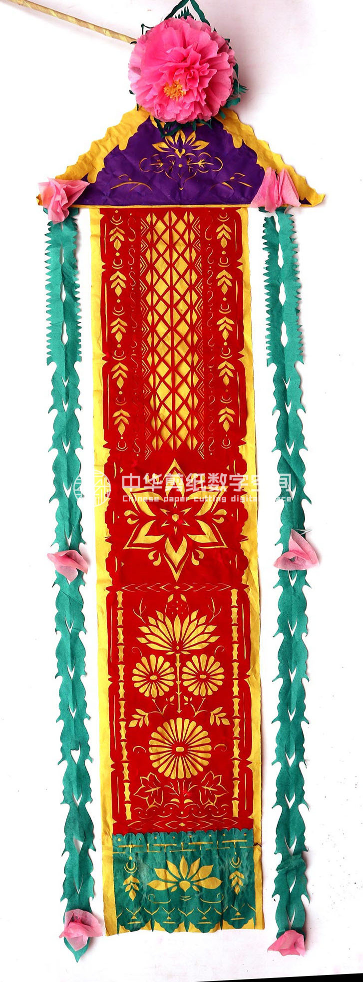 郭巧花说,她平常就爱看别人剪花、绣花,爱看人家门帘上的花,被单上的花,书上印的花,看上一眼就记下了。她在20出头时,村上结婚嫁女的人家都请她去剪喜花,缝被褥。60岁时开始学剪庙上用的剪纸,这一剪便放不下了,又是到处请着给剪。剪佛前吊子要用紫色,紫色是道教中的正色,有紫气东来的寓意。神堂和经堂用的幡一样,都是五色代表五方。道教门符一堂五幅,用黑白红黄青五色剪出,佛教门符一堂五幅都用黄色剪出。神幡是挂在主神两边的幡,上面还要写上对联。神幡要用线拴,这一拴就把运气翻过来了。五色旗插在院中的五谷斗中,神仙看到彩旗才会下凡参加庙会活动,庙会剪纸较多的传承着传统民俗文化的文化内涵。