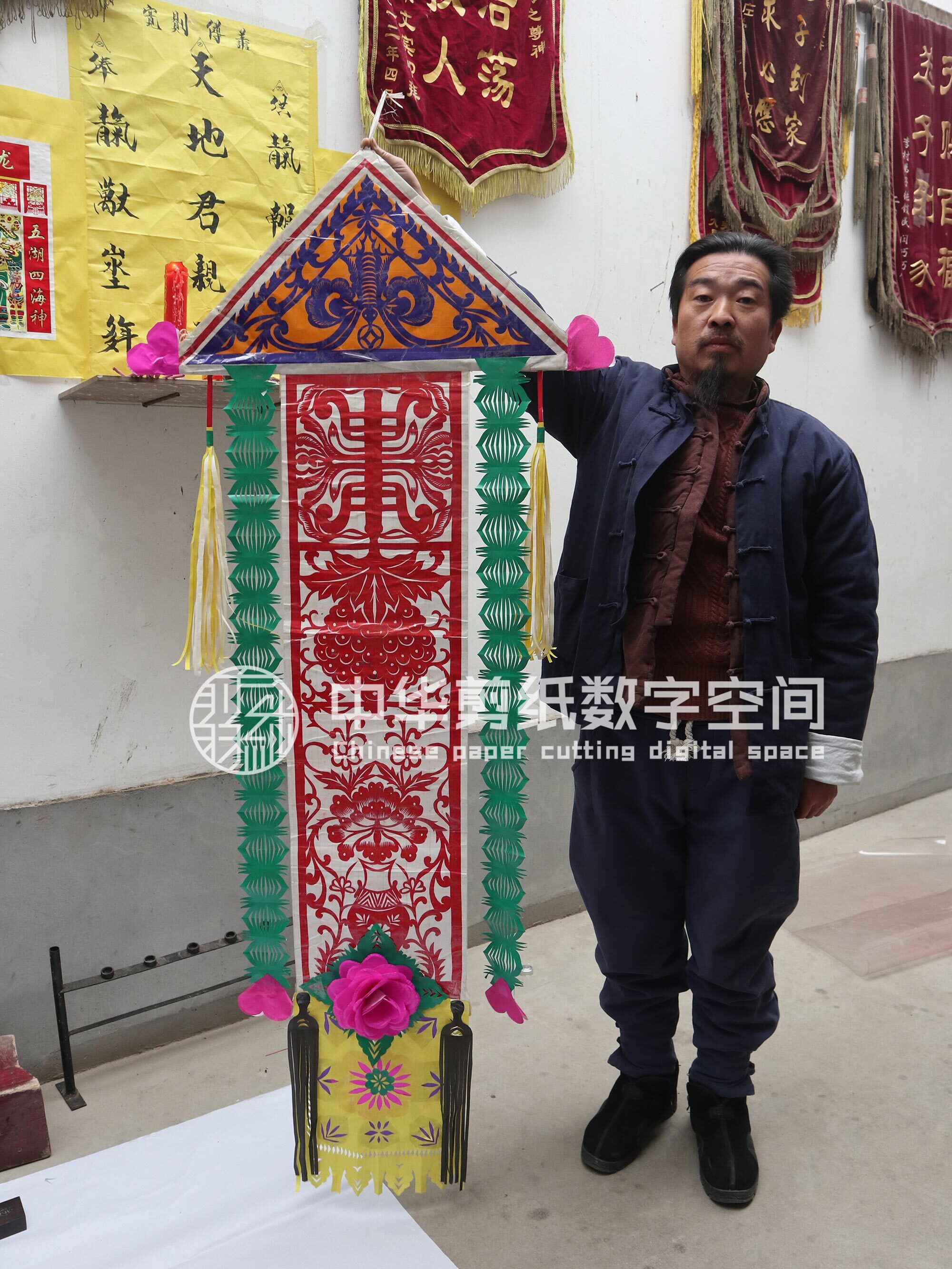 赵陕军自小聪明伶俐,爱画画,爱拉二胡, 赵陕军的道场剪纸,较好的传承了宗教剪纸的样式,剪法和其艺术特点,他又对周边乡镇的道场剪纸进行过调研,对其纹样的用法寓意了解得较多,因为剪出的剪纸多带神秘色彩,再是剪工精巧细腻,风格大方质朴。赵陕军说:“剪道场剪纸,心必须虔诚,不可有杂念,尊神就是尊人,尊人就是尊神。”