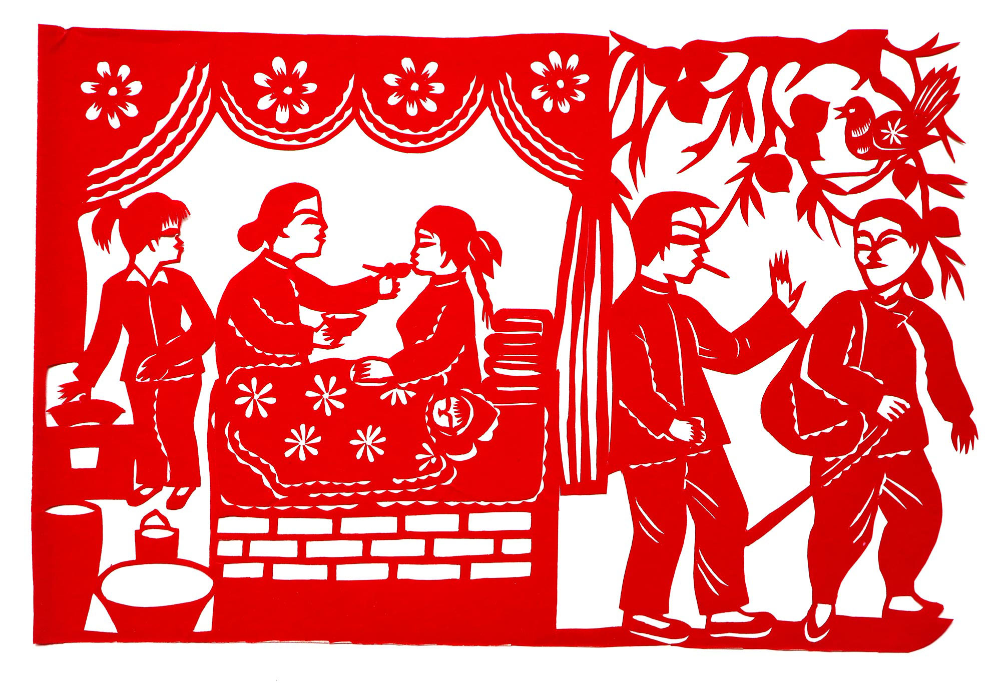 1973年,冯秀莲结婚,那年20岁。结婚时的嫁妆全是她自己做的。婆家是乾坤湾枣洼村,当地老户。公公农民,不识字,靠务农为生,没有什么手艺。婆婆不识字,不会剪纸,但会扎花,扎花的花样要请别人剪。丈夫马志祥,农民,小学文化程度,婚后生养有三个男娃。