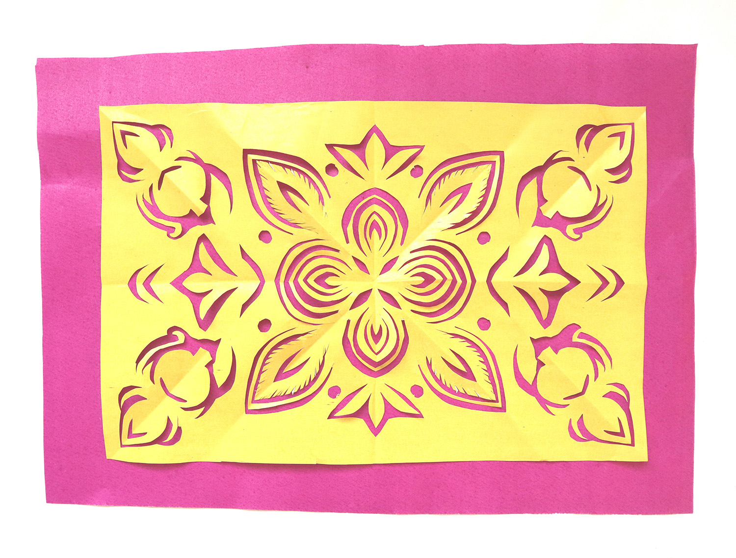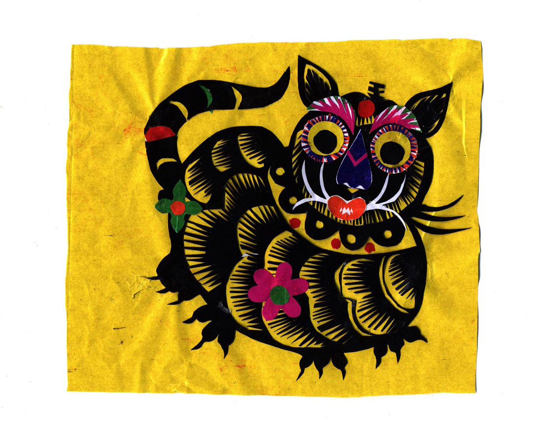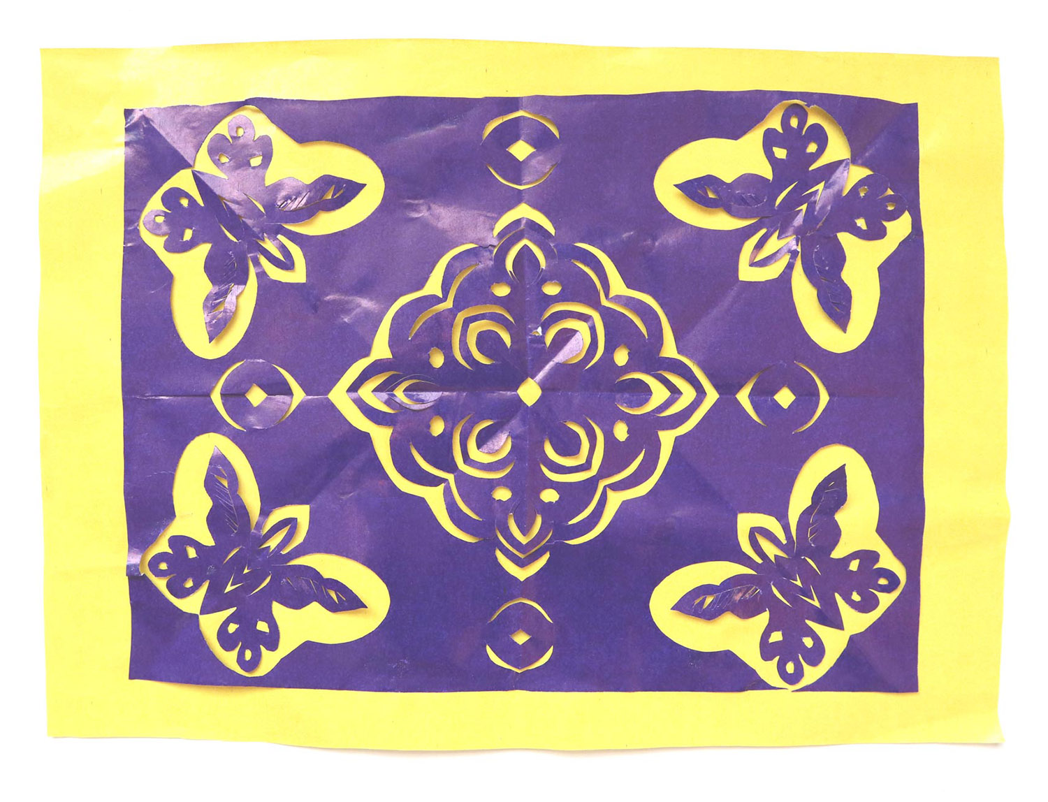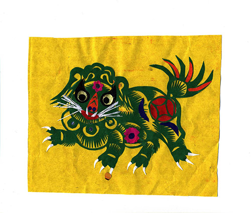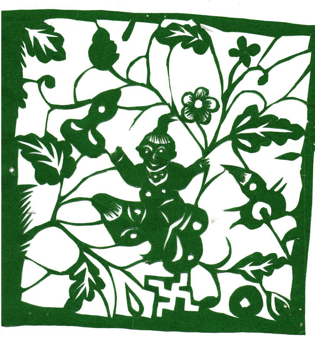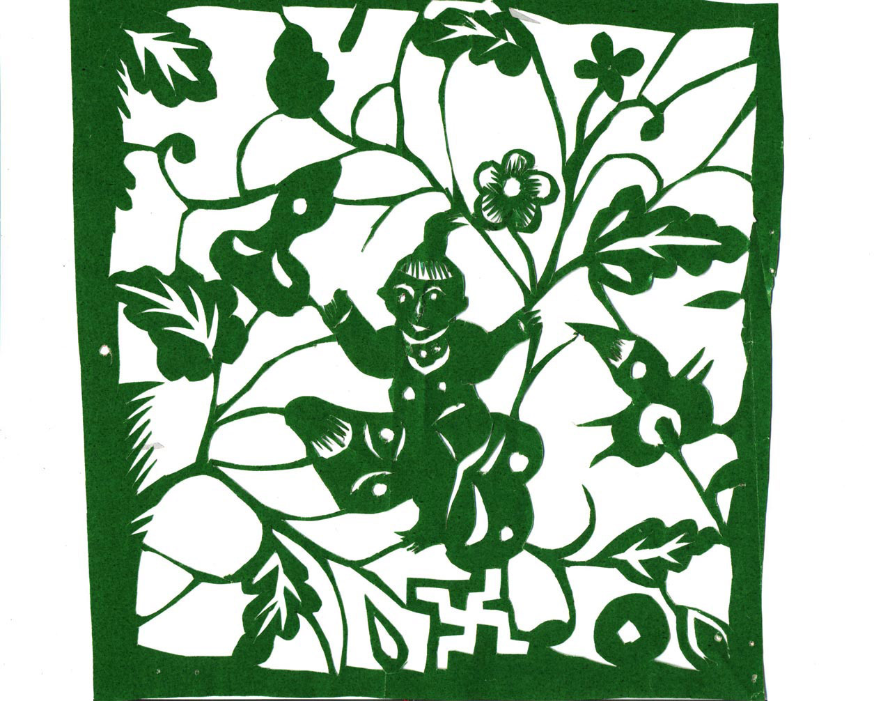 贾光敏受父母和老姑的影响,从小爱剪爱画,记忆力强,好胜心强。父亲画门帘檐,她就喜欢看,看见个什么图样,便能记住,然后把图样再画出来。上初中时作文获过全乡第一名,但学习成绩下降了,心思都跑到了剪纸和画画上。一下课就摸出剪刀剪窗花,和女同学比巧。20世纪70年代农村仍兴时贴窗花,每到过年贾光敏都要把家里的几副窗子贴得满满的,花花的,这些窗花多是照着老姑传下来的老样子剪的,有的是让父亲画的“鸟弹梅”“鹤鹿同春”“凤戏牡丹”等图样, 自己再剪成窗花。也有自己冒剪的“鸟”“莲花”“老鼠啃南瓜”等图样。剪老虎时不会捉样,就照着门边卧的猫剪。