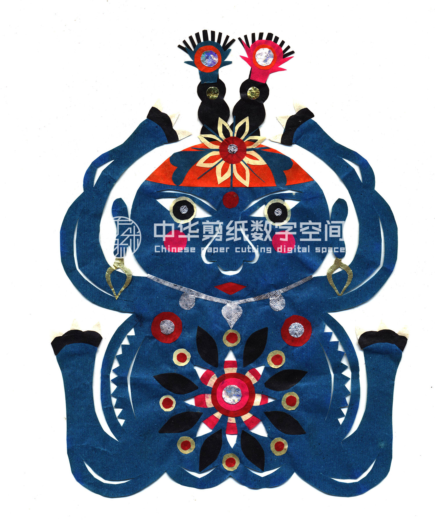 赵玉英不但较完整的传承了大荔彩贴剪纸的技法,在此基础上还采用摞贴、拼贴、衬色相结合,创作出了自己独特风格的作品。代表作品有《蛤蟆变娃》《大黑猫》《鱼钻莲》等,这些作品已成为当地广大妇女们学习彩贴剪纸的谱样。
