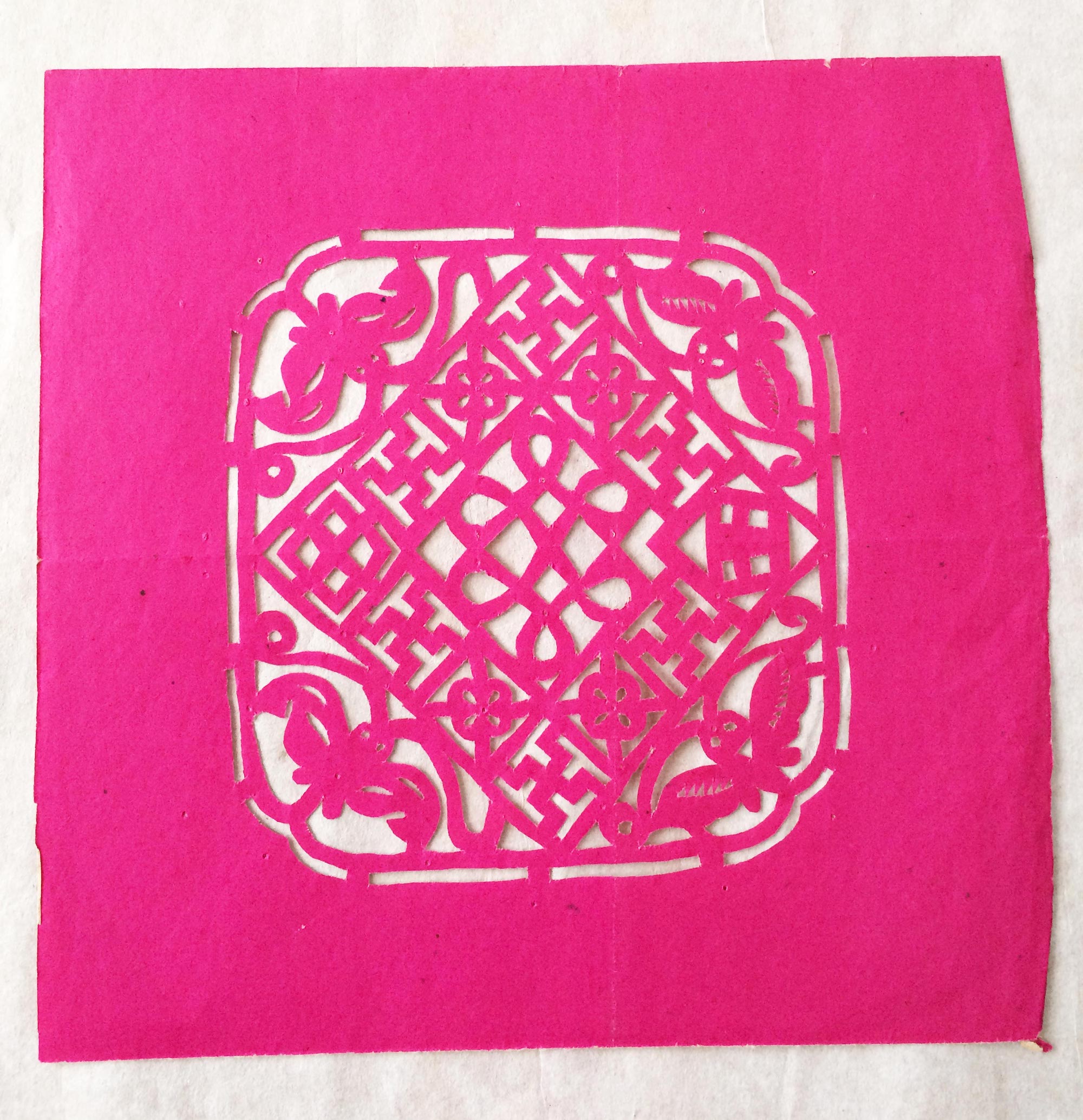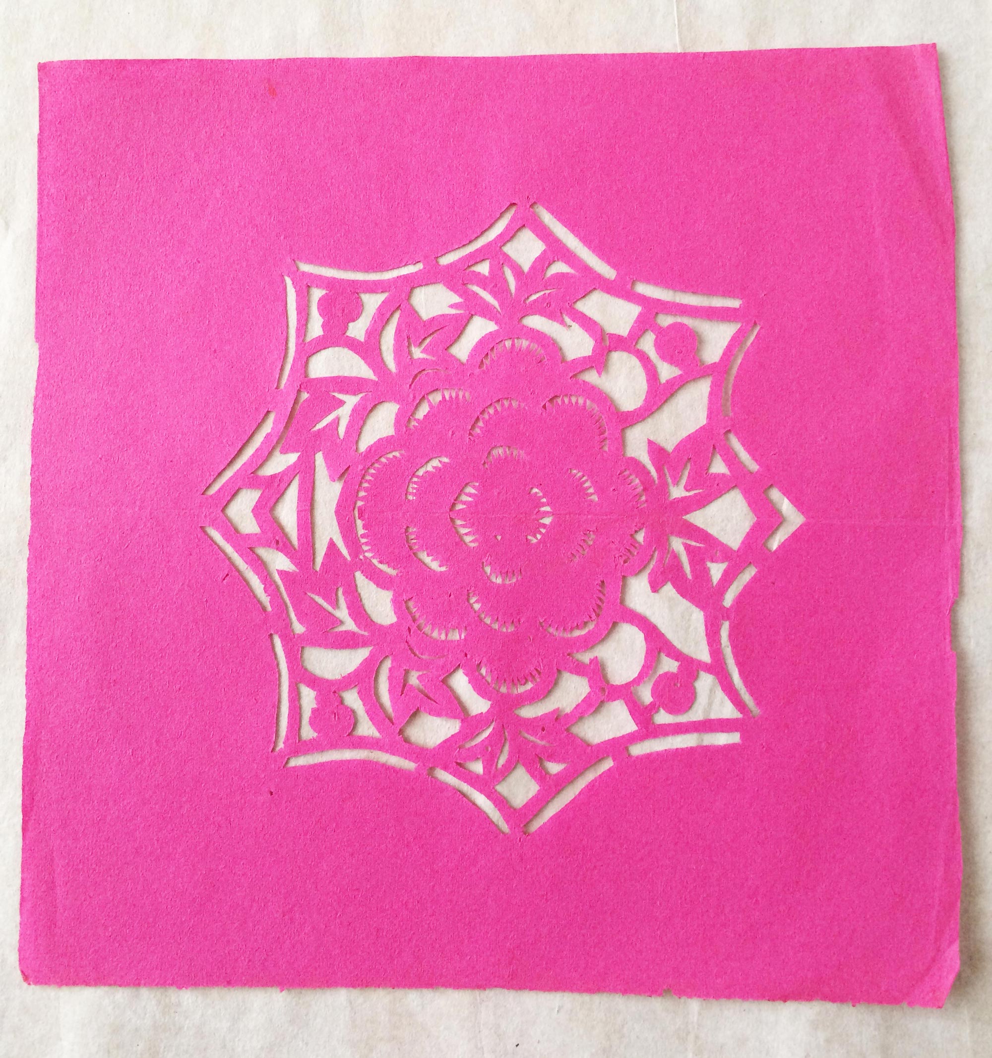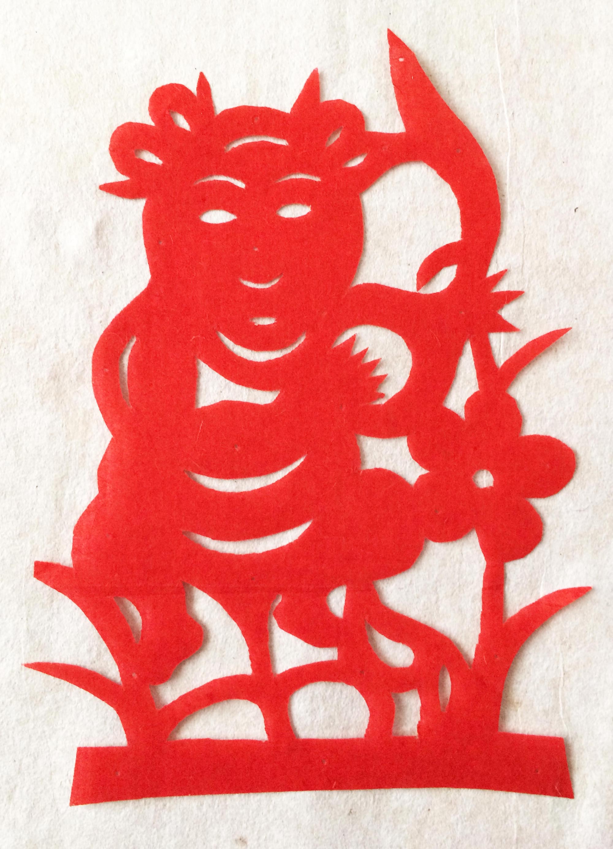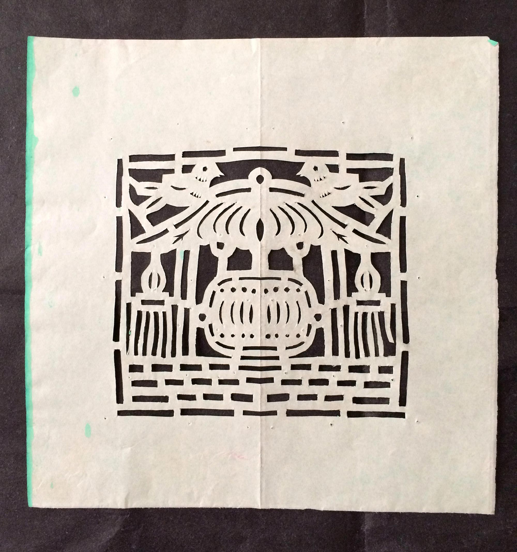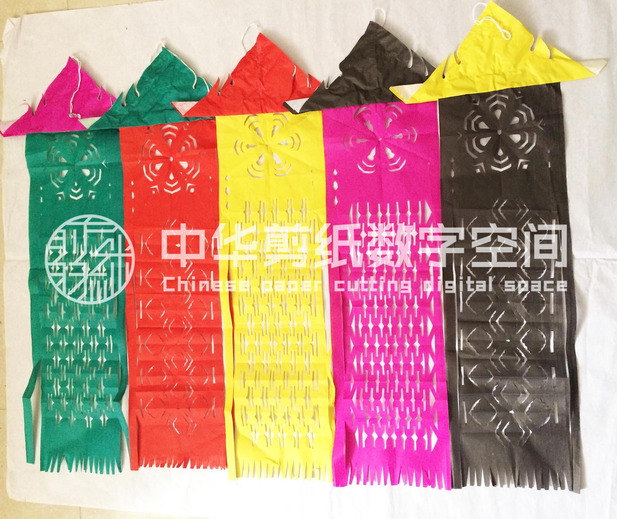 雷蓬岗,男,1992年生,汉族。雷鹏岗家是当地老户,祖辈农民。父亲有制香的手艺,母亲会纸扎工艺,会剪花、会刺绣,还会用木刻版印制冥币。改革开放后,母亲在镇上开了家纸扎工艺店,经销丧葬纸扎工艺品和香蜡纸表。大姑和二姑手都很巧,会剪会绣,还会草编工艺。雷鹏岗兄弟两个,他是老二。受家庭影响,从小对剪纸感兴趣,父母在做纸活时,他拿起剪刀学着剪一点简单的花草图样。13岁时,村上几位老奶奶给庙上剪糊神衣神袍,糊神靴神帽,衣袍上精美古朴的剪纸图案深深地吸引着他,老奶奶精湛的剪花技艺使他着魔。老奶奶们剪糊衣袍鞋帽剪糊了三天,他跟着看了三天,学到了不少传统纹样的剪法,对剪糊庙宇用的剪纸的方法步骤及样式有了一些了解。