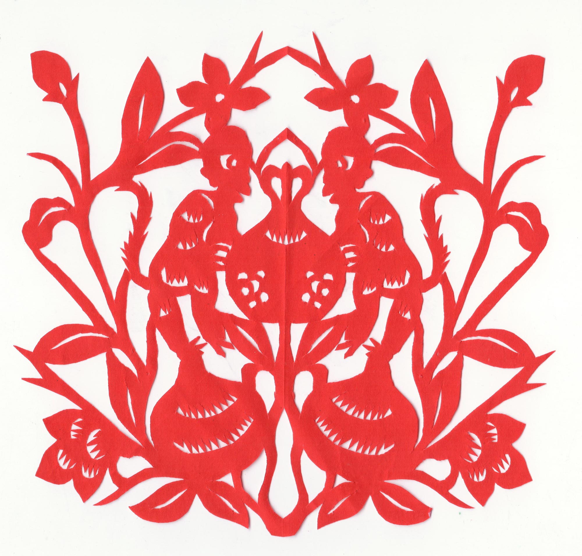 王建民,男,1947年2月生,汉族,王建民家是当地老户,祖辈农民。父亲没有手艺,靠种地为生。母亲不会剪花,不会绣花。王建民兄妹三人,他为老小,上有两个姐姐。王建民自小喜爱剪纸,七八岁时学着姐姐把窗花熏成样子,然后拓样子剪。见村人有结婚的人家,喜欢去看人家贴的洞房喜花,把喜花用心记下来,回家再想着剪出来。到20世纪90年代后,家里盖起楼板房,窗子换成了玻璃窗,这才不剪窗花了。
