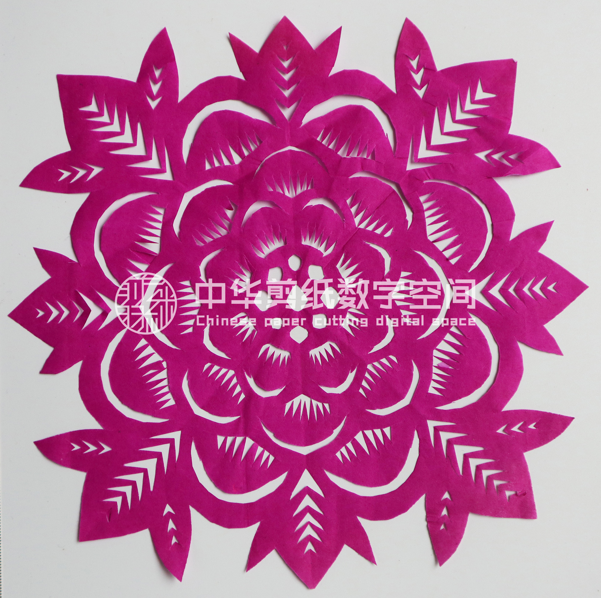 王莲莲17岁时出嫁,婆家天度镇下寨村南堡组。丈夫王忠绪,复转军人,当时复员时正是20世纪50年代初级农业社阶段,国家困难,家里没劳动力,分不上粮食,便回到家中务农。公公在扶风绛帐粮店工作,婆婆手巧,擅长剪窗花。王莲莲生养4个孩子,二男二女,命好,剪纸又好,常被村民请去剪喜花,糊窗花。2000年后儿女都成家立业,也都在外地工作,孩子们不在跟前,地有老伴种,一天没啥事,便跟上老太太们一块到庙里做佛事。每有庙会,和老太太们一块给庙上剪神幡、五色旗、万民伞等。另外周边三个村的庙过会,也跟上老太太们一块糊神袍、神衣以及鞋帽,尺寸要和庙上的爷爷、娘娘婆一样大小。衣袍、鞋帽上用的剪纸图案都由王莲莲剪。王莲莲说,自从跟上老太太们做上佛事觉得心情好了,跟老伴、媳妇也不淘气了,也不想孙子了,能吃能喝能睡,身体也好了。2003年镇文化站专干发现王莲莲的剪纸艺术,便推荐到县文化馆展出。