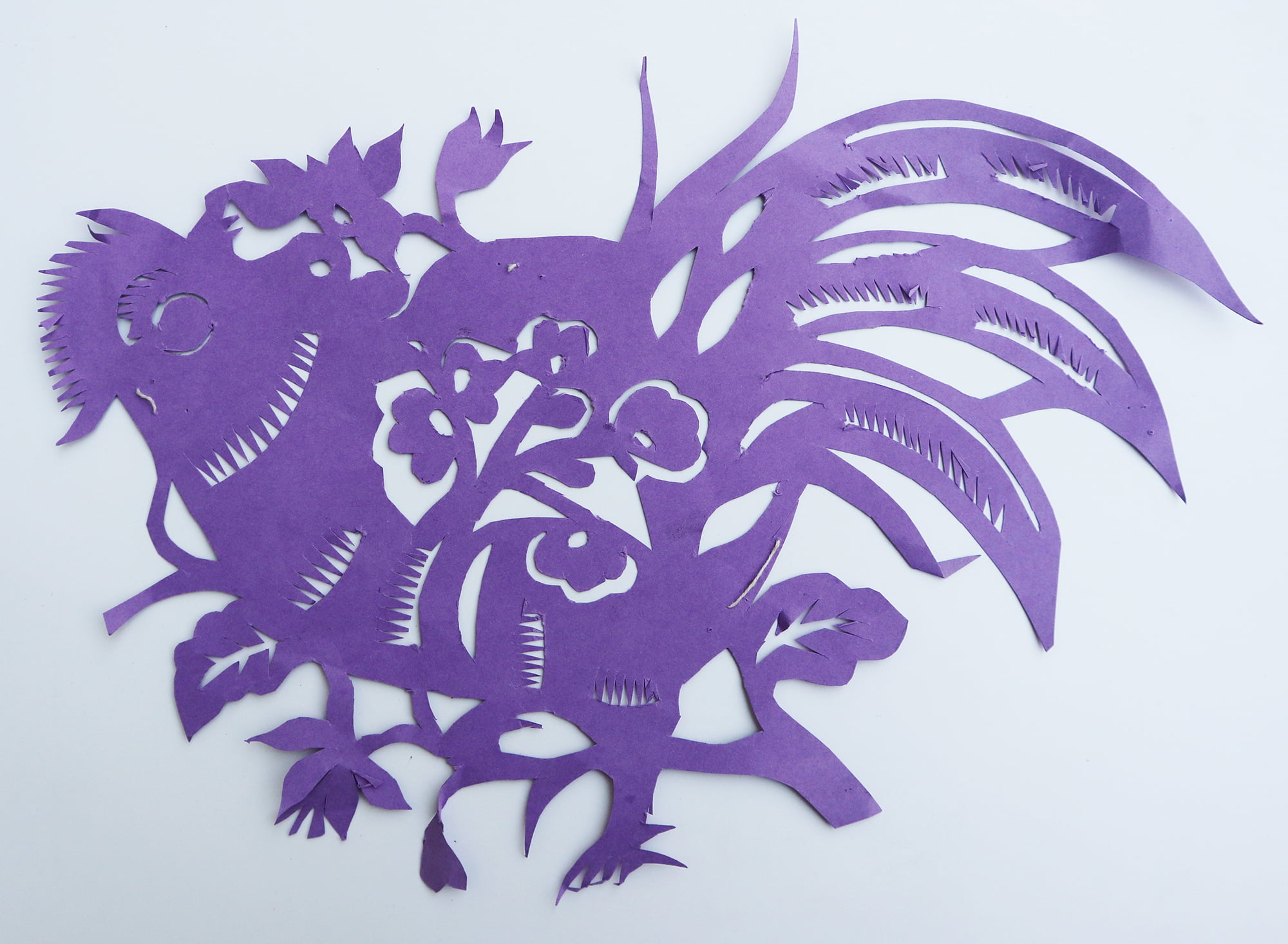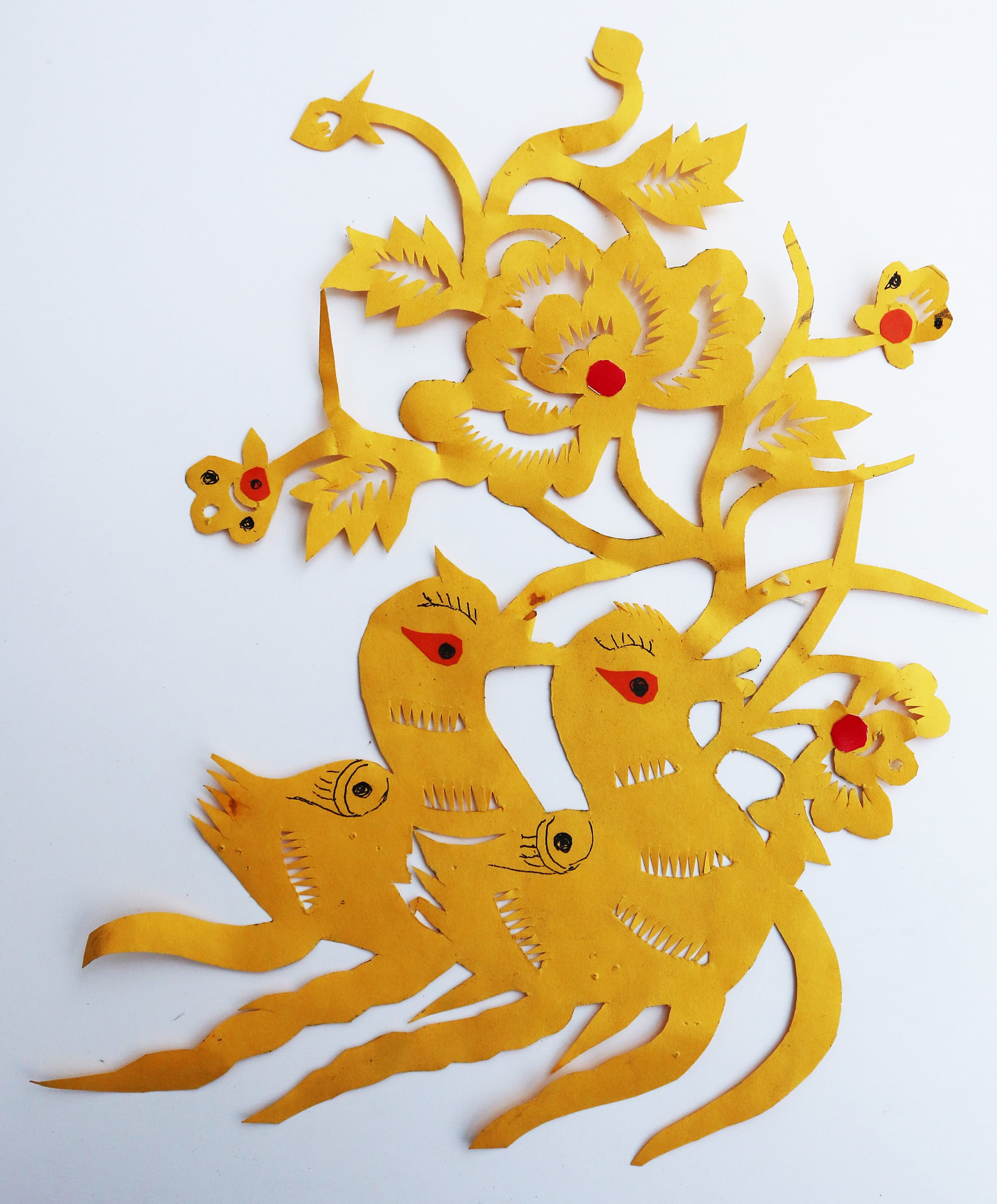 杨黑彦从小喜爱剪花,喜爱画画,对剪纸很有天赋,见继母剪个啥,看上一眼就能剪出来。一有空闲,就照着墙上贴的《刘海戏金蟾》《刘金定出征》等木版年画在地上画。正月天女娃娃不纺线不织布,整天坐在一起学剪花。由于杨黑彦能冒剪窗花,成为女娃娃们崇拜的对象,把她的剪纸熏成样子,一个个拓着剪。内容有四角云子,牡丹花,鸡,娃娃等。
