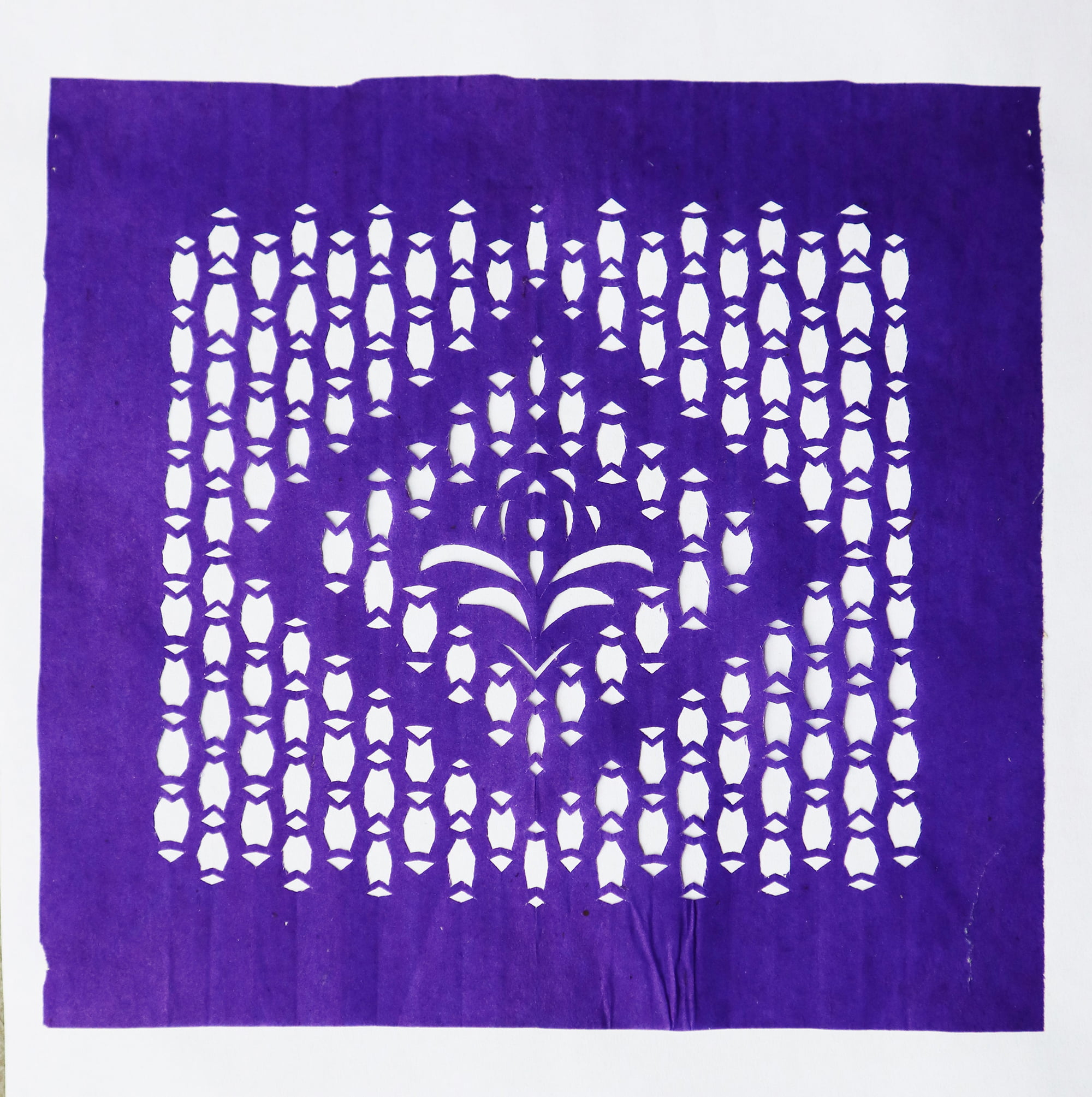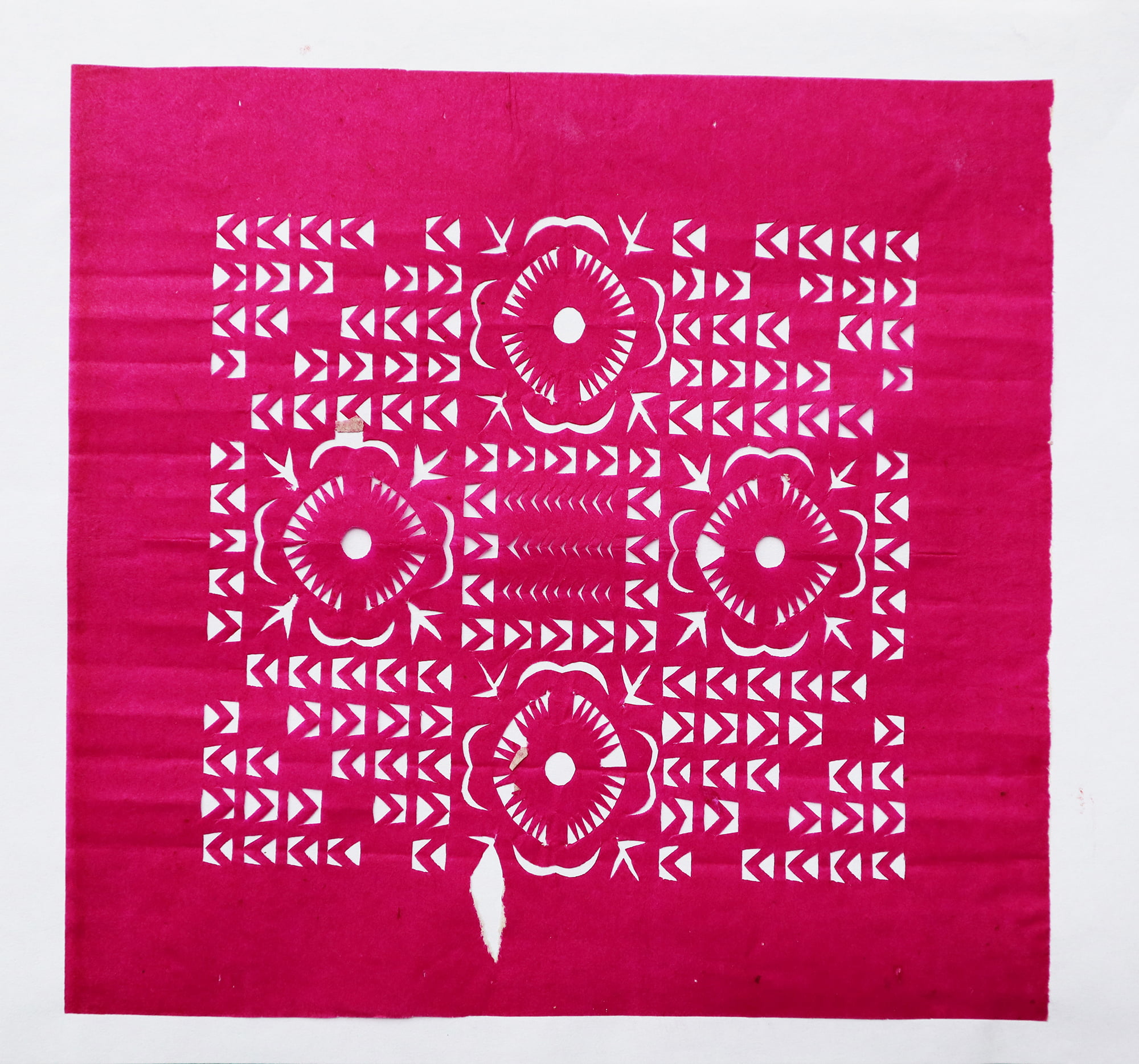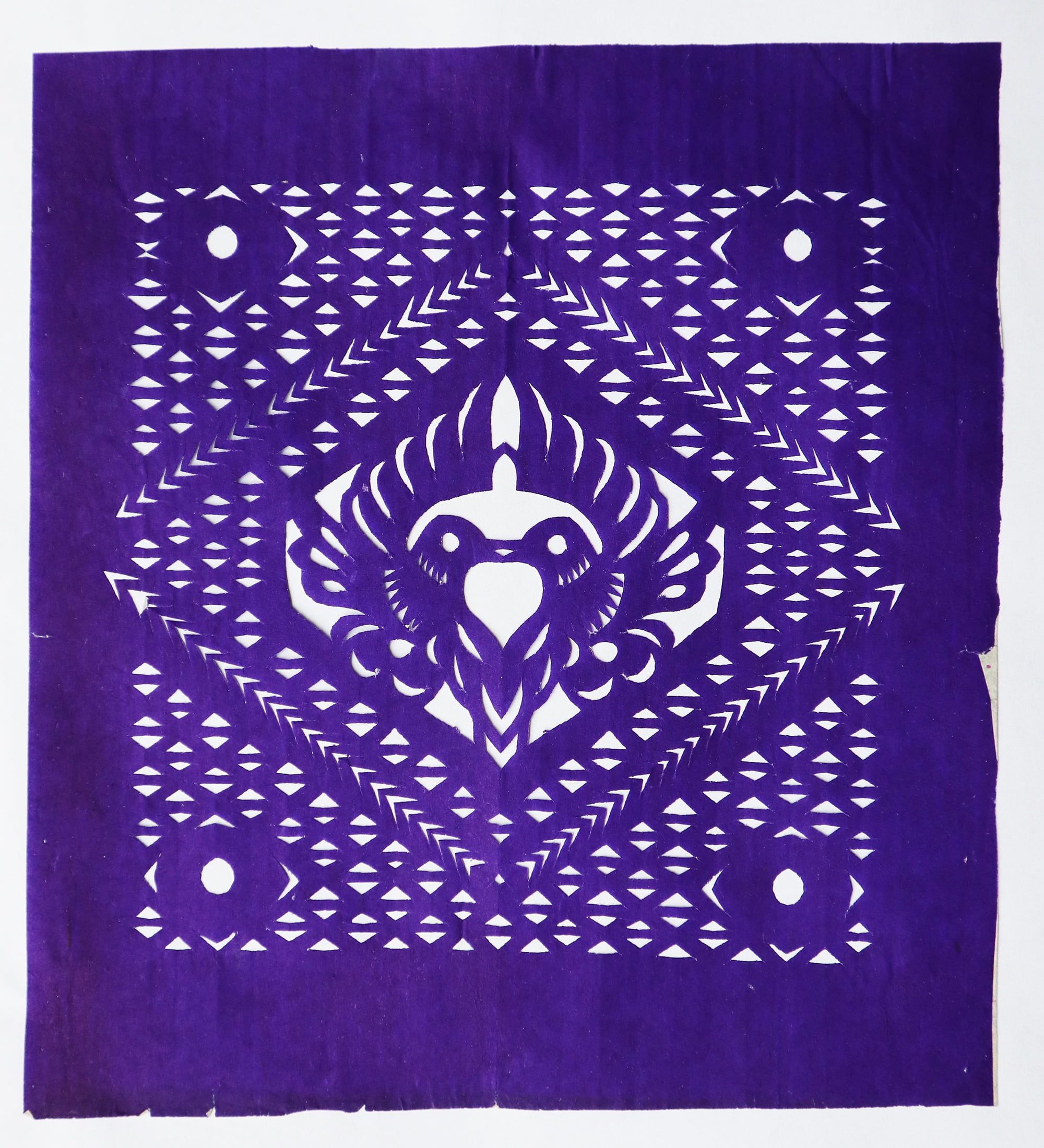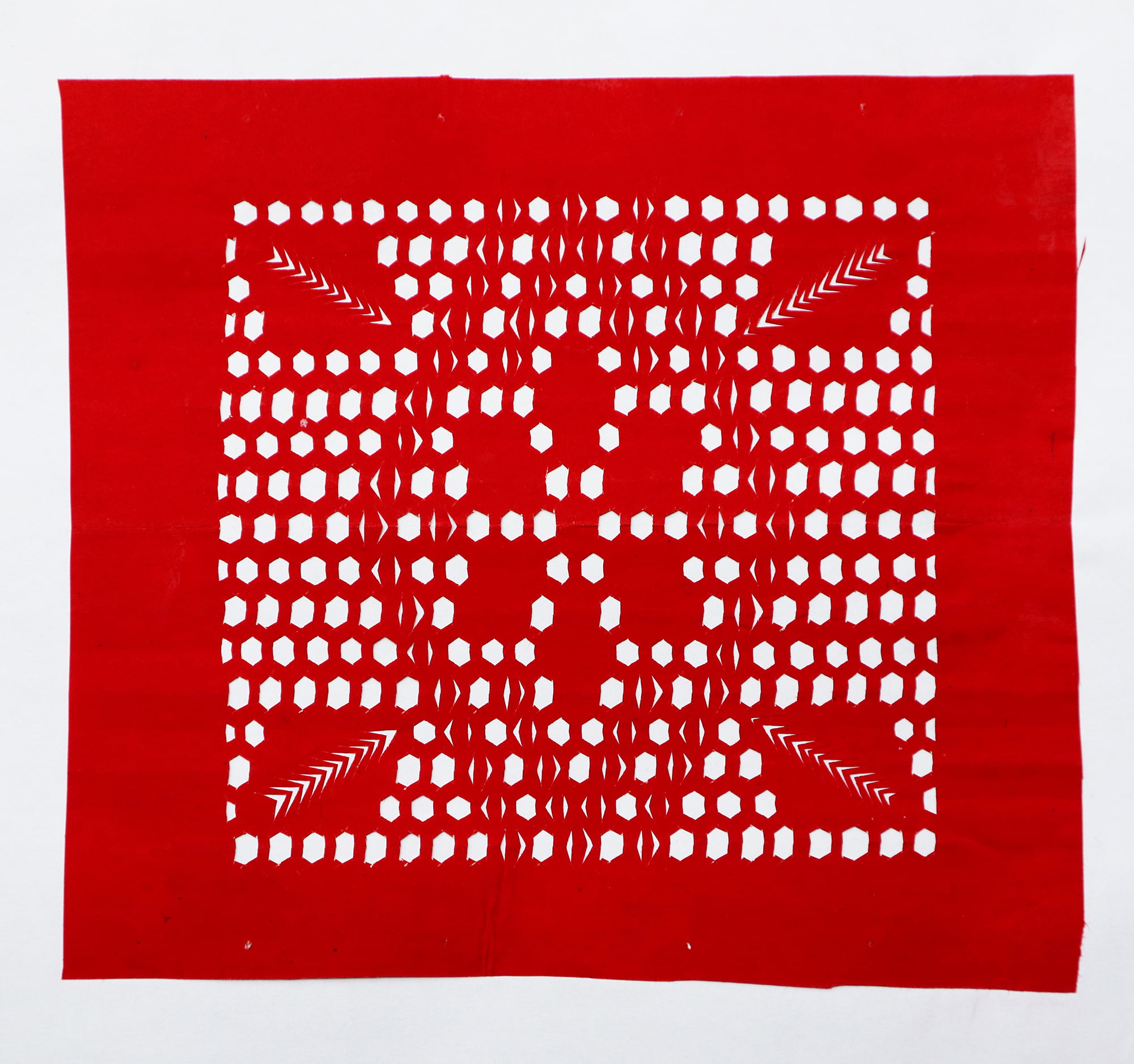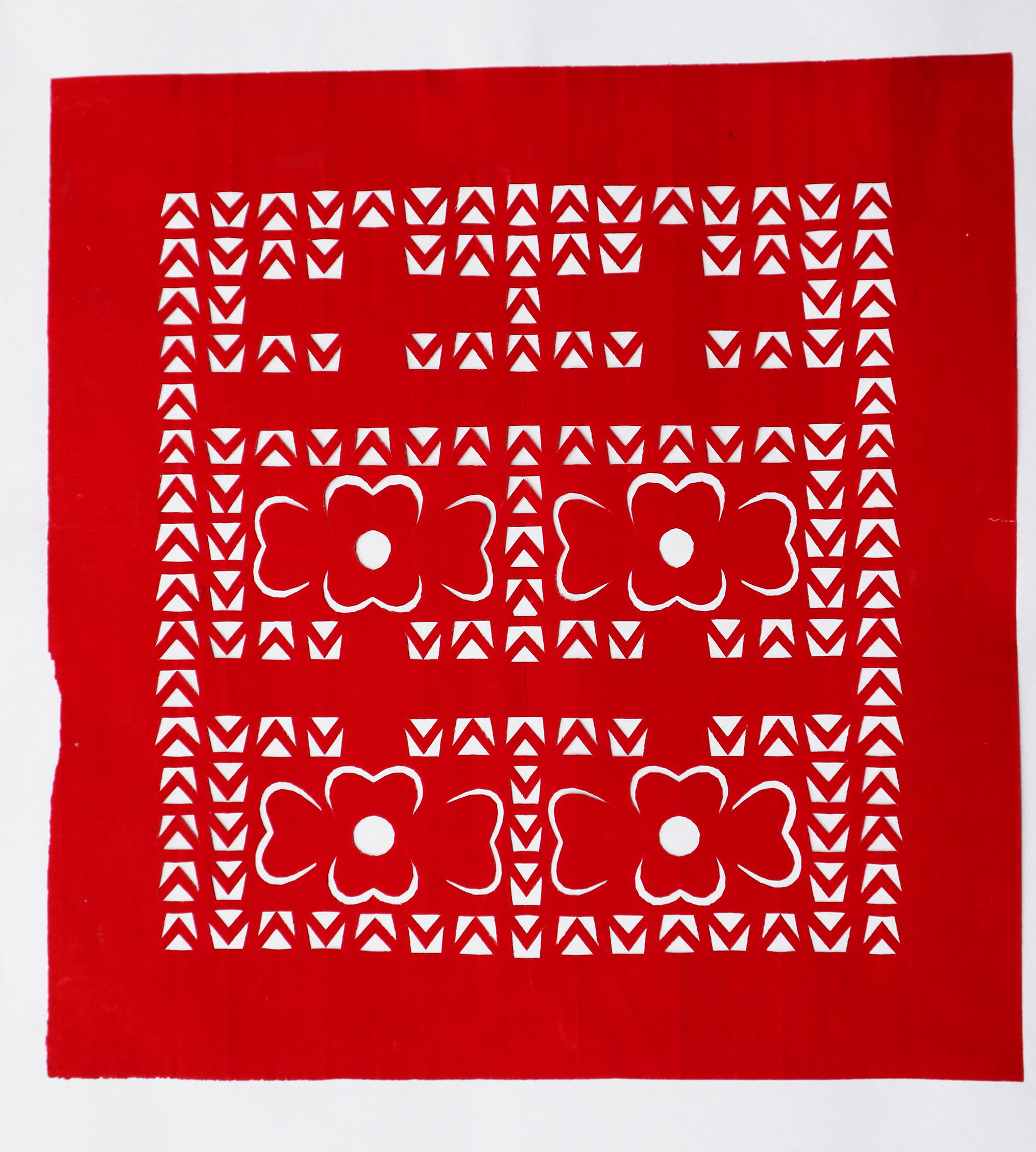 韩拉素姊妹6个,她为老三,上有一姐一哥,下有二妹一弟。大姐手很巧,村上称大姐“巧巧”,能剪擅画,家里用的窗花都由大姐来剪。韩拉素1963年上小学,一直到初中毕业。她从小爱和大姐在一起,大姐剪花她剪花,大姐绣花她绣花。当时农村盛行春节贴窗花,农村贴的窗花都是各自剪,谁家女子不会剪窗花,会被村人笑话,所以父母特别重视女娃娃的剪花手艺。韩拉素在母亲的要求下,在姐姐的带动下,坚持剪纸,学会了冒剪窗花,冒剪喜花。她把平常剪的窗花积攒起来,到腊月贴花窗时,她给亲戚送,送村人送,还帮左邻右舍贴花窗。