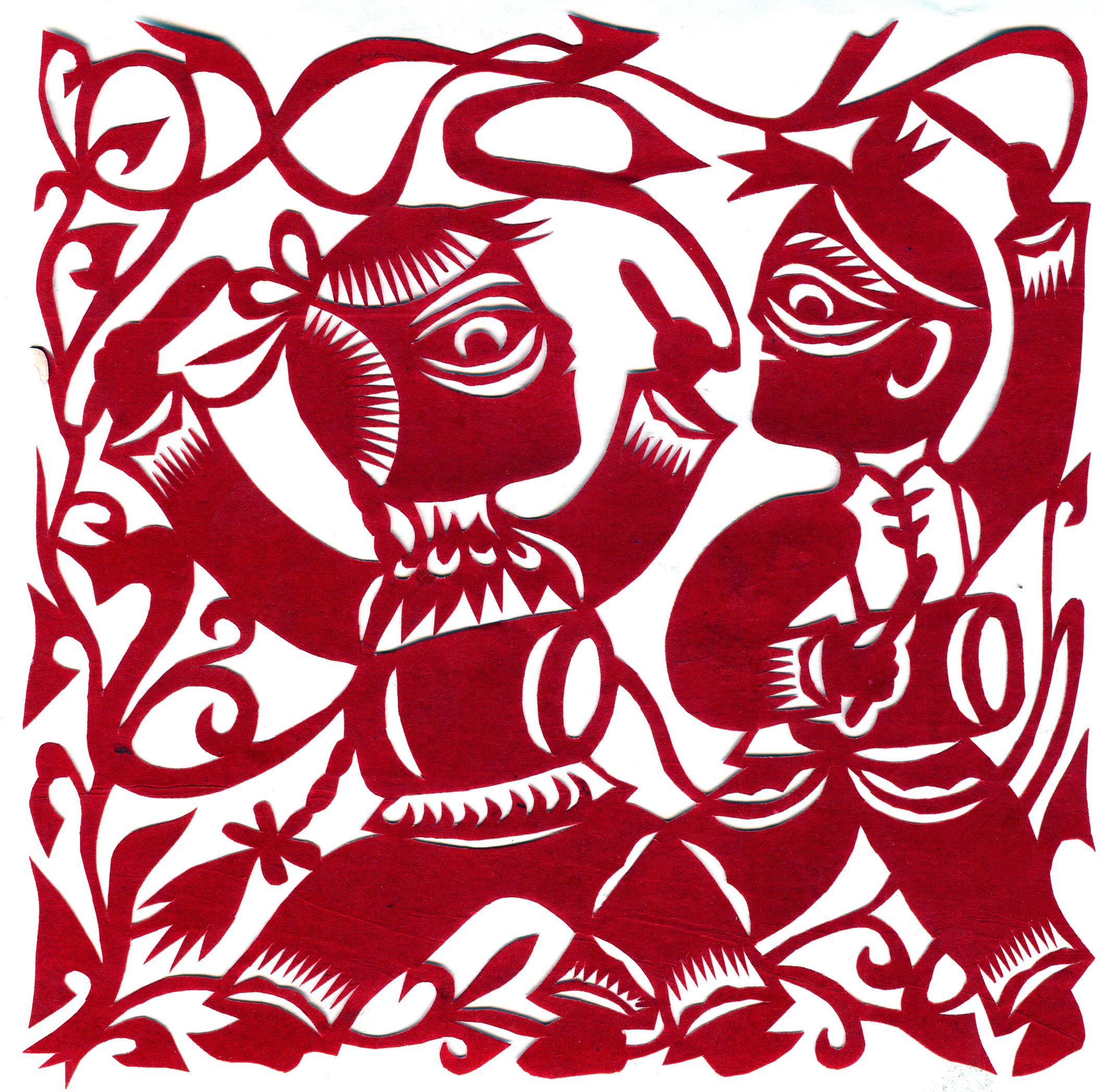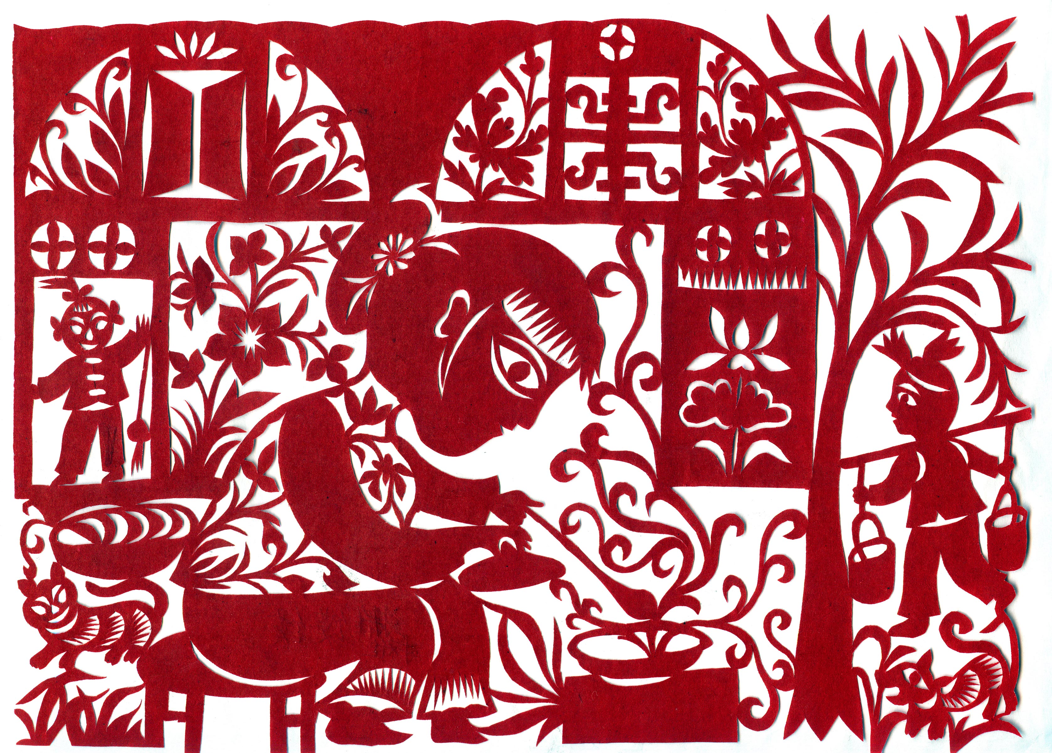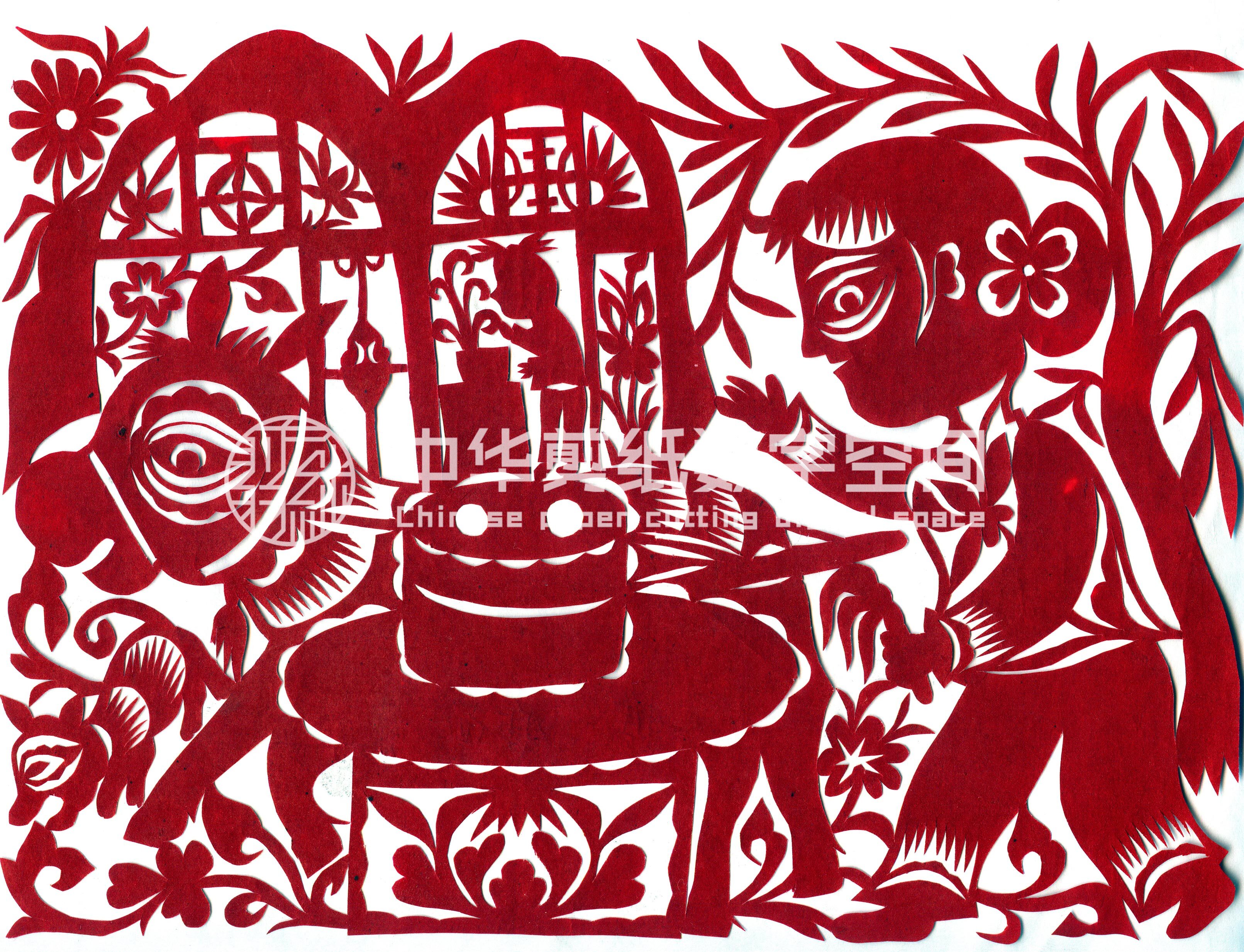 刘晓娟早在七八岁时就开始学习剪纸。母亲是村里剪花的巧人,每到腊月就给村里家家户户剪窗花,刘晓娟看在眼里记在心里,就学着母亲的样子剪了起来。父亲看见了说:“从小不学个好的,就学伺候人的本事。”但刘晓娟就是喜欢剪纸,每年就渴望腊月快点到来,坐在炕头上剪花花别提有多高兴了。因为母亲从不拓样子剪,所以她也就直接冒剪。开始学剪纸都是先学剪花草,慢慢地剪动物,熟练之后再把人物与动物往一起组合。过年的窗花、墙边花、下雨天的扫天媳妇、叫魂看病的剪纸都是她来剪。