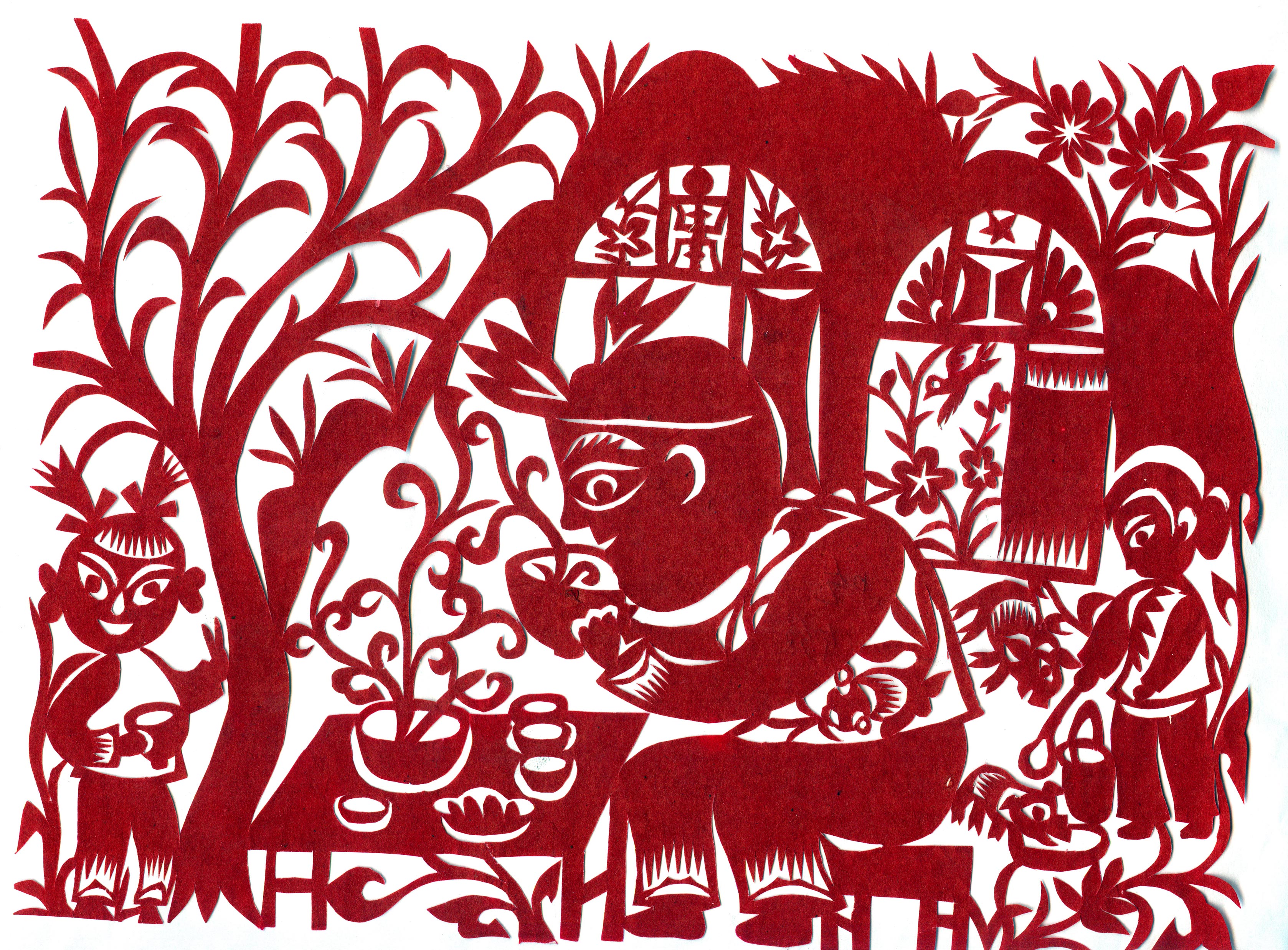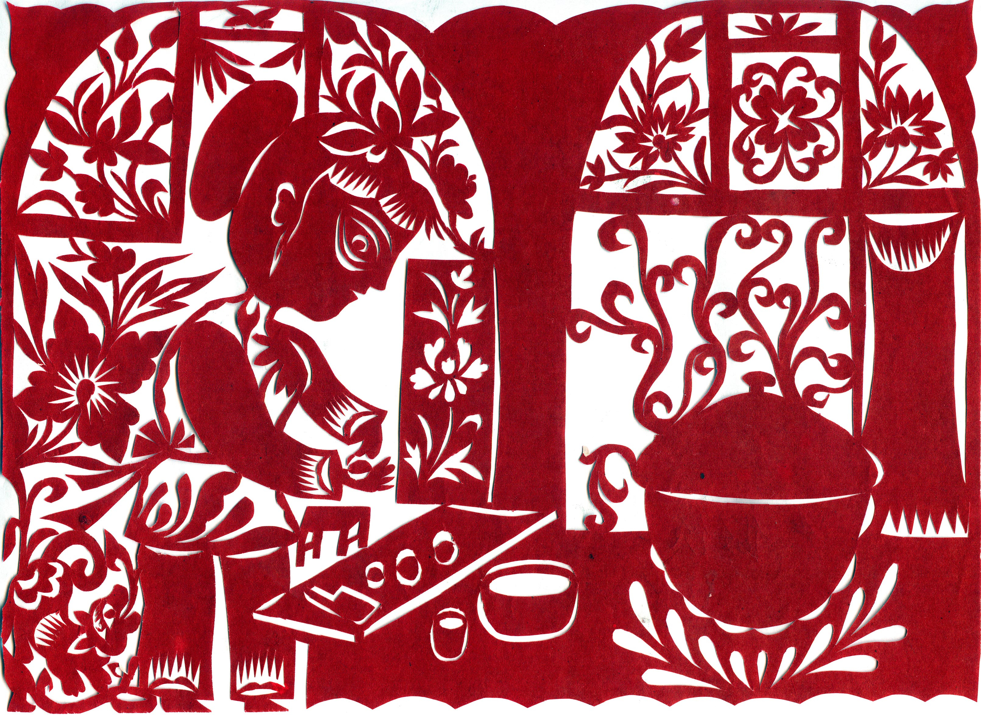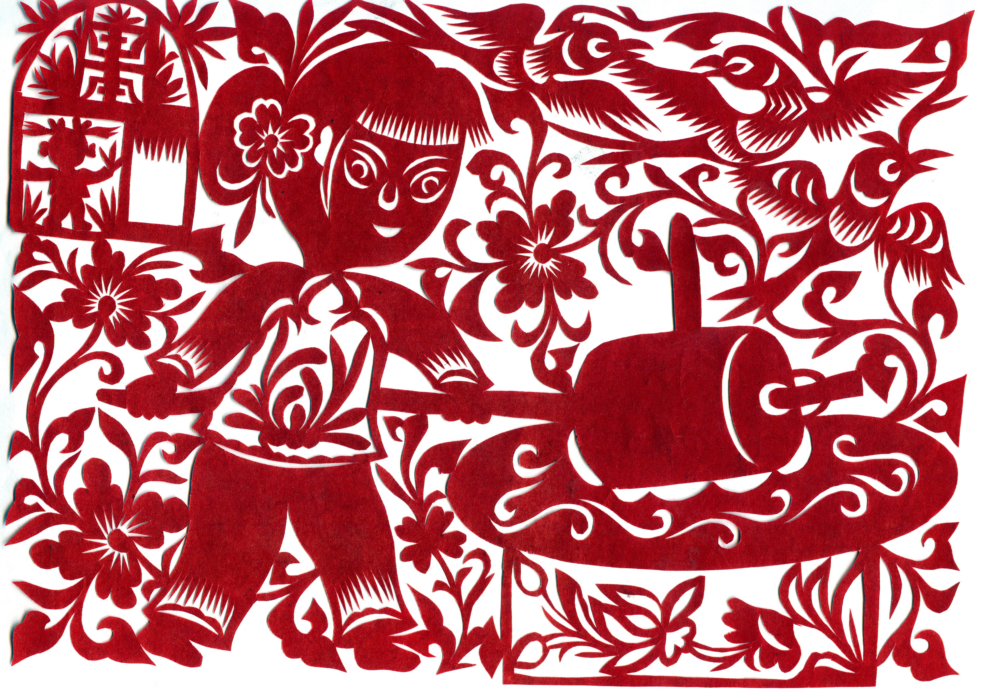 刘晓娟早在七八岁时就开始学习剪纸。母亲是村里剪花的巧人,每到腊月就给村里家家户户剪窗花,刘晓娟看在眼里记在心里,就学着母亲的样子剪了起来。父亲看见了说:“从小不学个好的,就学伺候人的本事。”但刘晓娟就是喜欢剪纸,每年就渴望腊月快点到来,坐在炕头上剪花花别提有多高兴了。因为母亲从不拓样子剪,所以她也就直接冒剪。开始学剪纸都是先学剪花草,慢慢地剪动物,熟练之后再把人物与动物往一起组合。过年的窗花、墙边花、下雨天的扫天媳妇、叫魂看病的剪纸都是她来剪。