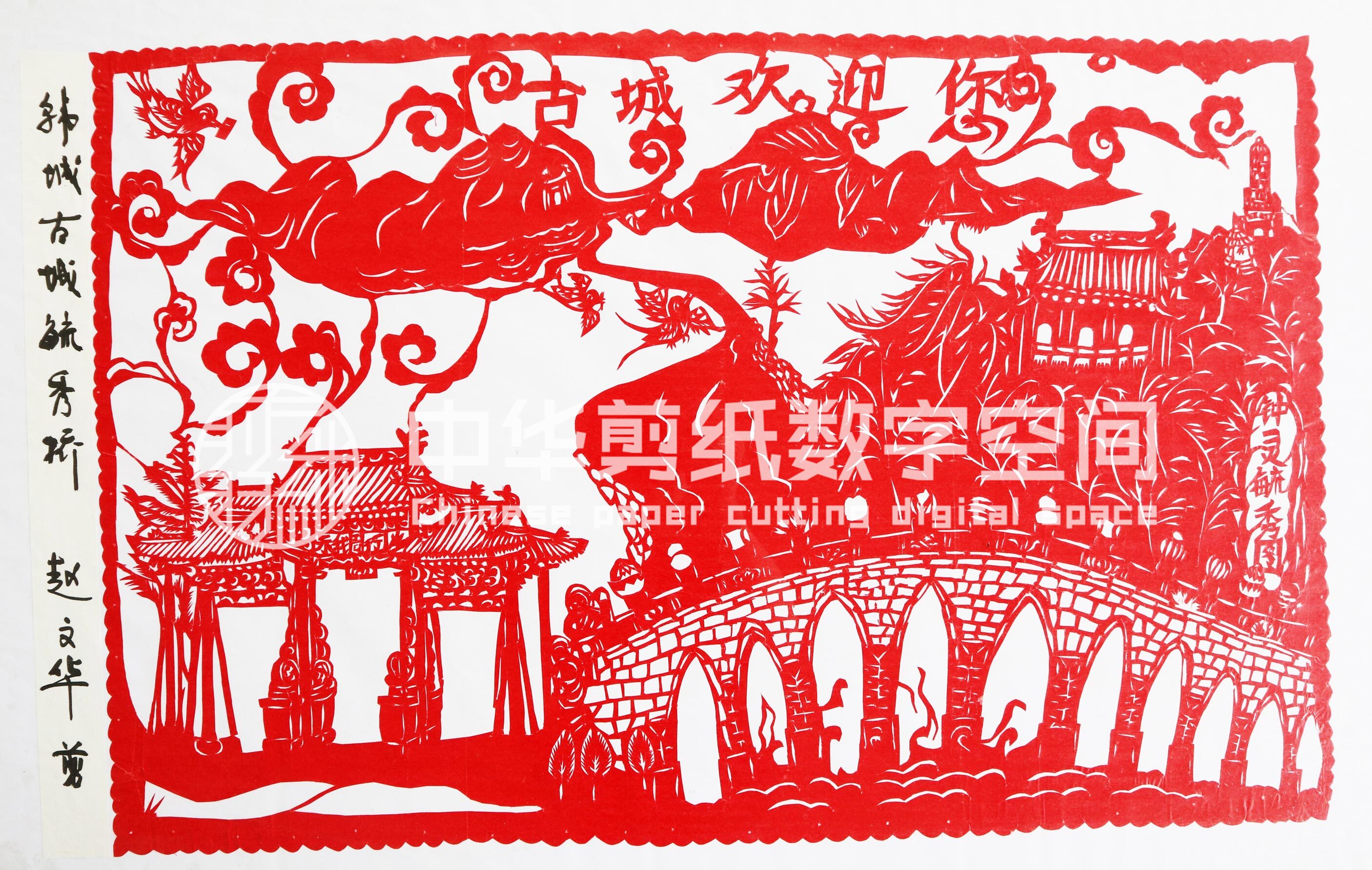 赵文华姊妹4人,她排行老大。上过一年的小学,后来因病停学,在家养病。7、8岁开始学剪一些简单的喜字、燕子、老虎等。开始剪纸是拓样剪的“喜”字。17岁她跟祖母、母亲学习剪纸及其它民间工艺,还帮家里做家务。擅长剪戏曲人物如《三滴血》《火焰驹》等。为了创作新花样,她找人写出时兴的书法字联,再套剪各种花样,创作出花鸟字。过年用的窗花、墙花都是她自己创作。后来把自己创作的窗花进行复剪,腊月跟母亲到集市上卖窗花,以补贴家用。过年时剪的窗花还送给街坊邻居。除了剪纸,赵文花还学会捏面花,婚房布置等。