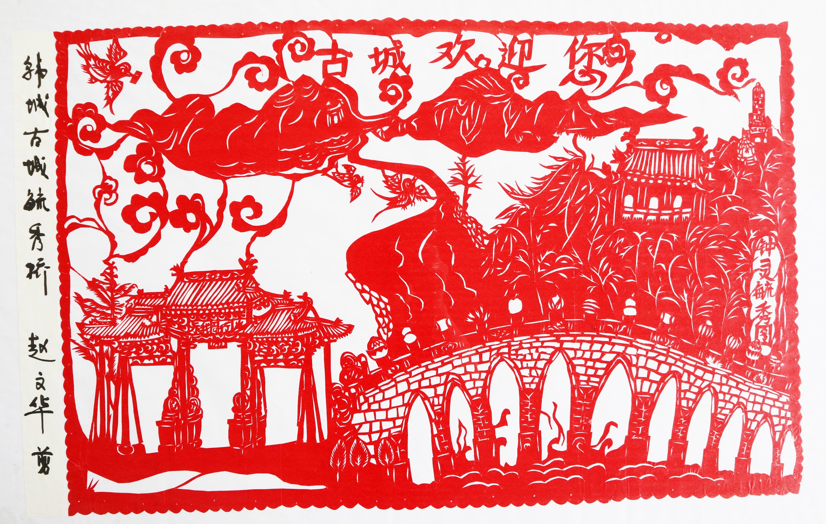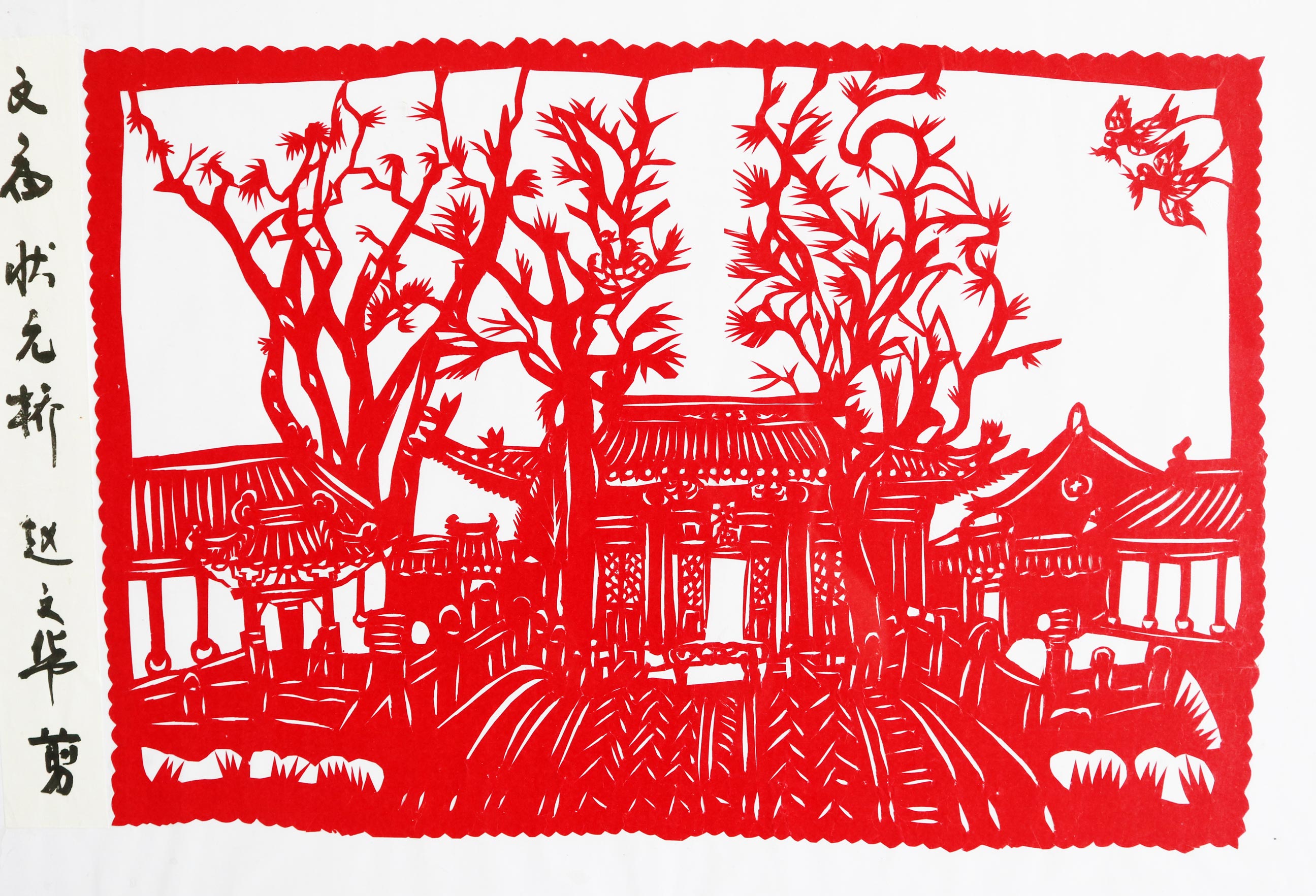 赵文华姊妹4人,她排行老大。上过一年的小学,后来因病停学,在家养病。7、8岁开始学剪一些简单的喜字、燕子、老虎等。开始剪纸是拓样剪的“喜”字。17岁她跟祖母、母亲学习剪纸及其它民间工艺,还帮家里做家务。擅长剪戏曲人物如《三滴血》《火焰驹》等。为了创作新花样,她找人写出时兴的书法字联,再套剪各种花样,创作出花鸟字。过年用的窗花、墙花都是她自己创作。后来把自己创作的窗花进行复剪,腊月跟母亲到集市上卖窗花,以补贴家用。过年时剪的窗花还送给街坊邻居。除了剪纸,赵文花还学会捏面花,婚房布置等。