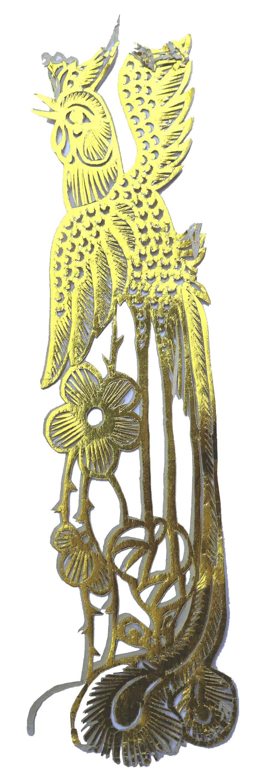 1965年狄忠义结婚,那年他24岁。妻子,农民,没有什么手艺。婚后生育了三个娃,一儿二女。结婚之后开始学着做磨石,37岁时公社磨石厂跨了台,他开始做起了纸扎,同时学油漆匠、画箱柜画。为了生活,村里用啥就剪啥,给村里人结婚布置新房,糊炕围,糊顶棚花,剪角云子。有一年村上说蝎子山上的蝎子精跑了,户户到他家让给剪鸡衔蝎子,一幅一元,当时赚了不少,最后手都剪不动了。2011年腊月25日,那年69岁,在看护村上的机井时,晚上失足跌落涯沟下,腿骨跌坏了。那个冬天的夜晚,四野无人,他爬了一个晚上才爬到了公路边,被人发现送到医院,村上不管不问,他心里凉透了。因为不能干体力活了,儿媳都让他在家歇着。但他总觉得是家里的负担,想为儿媳在经济上多分担些,每天就在家做些丧葬用的金斗银斗、金童玉女。因为手艺好,做工精致,特别是做的金童玉女衣服上的装饰图案全是用剪纸做成,销量特别好,他也很欣慰,说自己是老有所用。