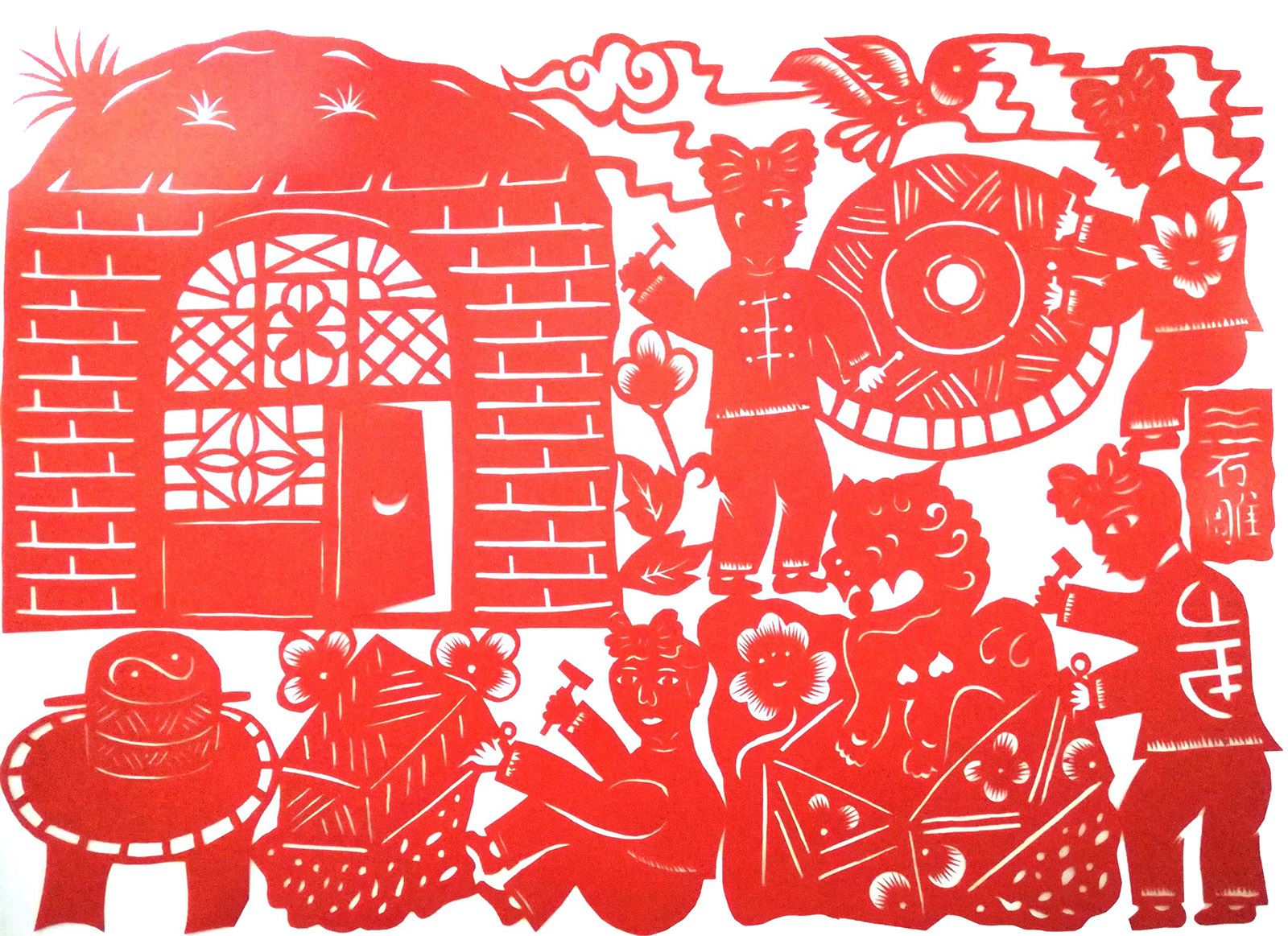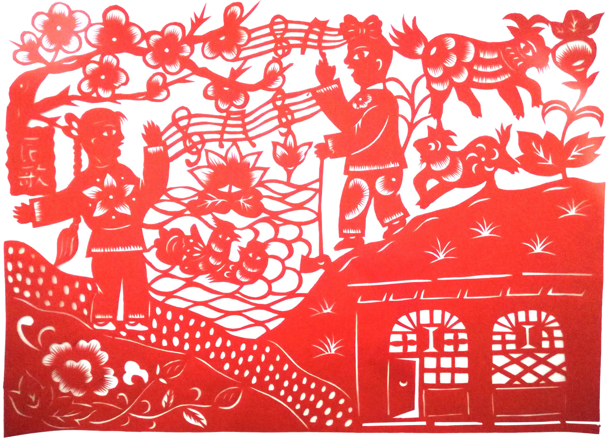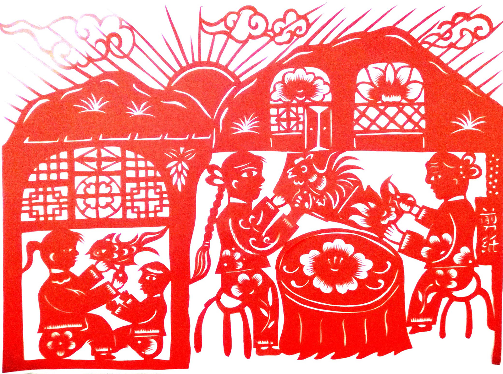 母亲在农闲时会指点她剪制《石榴牡丹》《蝴蝶扑金瓜》《鸡衔鱼》等各种纹样。临近过年时,母亲就从乡镇的商店里买好多彩色纸和年画,这是她最高兴的时候,也是最忙的时候,因为可以发挥自己的特长,和好朋友在一起边哼曲子边剪纸。逢年过节都会有人求母亲剪剪纸,母亲特别忙时总把这些任务交给她来完成,因是拓样剪制,也还是剪的不错,村里的人都夸她是个巧女子,像母亲。每次都会把过年用的炕围花、窗花剪好,再把家里的墙用报纸糊上,用红纸剪成的花边贴到边上,再把窗花贴上,年味儿马上就来了。