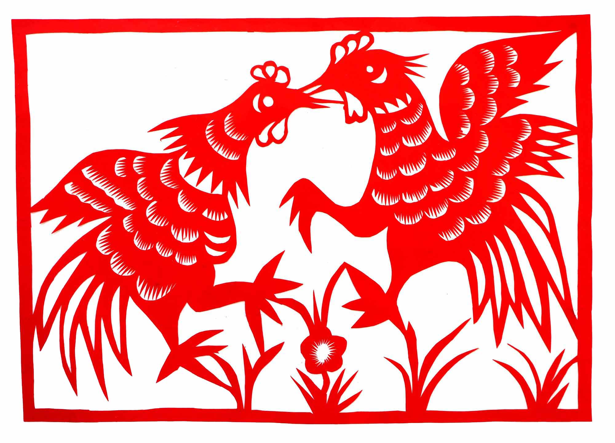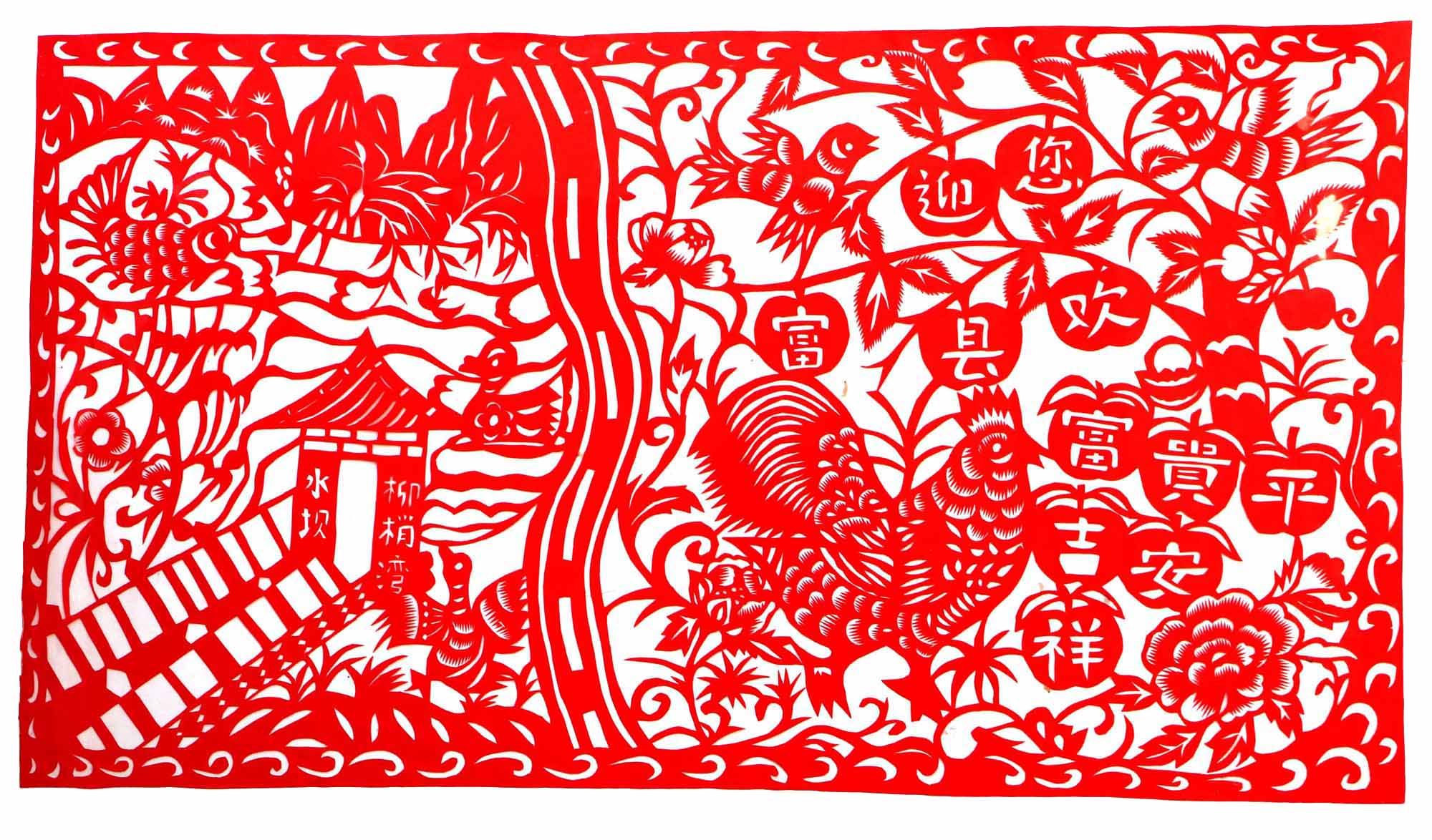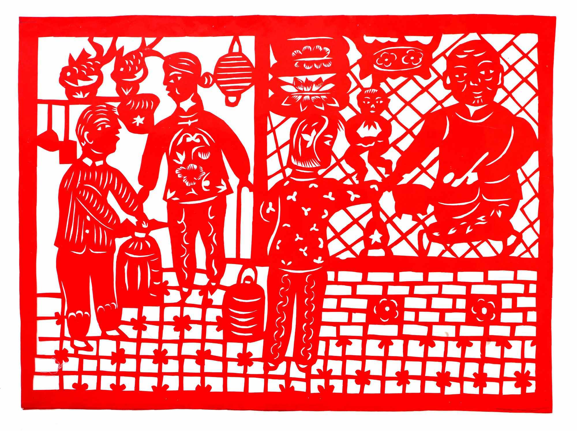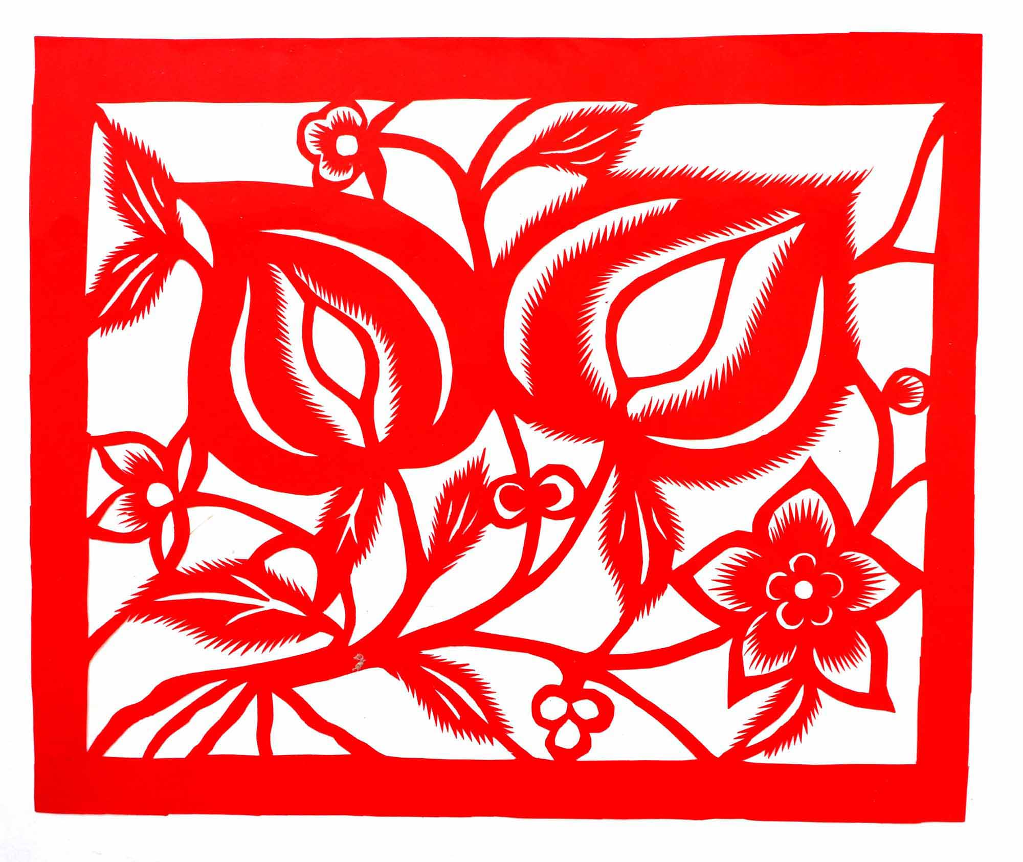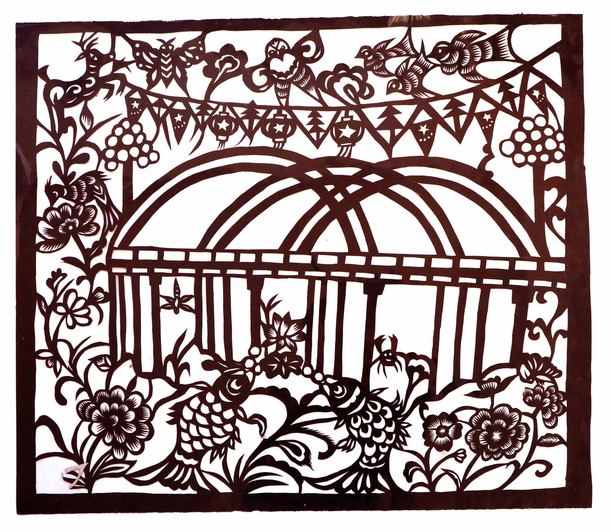 关香玲,女,1972年3月8日生,汉族。外祖母农民,不识字,但能说能唱,能剪窗花,能绣花,织布纺线,做衣做鞋等女红活样样都非常好,担任过多年村妇女主任。母亲陈东花,擅于剪花绣花。家中嫂嫂会剪花,会捏面花,常为白事做彩轿(棺罩)等,在当地很有名。她常跟着嫂子在一块,一到腊月,晚上嫂子剪窗花和板架云子,她就帮忙。嫂子剪花头,她剪枝叶和小花骨朵。富县的窗花多是对花形式,制作对花相当费事,当时家里都是大窑洞,有4个大窗子,需要窗花很多,还要熏制碗架云子,剪制碗架对子,用量较大。嫂子白天劳动,晚上剪纸,不但给自己剪,还要给娘家和亲戚剪,任务很重。经过几年的训练,关香玲就不需要样子了,拿出剪刀就能冒剪。