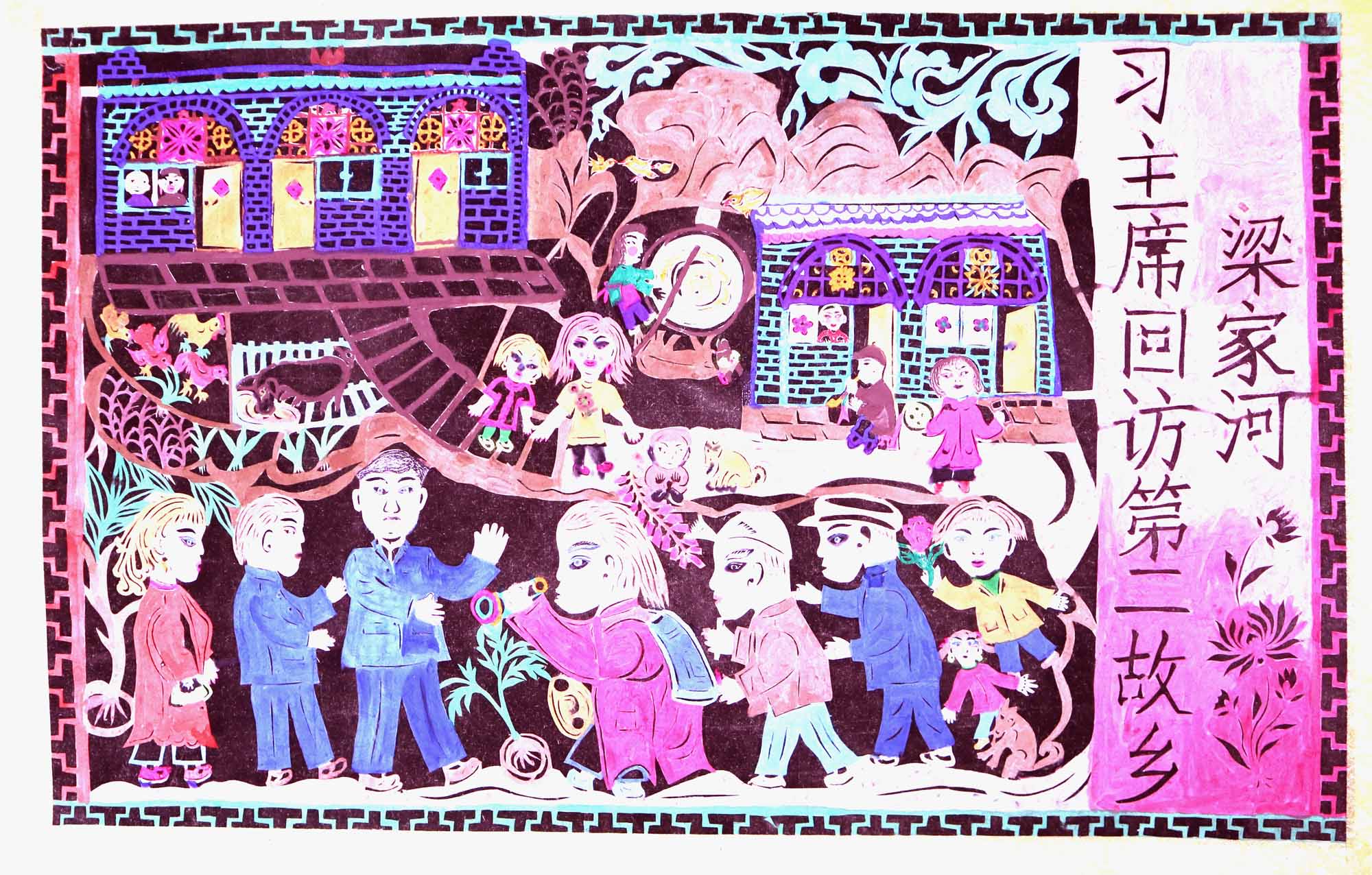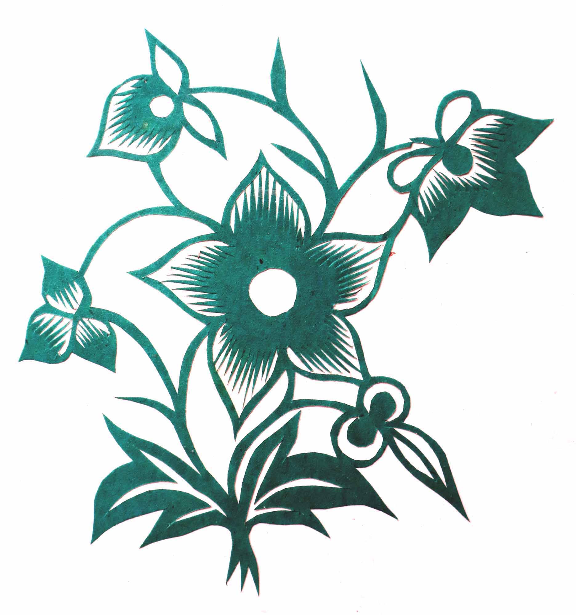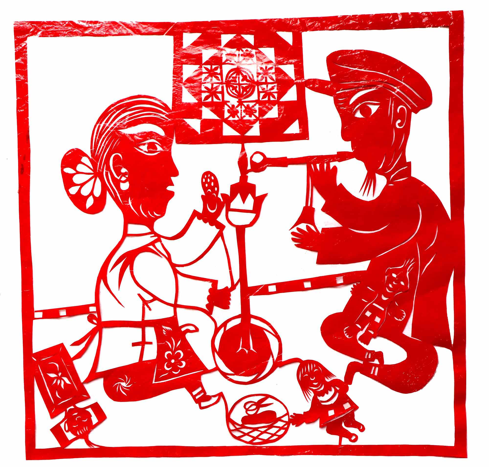 袁喜娥,女,1952年5月25日生,汉族,不识字,农民。外祖母,不擅于剪花绣花,但针线活、茶饭做得好。袁喜娥从小看见别人剪花绣花特别喜爱,但当时不敢学。出嫁后开始学剪窗花,学绣鞋垫,做碗架云子。这些样子都是平时注意看别人剪的窗花和对花,回到家里再想着剪出来。自从用剪纸装饰了家之后,村上人都知道她会剪会画,全村人都找她剪窗花、做板架云子。每到过年时,白天晚上给村里人剪纸,顾不上做饭,就让丈夫自己做饭吃,丈夫也没有怨言。听人家说生母擅于剪,擅于绣,手特别的巧,知道她的人都说她随了母亲。