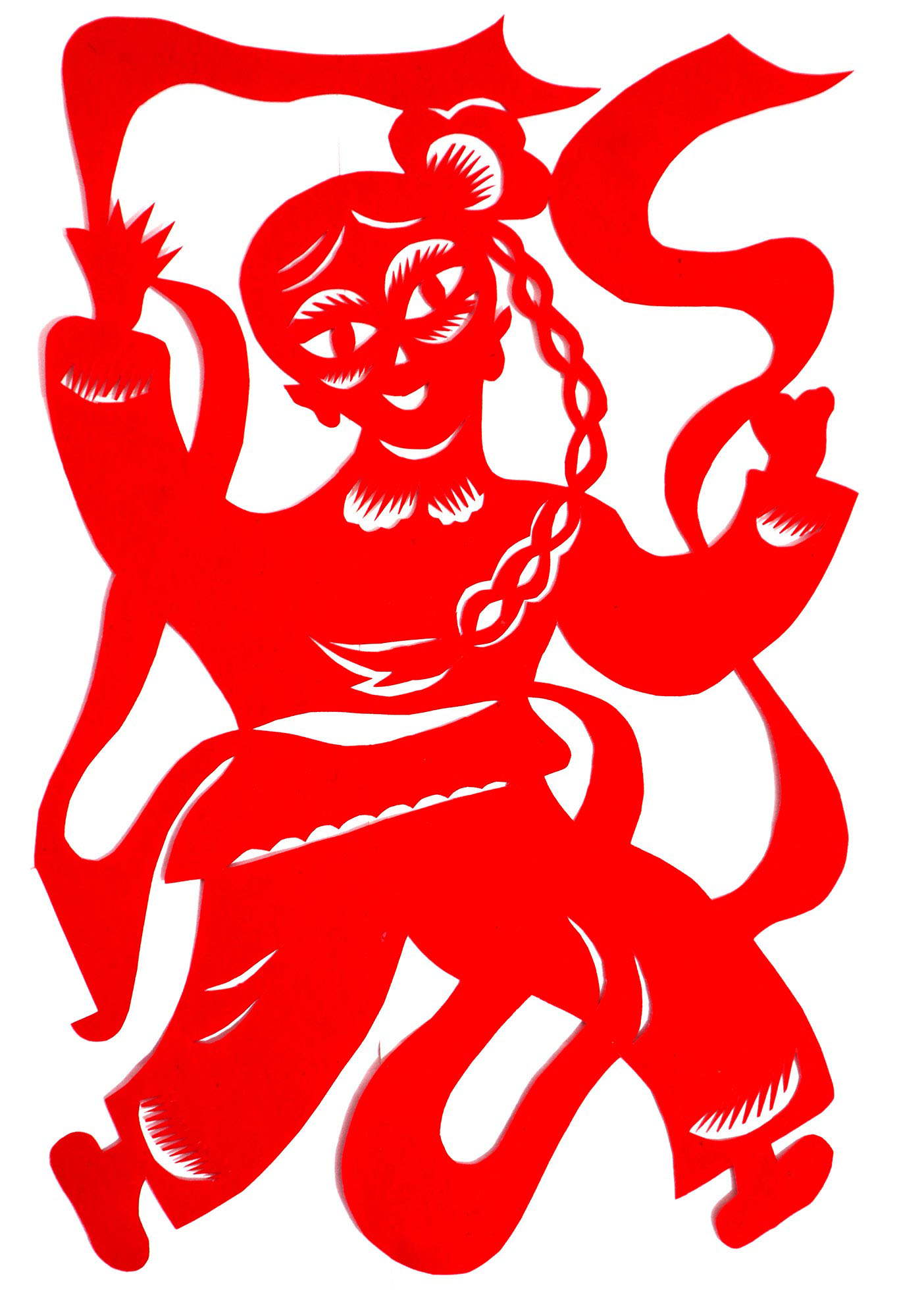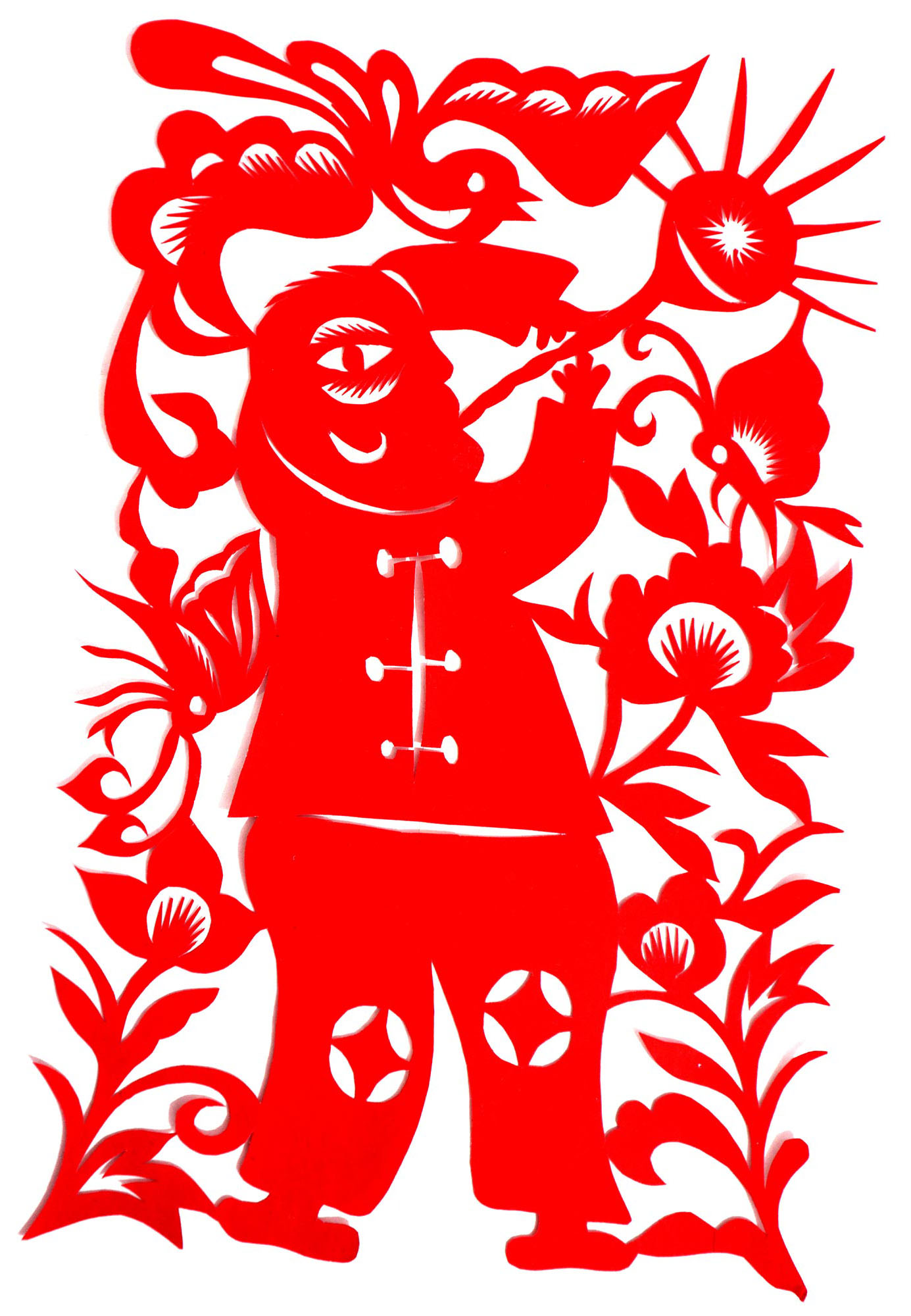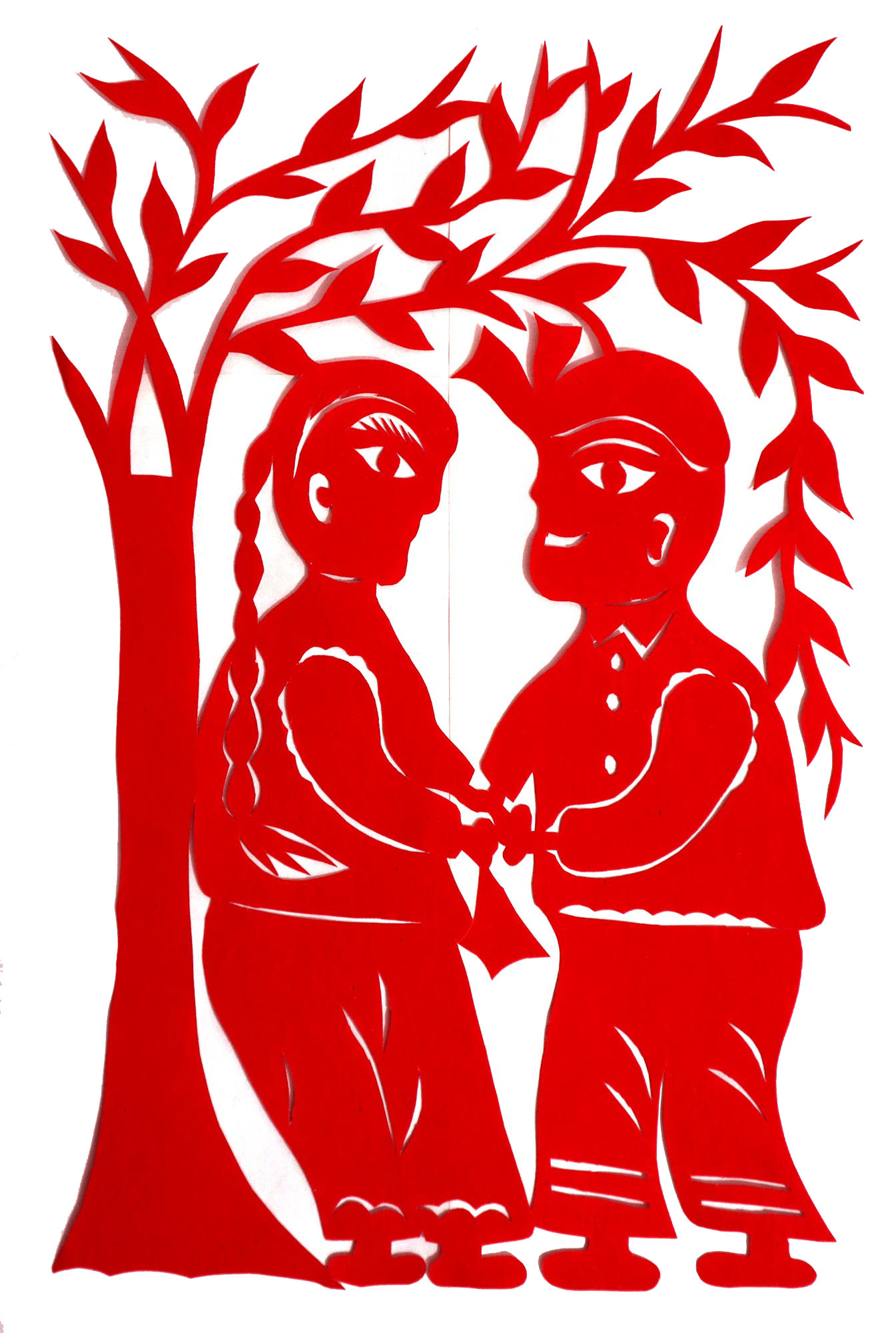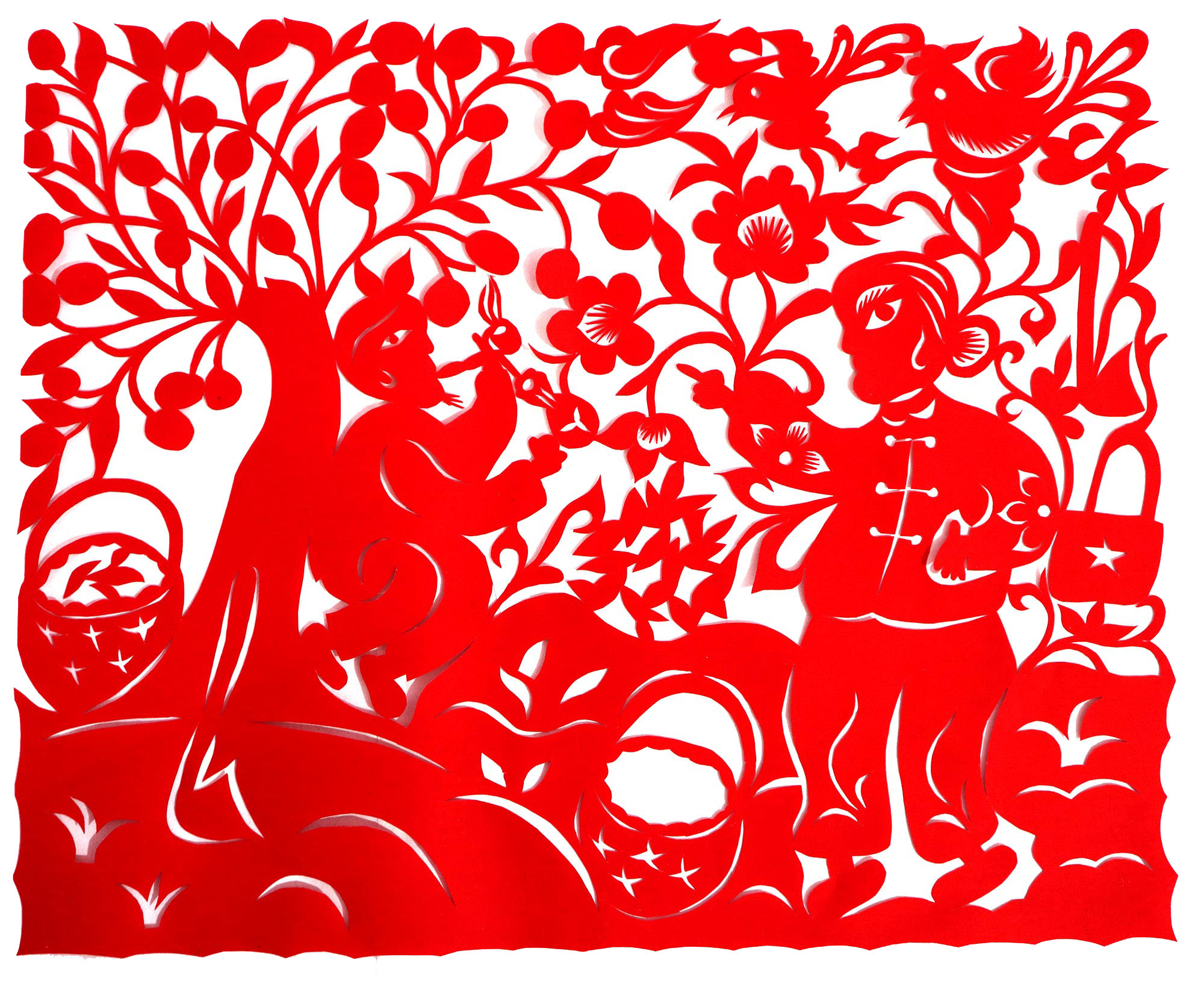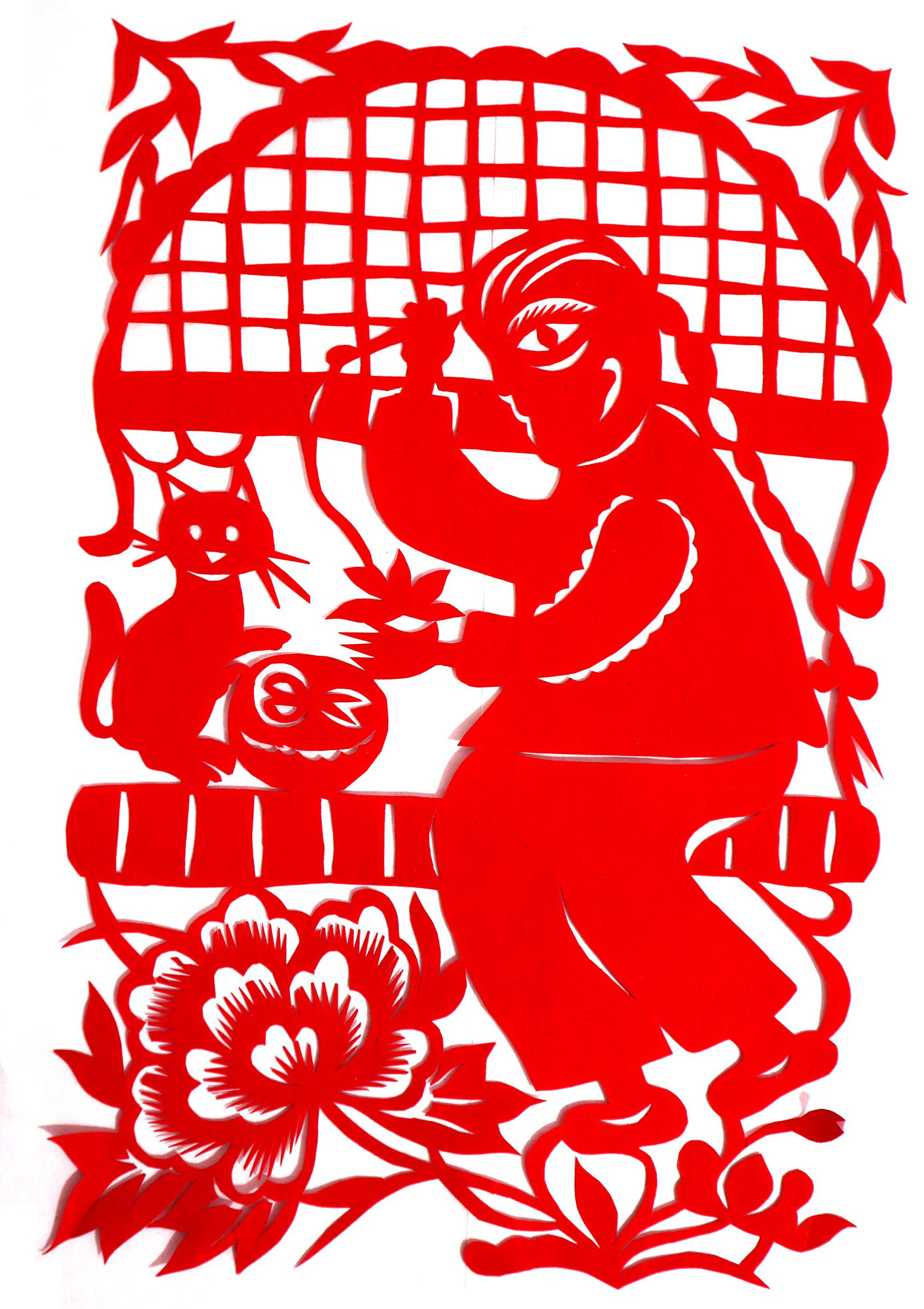 因母亲喜欢剪纸、绣花,母亲剪花时她就喜欢看,跟上瞎剪。后来就照着母亲剪的样子画,画出来再剪。12岁时,冯飞琴学会了剪窗花,之后,母亲就把每年剪窗花贴窗花的任务交给了她。由于她喜欢剪花,剪的再多也不知道累,除自己家用外,还常帮村里人剪窗花。1999年,北京来了个中央美术学院的靳之林教授,在乾坤湾写生,住在小程村,晚上靳老师组织村上的妇女剪纸,并进行剪纸培训。冯飞琴知道后想去参加,但由于晚上要照看弟妹,又年龄小没敢去,就在家里剪团花,剪出的团花也不敢让靳老师看。后来她家来了个在延川挂职锻炼的安徽省合肥市群众艺术馆的周路老师。她便取出自己剪的团花,让周路老师指点,并得到认可,进而增强了学习剪纸的信心。后来创作的团花还被收录在周路主编的《团花世界》一书之中。2007年,冯飞琴出嫁,刚结婚那几年,丈夫不支持她剪纸,嫌她剪纸耽误照看孩子,又嫌她剪纸把家里弄得满地纸屑。后来娃娃大了,丈夫也不反对了,还特别支持她出去参加县上组织的剪纸活动。2017年,冯飞琴参加了县上举办的剪纸培训班,并加入了高秀芳剪纸布堆画合作社,开始了有目的的剪纸创作。其中,《红星闪耀》在延安展出,《退耕还林》在刘家山村委会展出,创作的裹肚、旗袍在延川县展出。