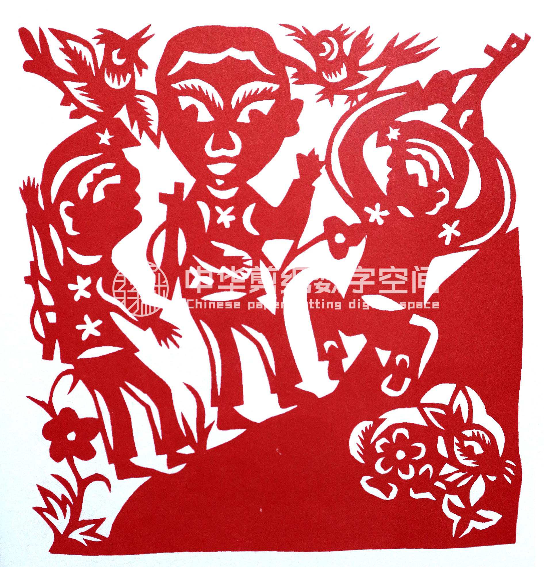 贺彩虹从小跟上姐姐一块剪窗花,帮村里人剪喜花,初学剪纸还是受母亲和姐姐的影响大些。开始就是冒画冒剪,剪花草动物,如《鱼戏莲》《老虎》等。逢年过节时与姐姐剪一些窗花,除自己家用外,还送给村人。1989年,贺彩虹出嫁,丈夫程国武对妻子剪纸活动非常支持。2001年,靳之林老师在小程村写生,晚上靳老师住在窑洞里,村民都围在靳老师周围,听大家唱民歌,靳老师听了贺彩虹的民歌后很高兴,就让她一边唱民歌一边剪纸。回家后她剪了一幅《梁山伯与祝英台》,第二天让靳老师看,靳老师看后特别高兴,说:“民歌就是剪纸,剪纸就是生活,”鼓励她一边剪一边唱,这样剪出的剪纸就有感情,就感动人。之后县上办的剪纸培训班以及省市的剪纸活动,贺彩虹基本都会参加。培训班期间,老姨高凤莲,姑姑刘洁琼都参加。高凤莲和刘洁琼都是剪纸大师,经过老姨的指导剪纸提高得很快。婚后因丈夫有了病,家务活农活比较忙,生活压力大,心里有不少的烦恼,但干完农活,一边唱歌,一边在灯下剪纸,能忘记一天的烦恼和解除一天的劳累,就这样创作出不少民歌作品。