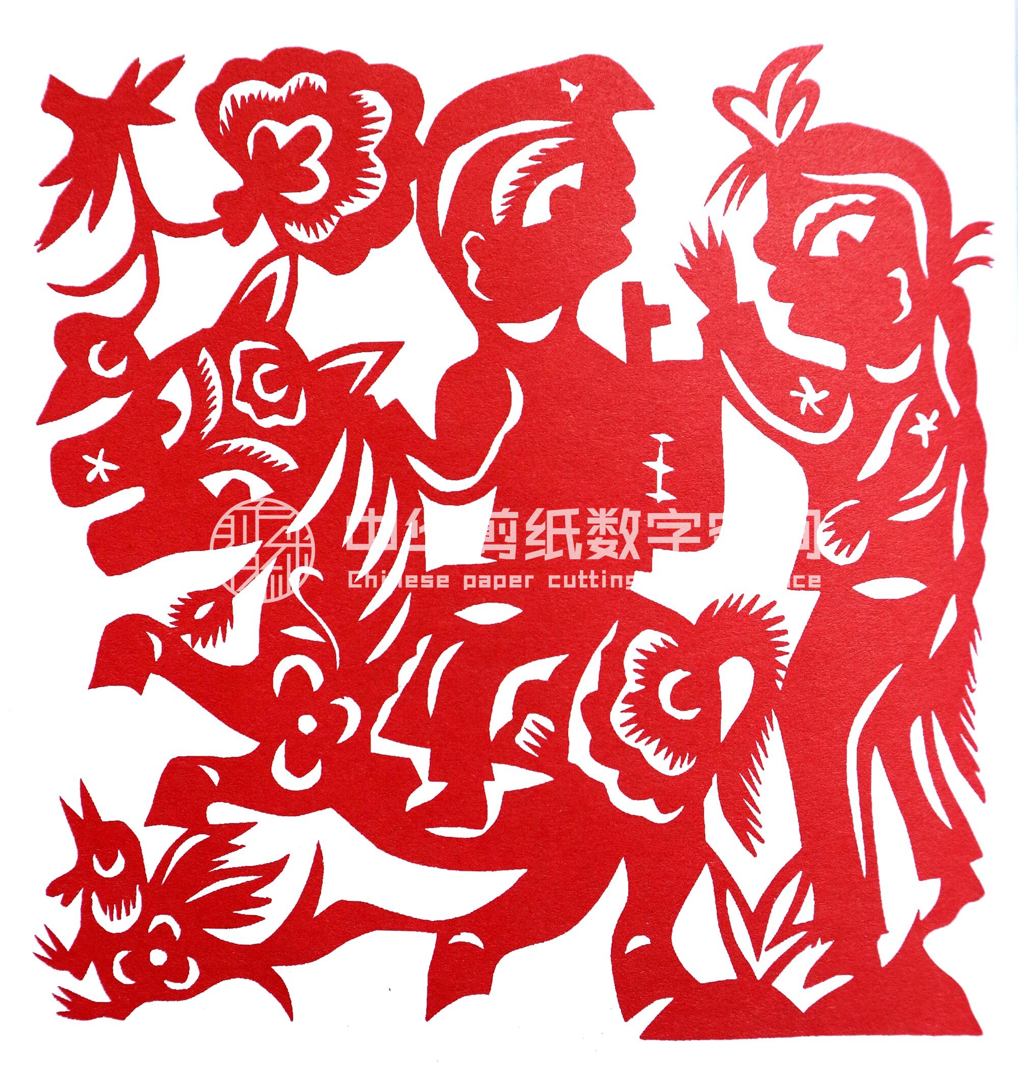 贺彩虹从小跟上姐姐一块剪窗花,帮村里人剪喜花,初学剪纸还是受母亲和姐姐的影响大些。开始就是冒画冒剪,剪花草动物,如《鱼戏莲》《老虎》等。逢年过节时与姐姐剪一些窗花,除自己家用外,还送给村人。1989年,贺彩虹出嫁,丈夫程国武对妻子剪纸活动非常支持。2001年,靳之林老师在小程村写生,晚上靳老师住在窑洞里,村民都围在靳老师周围,听大家唱民歌,靳老师听了贺彩虹的民歌后很高兴,就让她一边唱民歌一边剪纸。回家后她剪了一幅《梁山伯与祝英台》,第二天让靳老师看,靳老师看后特别高兴,说:“民歌就是剪纸,剪纸就是生活,”鼓励她一边剪一边唱,这样剪出的剪纸就有感情,就感动人。之后县上办的剪纸培训班以及省市的剪纸活动,贺彩虹基本都会参加。培训班期间,老姨高凤莲,姑姑刘洁琼都参加。高凤莲和刘洁琼都是剪纸大师,经过老姨的指导剪纸提高得很快。婚后因丈夫有了病,家务活农活比较忙,生活压力大,心里有不少的烦恼,但干完农活,一边唱歌,一边在灯下剪纸,能忘记一天的烦恼和解除一天的劳累,就这样创作出不少民歌作品。