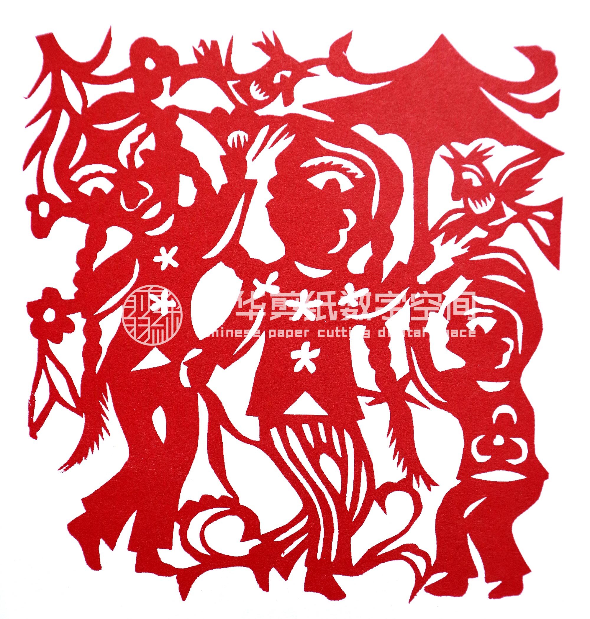贺彩虹从小跟上姐姐一块剪窗花,帮村里人剪喜花,初学剪纸还是受母亲和姐姐的影响大些。开始就是冒画冒剪,剪花草动物,如《鱼戏莲》《老虎》等。逢年过节时与姐姐剪一些窗花,除自己家用外,还送给村人。1989年,贺彩虹出嫁,丈夫程国武对妻子剪纸活动非常支持。2001年,靳之林老师在小程村写生,晚上靳老师住在窑洞里,村民都围在靳老师周围,听大家唱民歌,靳老师听了贺彩虹的民歌后很高兴,就让她一边唱民歌一边剪纸。回家后她剪了一幅《梁山伯与祝英台》,第二天让靳老师看,靳老师看后特别高兴,说:“民歌就是剪纸,剪纸就是生活,”鼓励她一边剪一边唱,这样剪出的剪纸就有感情,就感动人。之后县上办的剪纸培训班以及省市的剪纸活动,贺彩虹基本都会参加。培训班期间,老姨高凤莲,姑姑刘洁琼都参加。高凤莲和刘洁琼都是剪纸大师,经过老姨的指导剪纸提高得很快。婚后因丈夫有了病,家务活农活比较忙,生活压力大,心里有不少的烦恼,但干完农活,一边唱歌,一边在灯下剪纸,能忘记一天的烦恼和解除一天的劳累,就这样创作出不少民歌作品。