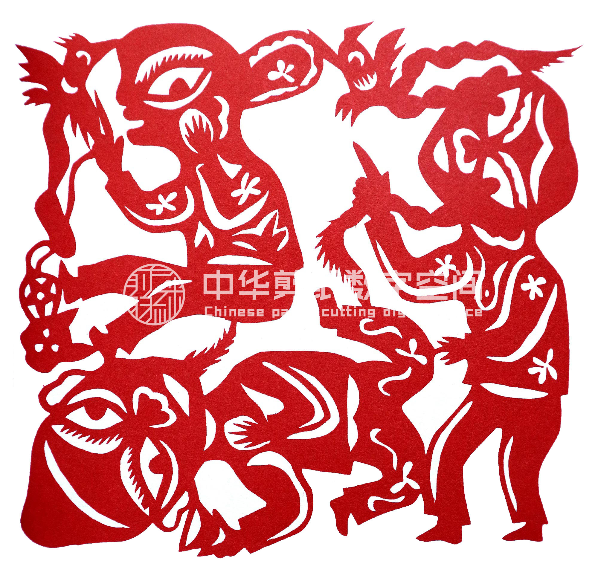 贺彩虹从小跟上姐姐一块剪窗花,帮村里人剪喜花,初学剪纸还是受母亲和姐姐的影响大些。开始就是冒画冒剪,剪花草动物,如《鱼戏莲》《老虎》等。逢年过节时与姐姐剪一些窗花,除自己家用外,还送给村人。1989年,贺彩虹出嫁,丈夫程国武对妻子剪纸活动非常支持。2001年,靳之林老师在小程村写生,晚上靳老师住在窑洞里,村民都围在靳老师周围,听大家唱民歌,靳老师听了贺彩虹的民歌后很高兴,就让她一边唱民歌一边剪纸。回家后她剪了一幅《梁山伯与祝英台》,第二天让靳老师看,靳老师看后特别高兴,说:“民歌就是剪纸,剪纸就是生活,”鼓励她一边剪一边唱,这样剪出的剪纸就有感情,就感动人。之后县上办的剪纸培训班以及省市的剪纸活动,贺彩虹基本都会参加。培训班期间,老姨高凤莲,姑姑刘洁琼都参加。高凤莲和刘洁琼都是剪纸大师,经过老姨的指导剪纸提高得很快。婚后因丈夫有了病,家务活农活比较忙,生活压力大,心里有不少的烦恼,但干完农活,一边唱歌,一边在灯下剪纸,能忘记一天的烦恼和解除一天的劳累,就这样创作出不少民歌作品。