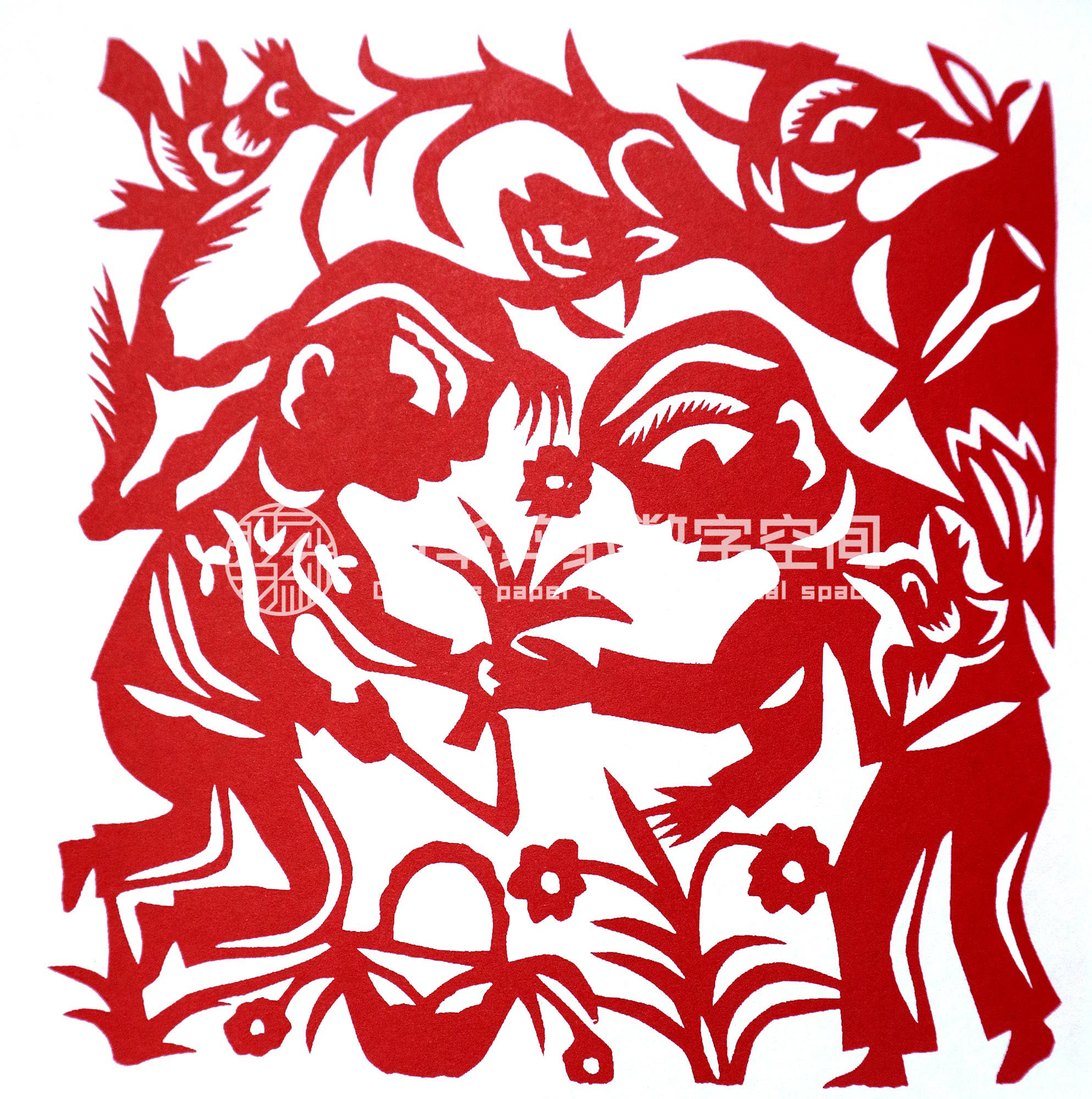贺彩虹从小跟上姐姐一块剪窗花,帮村里人剪喜花,初学剪纸还是受母亲和姐姐的影响大些。开始就是冒画冒剪,剪花草动物,如《鱼戏莲》《老虎》等。逢年过节时与姐姐剪一些窗花,除自己家用外,还送给村人。1989年,贺彩虹出嫁,丈夫程国武对妻子剪纸活动非常支持。2001年,靳之林老师在小程村写生,晚上靳老师住在窑洞里,村民都围在靳老师周围,听大家唱民歌,靳老师听了贺彩虹的民歌后很高兴,就让她一边唱民歌一边剪纸。回家后她剪了一幅《梁山伯与祝英台》,第二天让靳老师看,靳老师看后特别高兴,说:“民歌就是剪纸,剪纸就是生活,”鼓励她一边剪一边唱,这样剪出的剪纸就有感情,就感动人。之后县上办的剪纸培训班以及省市的剪纸活动,贺彩虹基本都会参加。培训班期间,老姨高凤莲,姑姑刘洁琼都参加。高凤莲和刘洁琼都是剪纸大师,经过老姨的指导剪纸提高得很快。婚后因丈夫有了病,家务活农活比较忙,生活压力大,心里有不少的烦恼,但干完农活,一边唱歌,一边在灯下剪纸,能忘记一天的烦恼和解除一天的劳累,就这样创作出不少民歌作品。