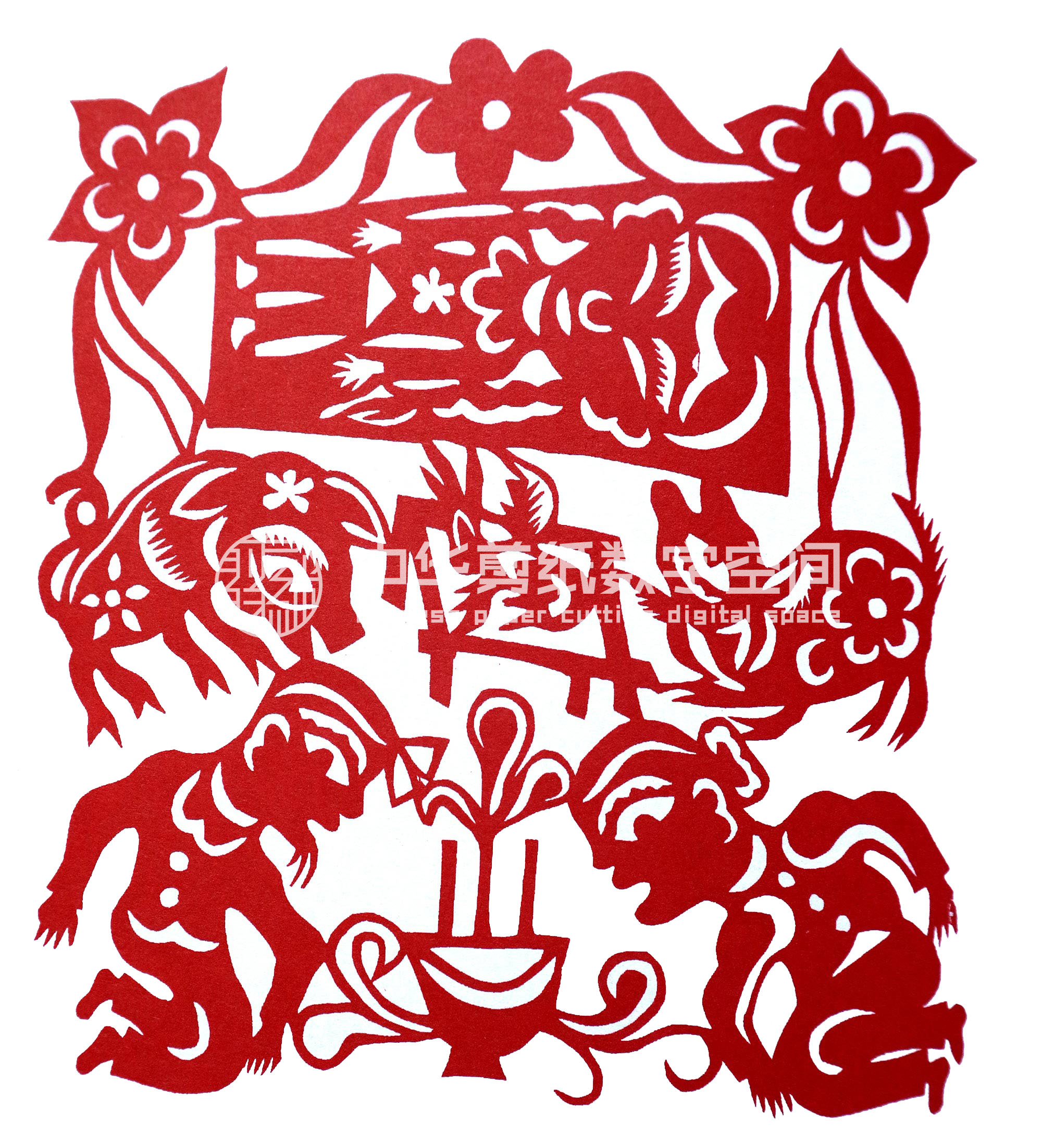 贺彩虹从小跟上姐姐一块剪窗花,帮村里人剪喜花,初学剪纸还是受母亲和姐姐的影响大些。开始就是冒画冒剪,剪花草动物,如《鱼戏莲》《老虎》等。逢年过节时与姐姐剪一些窗花,除自己家用外,还送给村人。1989年,贺彩虹出嫁,丈夫程国武对妻子剪纸活动非常支持。2001年,靳之林老师在小程村写生,晚上靳老师住在窑洞里,村民都围在靳老师周围,听大家唱民歌,靳老师听了贺彩虹的民歌后很高兴,就让她一边唱民歌一边剪纸。回家后她剪了一幅《梁山伯与祝英台》,第二天让靳老师看,靳老师看后特别高兴,说:“民歌就是剪纸,剪纸就是生活,”鼓励她一边剪一边唱,这样剪出的剪纸就有感情,就感动人。之后县上办的剪纸培训班以及省市的剪纸活动,贺彩虹基本都会参加。培训班期间,老姨高凤莲,姑姑刘洁琼都参加。高凤莲和刘洁琼都是剪纸大师,经过老姨的指导剪纸提高得很快。婚后因丈夫有了病,家务活农活比较忙,生活压力大,心里有不少的烦恼,但干完农活,一边唱歌,一边在灯下剪纸,能忘记一天的烦恼和解除一天的劳累,就这样创作出不少民歌作品。