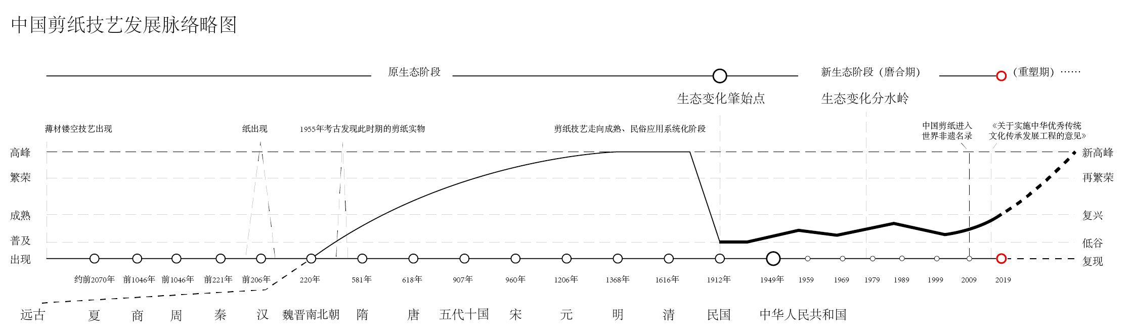 文中所示的“中国剪纸技艺发展脉络图”(参看图例),是在许多学者对中国剪纸技艺发展过程研究以及当代田野探访成果基础上的一个综合体现,是对中国剪纸技艺千百年来发展脉络的一个简略图示,它不是一个精准严格的结构,是为直观呈现剪纸技艺发展过程中民众参与、用途范围、品类数量、技艺水平等方面变迁而描绘的一个笼统的综合信息轨迹,用以说明中国的剪纸技艺发展历史的悠久,尤其是在刚刚过去的一百多年间(图表中粗线条实线部分),剪纸技艺在各种时代波澜中,盛极而衰,不断跌宕流变,直至今日仍然是有着众多参与者、被文化艺术领域长期关注的技艺品种。这个脉络图也直观地显示了中国剪纸从原生态转入新生态过程中所历经的曲折,同时也侧面地呈现了中国剪纸艺术生命力之顽强。 从脉络图中可以看到,原生态阶段,剪纸技艺呈稳定且持续向上的发展过程,这是由中国社会长期处在相对稳定的农耕文明状态所致,这种稳定成就了包括剪纸技艺在内的中国其他许多民间手工技艺从萌芽走向高峰。现如今,在城镇化不断推进的过程中,农耕文明已经成为了不可逆转的过去,孕育和承载着剪纸技艺的文化原生态一去不复返了。经济的高速发展,在对经济利益片面追逐的情况下,又一度影响了剪纸艺术生长的向上趋势。但经济的进一步发展,生活条件逐渐优渥之时,加之文化政策的导向,文化领域的呼吁,互联网时代带来的全球视野被打开之后,反而的,对古老文明的怀恋之情日渐复现,具有新时代气息的新剪纸样式不断涌现的同时,对传统剪纸的回溯以及致敬式作品不断产出,一个新的生态阶段正在被越来越清晰地勾勒出来。由社会转型所引发的新生态逐渐建构过程中,剪纸技艺在低谷区徘徊良久,虽然没有触碰底线,但其挣扎的态势非常明显。