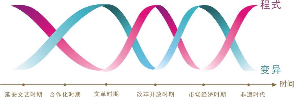“程式”与“变异”是民间剪纸艺术的两个基本特征。清末以前中国传统民间剪纸以“程式”特征为主,维持了民间剪纸艺术发展的相对稳定性。但近百年中国民间剪纸艺术“程式”与“变异”特征的博弈性加剧,既有变异引起的高潮,也变异带来的低谷,更有程式回归后的高峰。从前文阐述可知,延安革命文艺时期和新中国手工业合作化时期是变异特征推动民间剪纸艺术发展的两次高潮。前者以西方木刻版画艺术为民间剪纸注入活力,衍生出木刻窗花艺术;后者以现实主义题材为民间剪纸发展注入发展因子,推动中国传统民间剪纸呈现写实性倾向。相反,“文革”时期民间剪纸艺术的变异将传统民间剪纸推至低谷。市场经济时期,传统民间剪纸艺术在经济利诱下整体呈现衰微之势。在民间剪纸进入低谷或衰微之时,程式特征回归又引领民间剪纸重现高峰,形成20世纪80年代传统民间剪纸艺术的复兴和当下非遗剪纸保护的热潮。可见,百年嬗变过程正是“程式”与“变异”的博弈过程。(图6-1)当变异占上风时,不仅民间剪纸图像呈现强烈的绘画性,而且民间剪纸题材具有强烈的现实性。但变异既能为民间剪纸发展注入活力而推动其发展兴盛,也能使民间剪纸发展跌入低谷或陷入困境。因而变异应有度。当程式占上风时,民间剪纸主题与图像范式就显现传统之势。但程式的时代语境已变,它需要寻找到自身存在的价值空间(如非遗剪纸),否则程式也应有变。